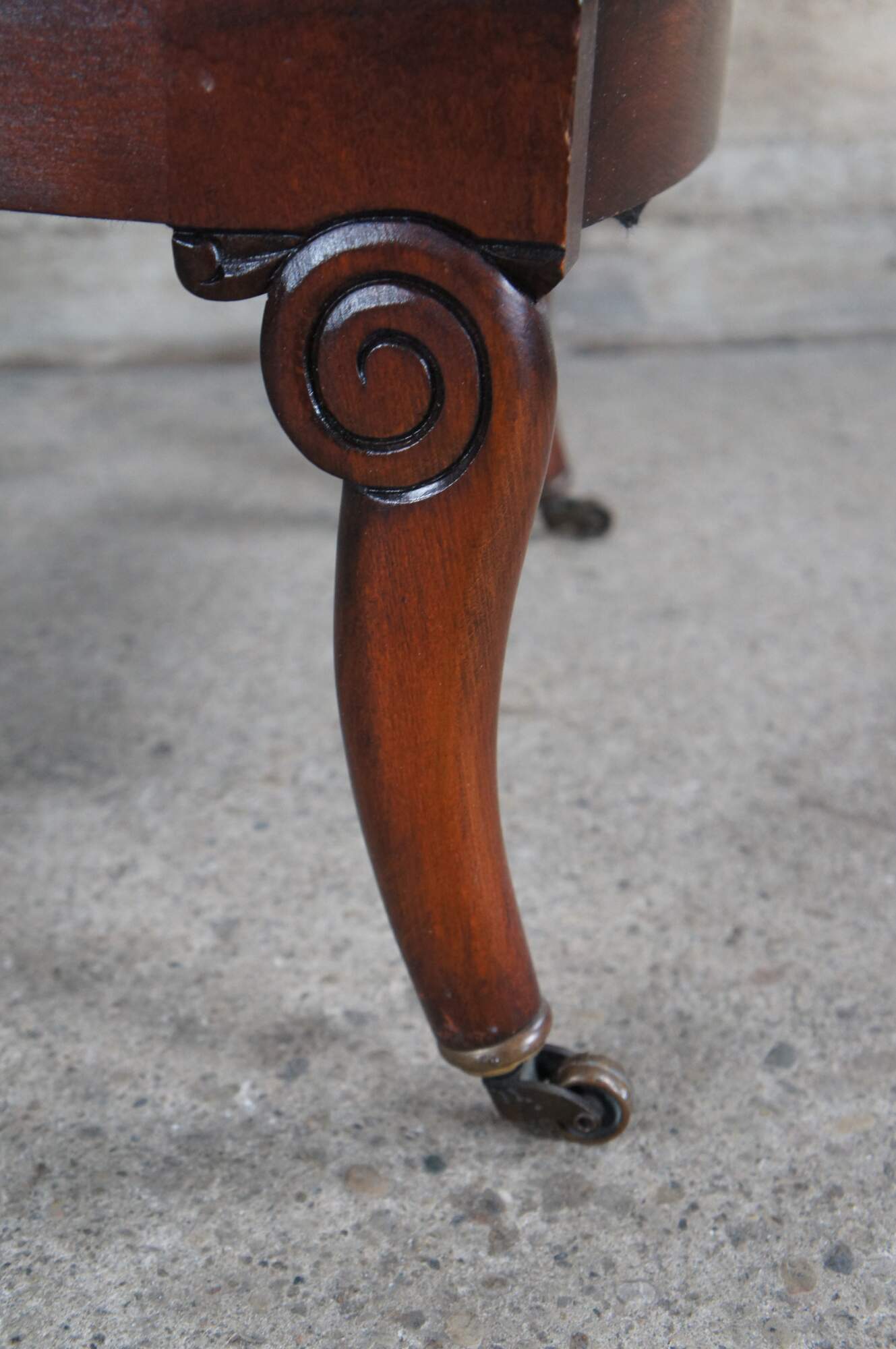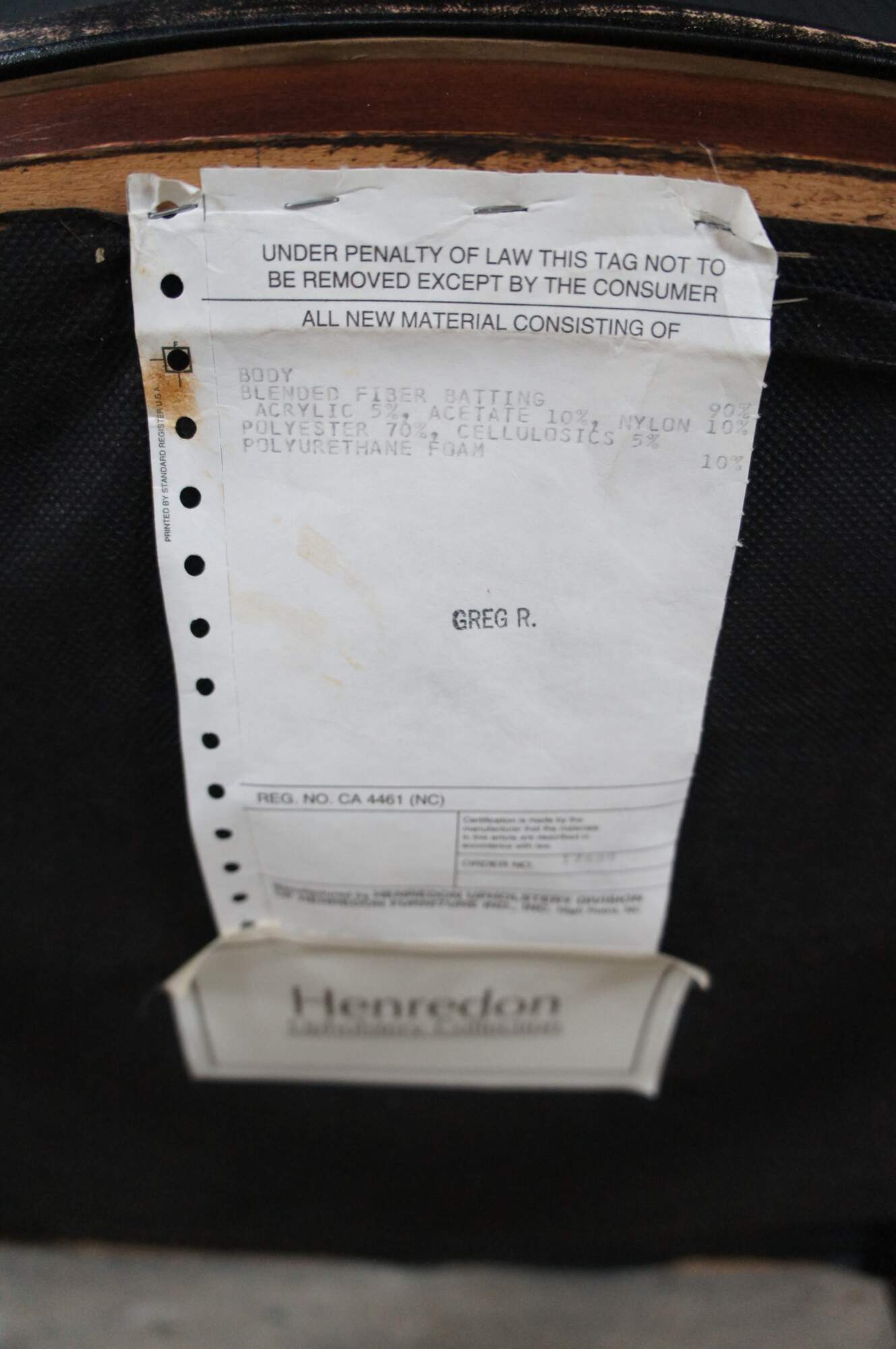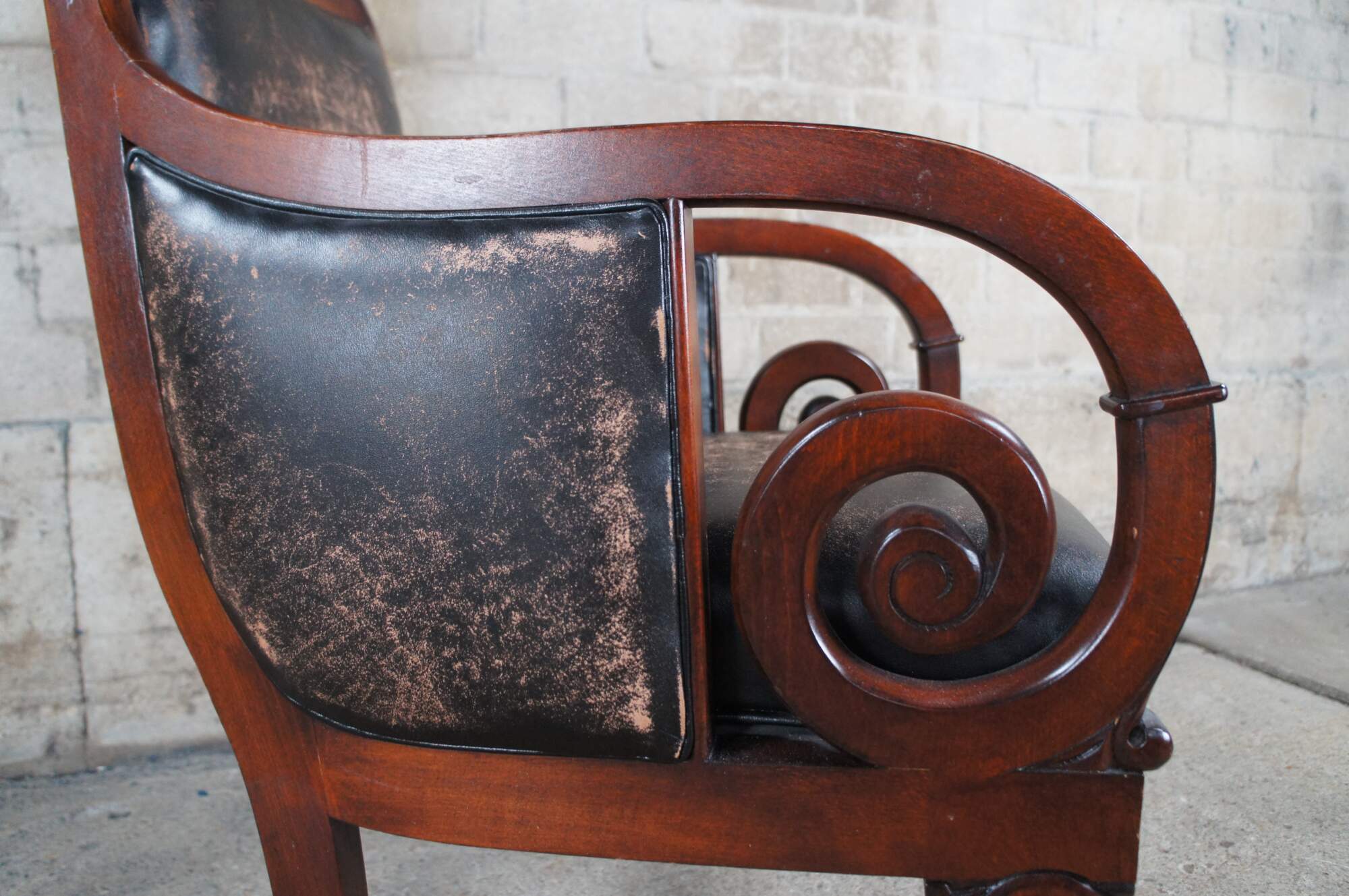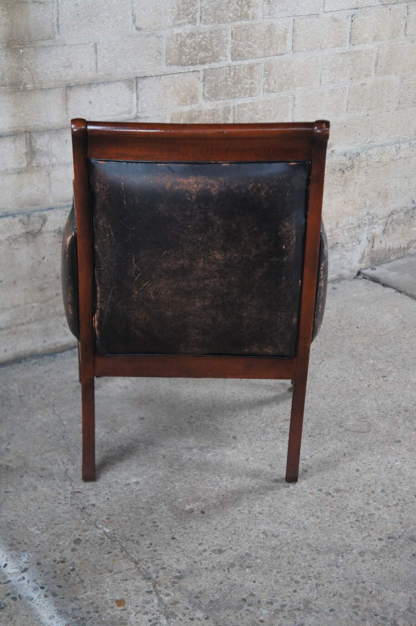 Rare vintage Henredon Furniture Jockey club / lounge / library / office elbow arm chair. Made of mahogany featuring Empire / Regency styling with scrolled arms and distressed leather upholstery.