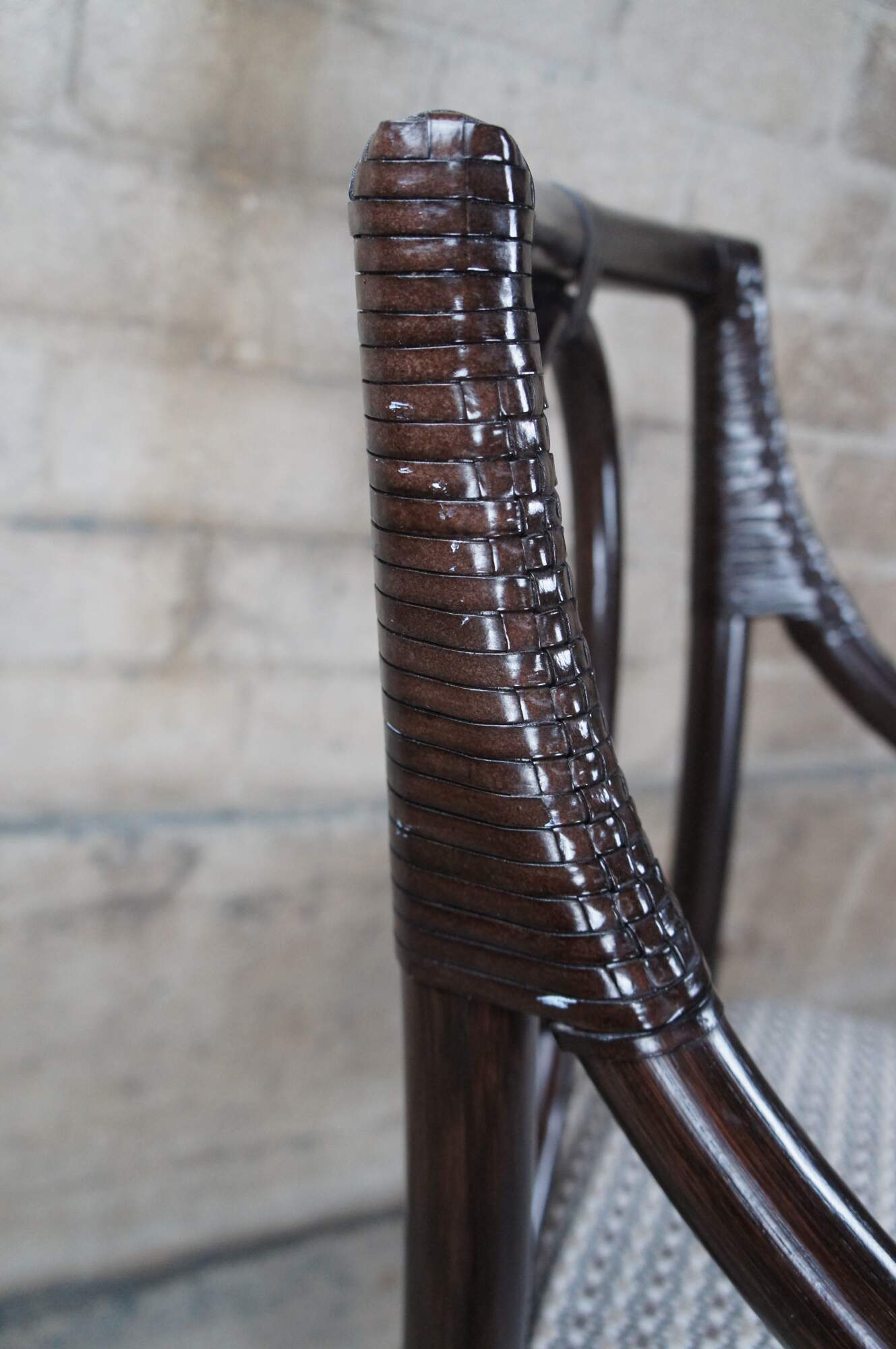 Vintage McGuire organic modern breakfast / dining / card / game arm chairs. Made of tubular bamboo and rattan construction featuring a sinuous looped back splat and sloped arms with dark finish.