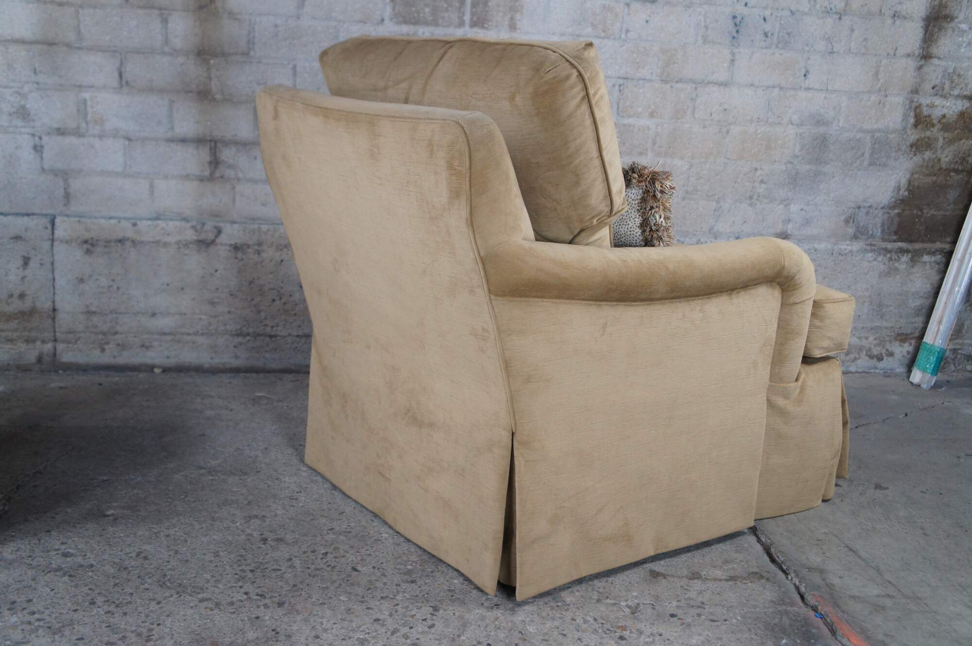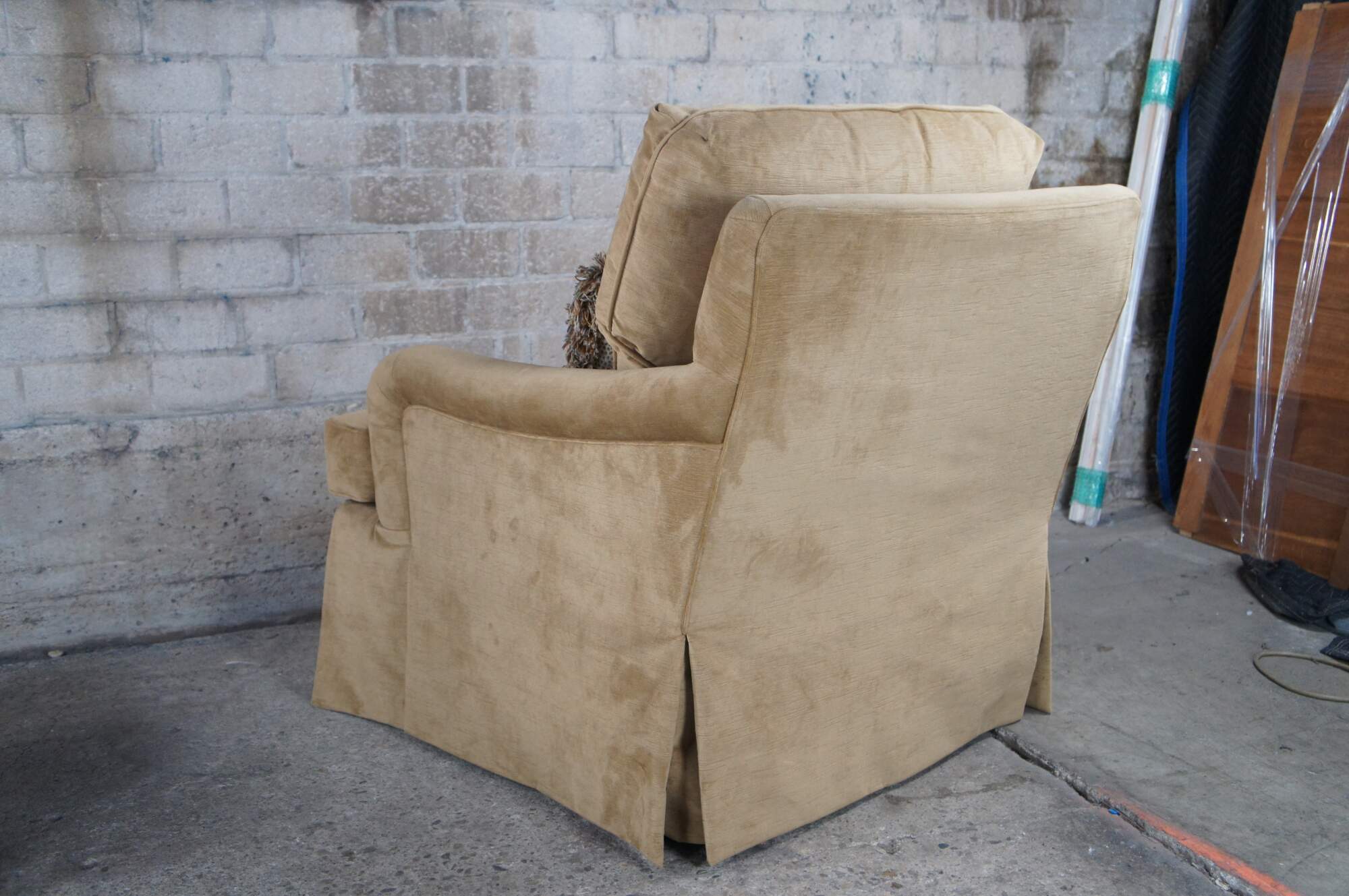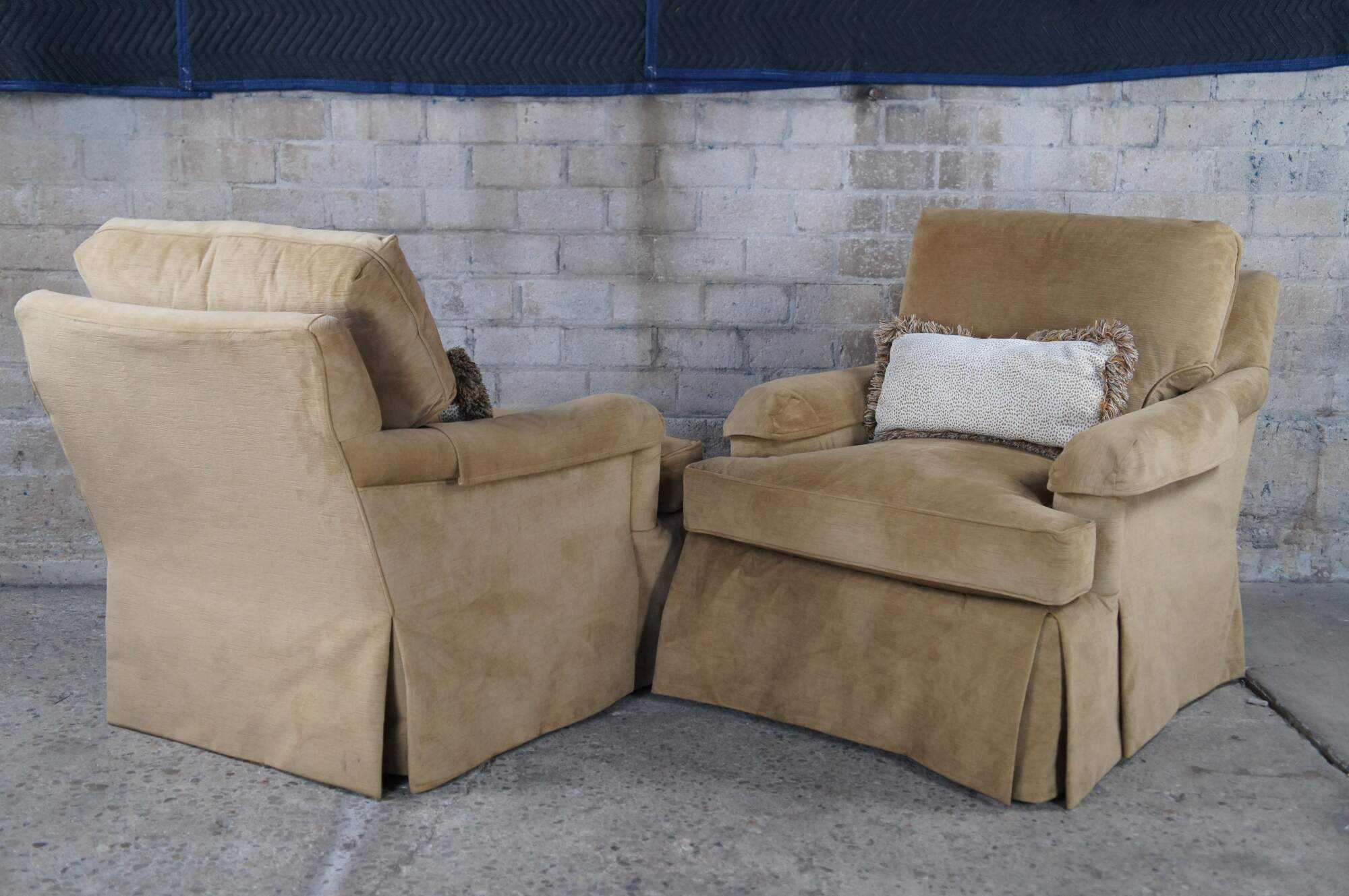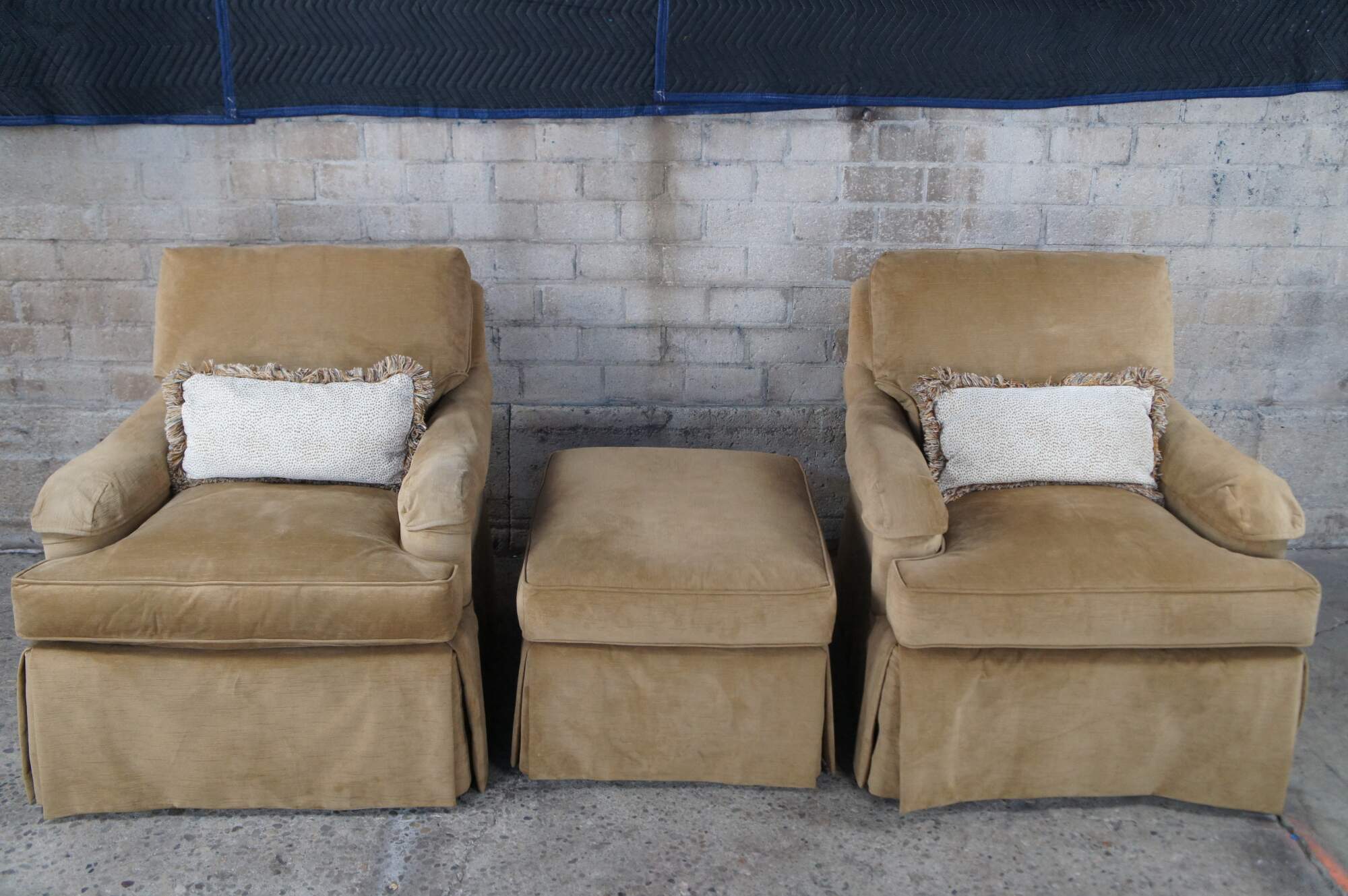 Vintage three piece EJ Victor Carlisle club / lounge / library swivel arm chairs and ottoman set. The Carlisle chair 229-33 features traditional / formal design with rolled arms, supreme lux duck down filled seat cushion, blendown skirted sides and back, standard arm caps and seat with cushion tie-downs. Includes two fringe lumbar throw pillows.