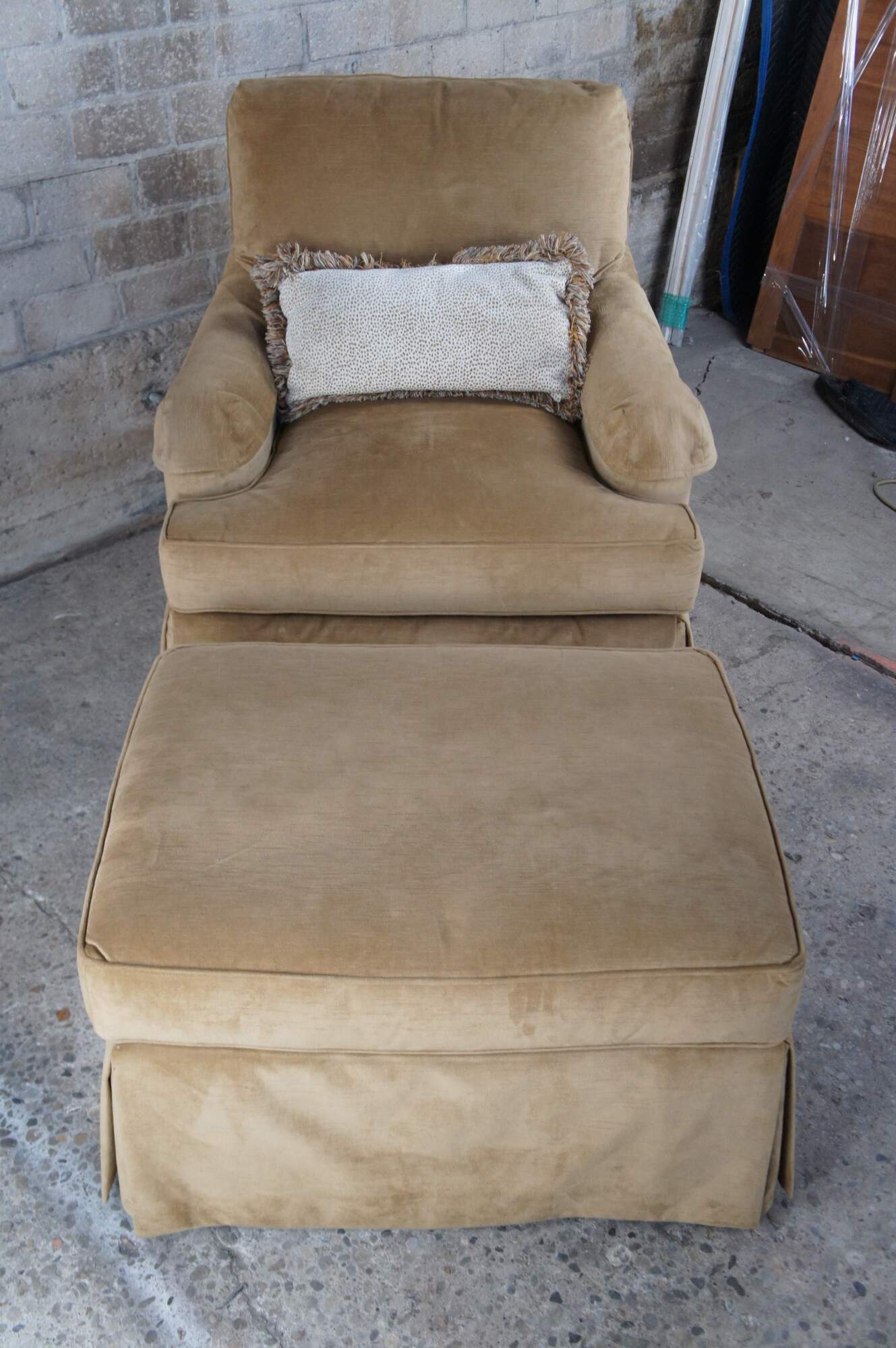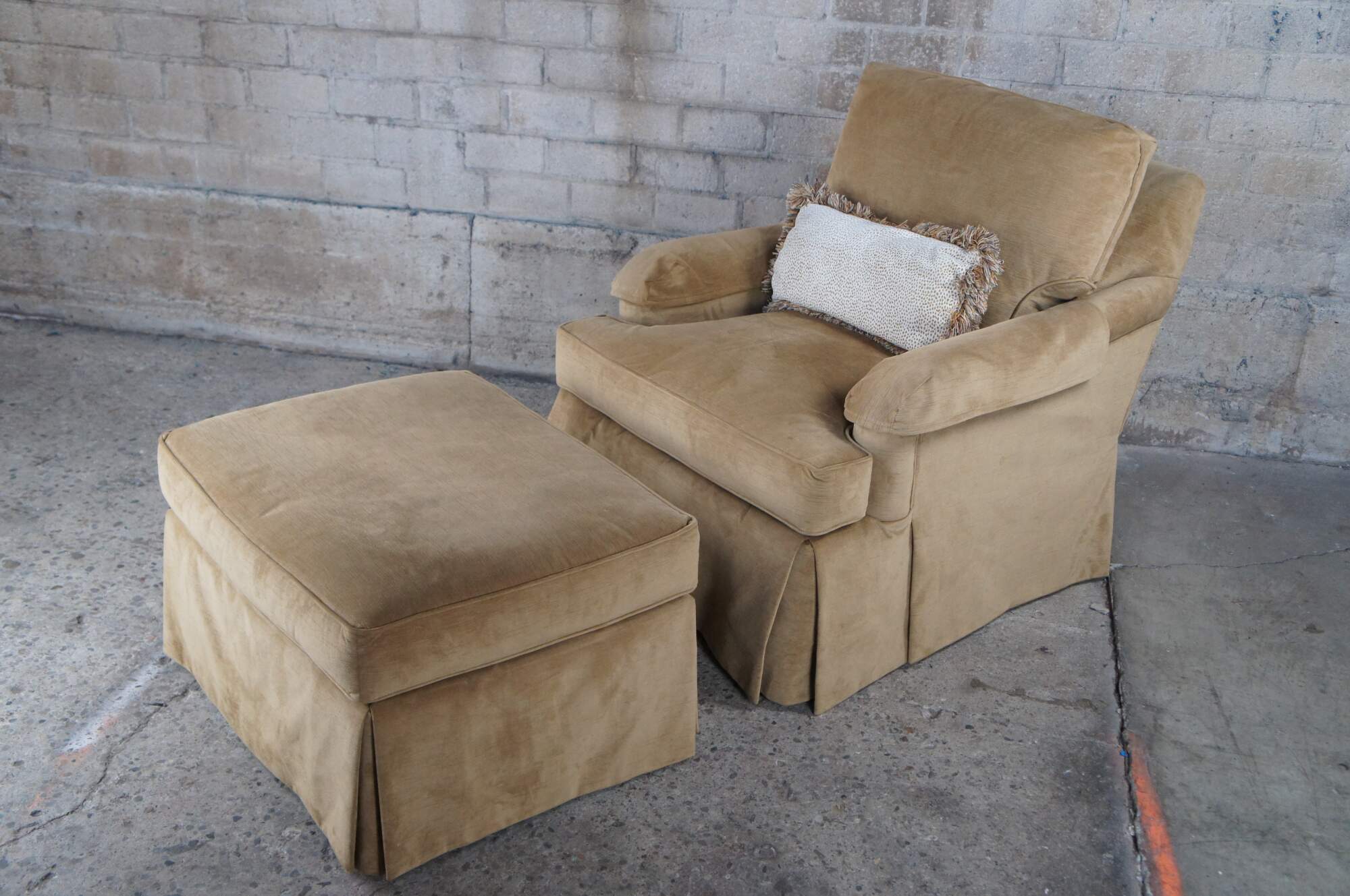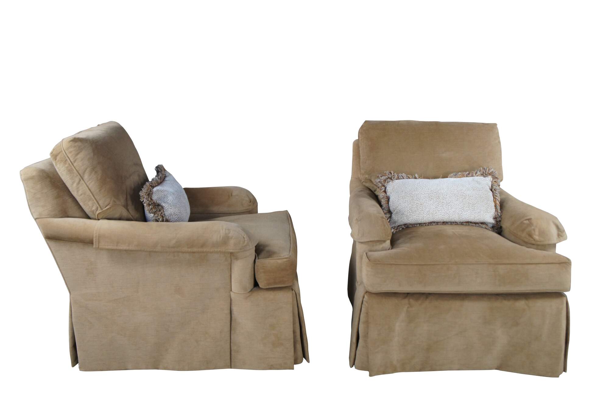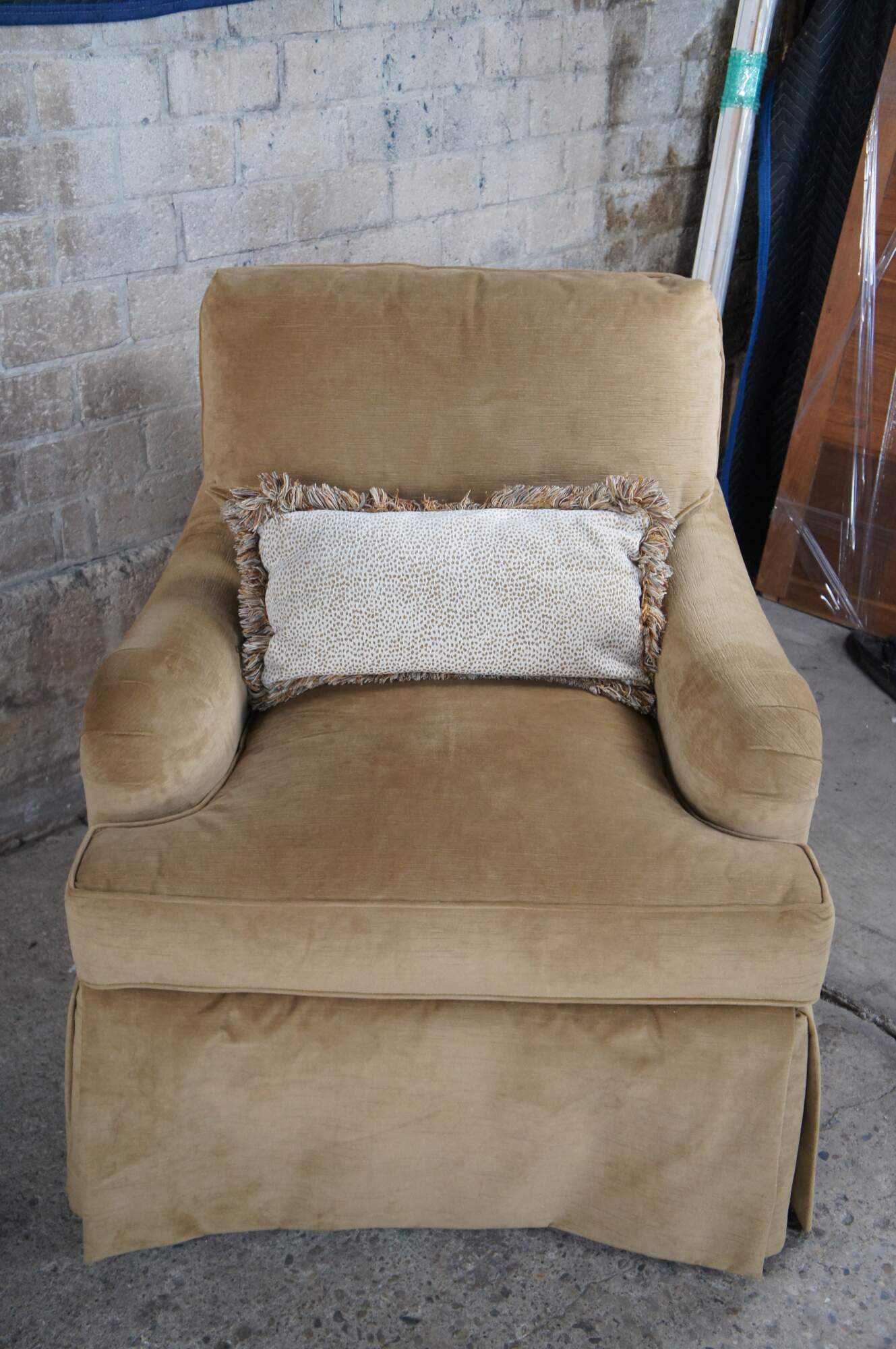 Vintage three piece EJ Victor Carlisle club / lounge / library swivel arm chairs and ottoman set. The Carlisle chair 229-33 features traditional / formal design with rolled arms, supreme lux duck down filled seat cushion, blendown skirted sides and back, standard arm caps and seat with cushion tie-downs. Includes two fringe lumbar throw pillows.