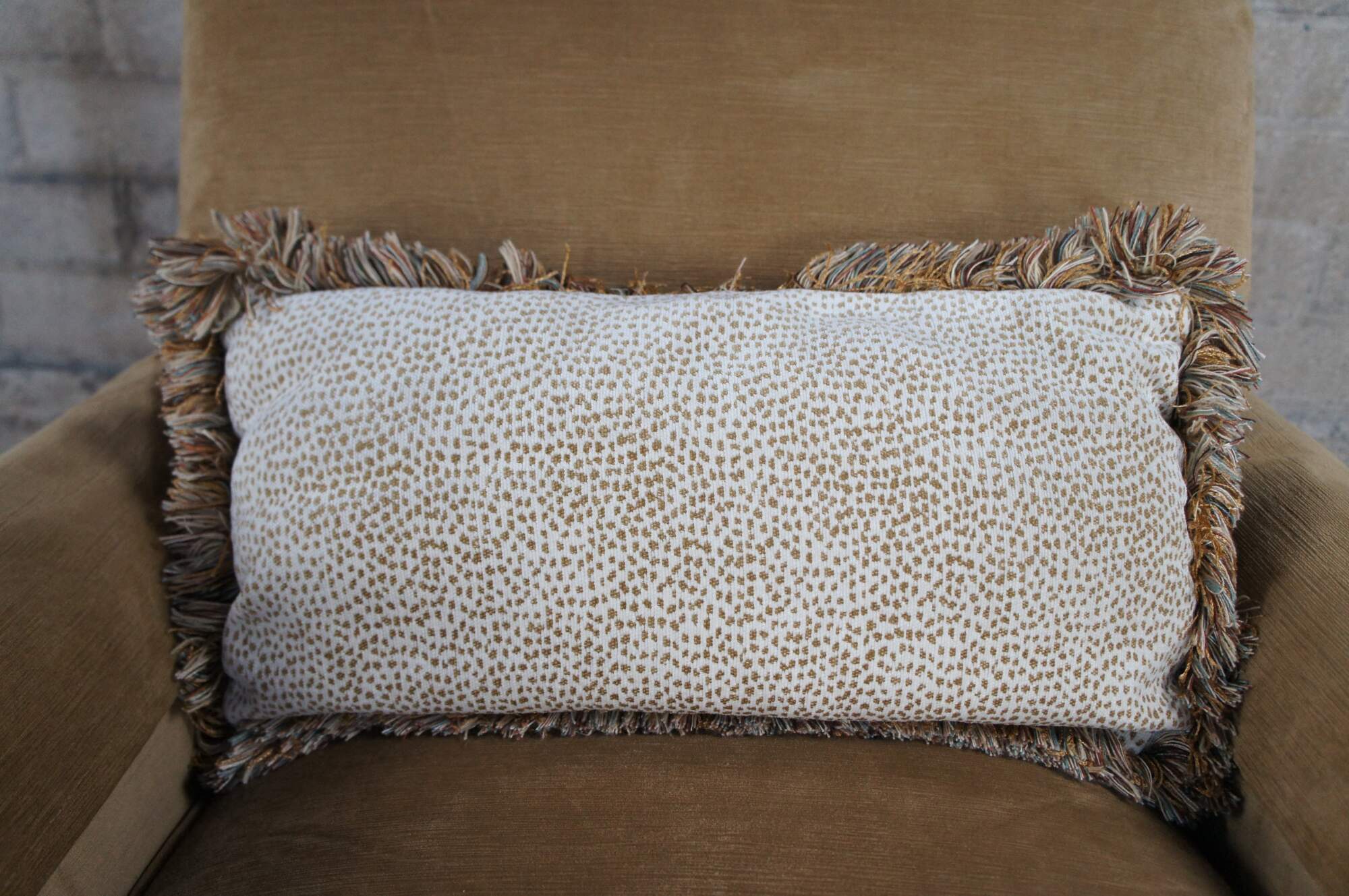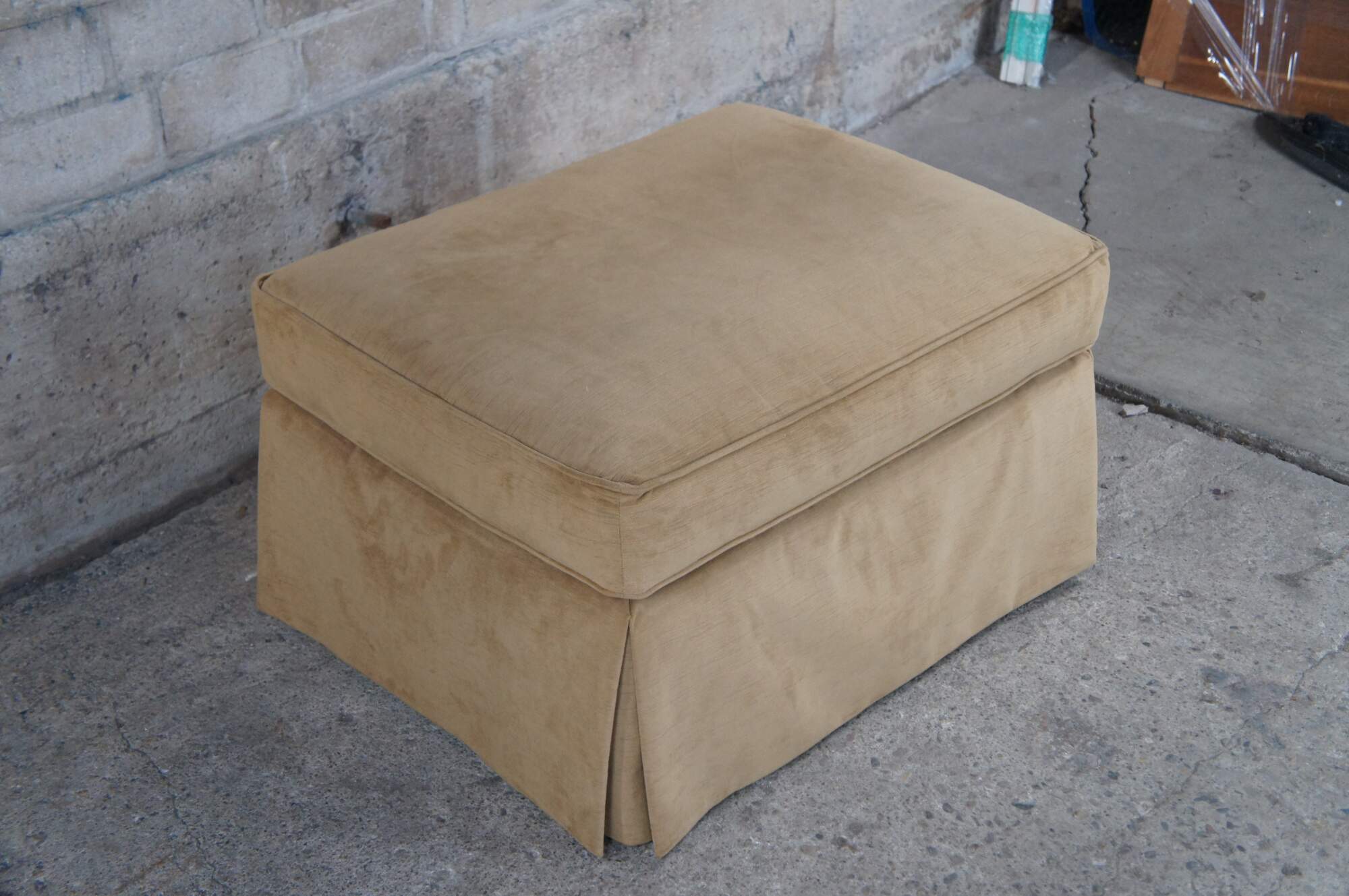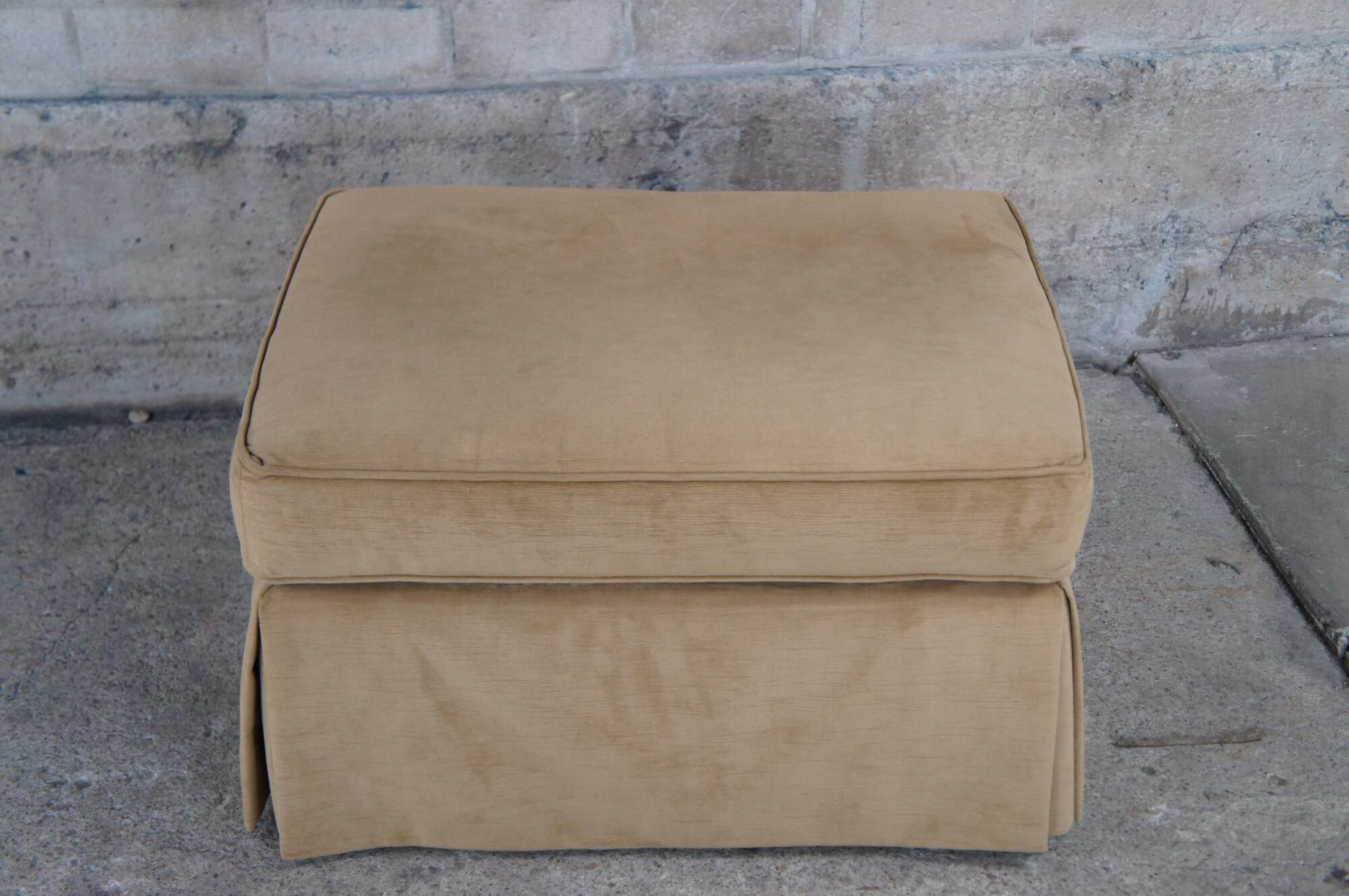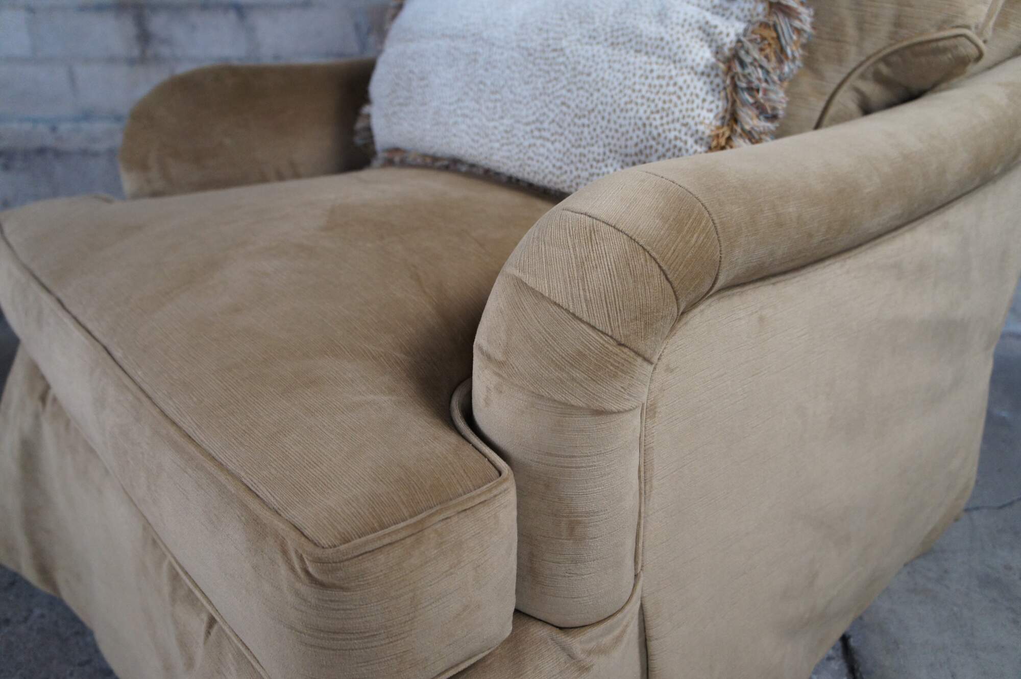 Vintage three piece EJ Victor Carlisle club / lounge / library swivel arm chairs and ottoman set. The Carlisle chair 229-33 features traditional / formal design with rolled arms, supreme lux duck down filled seat cushion, blendown skirted sides and back, standard arm caps and seat with cushion tie-downs. Includes two fringe lumbar throw pillows.