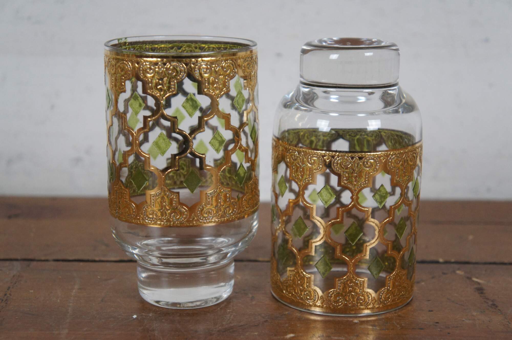 Set of eight vintage mid 20th century Culver's Valencia footed highball glasses / tumblers, encrysted with a gilt / gold bohemian lattice design, accented with green diamonds.