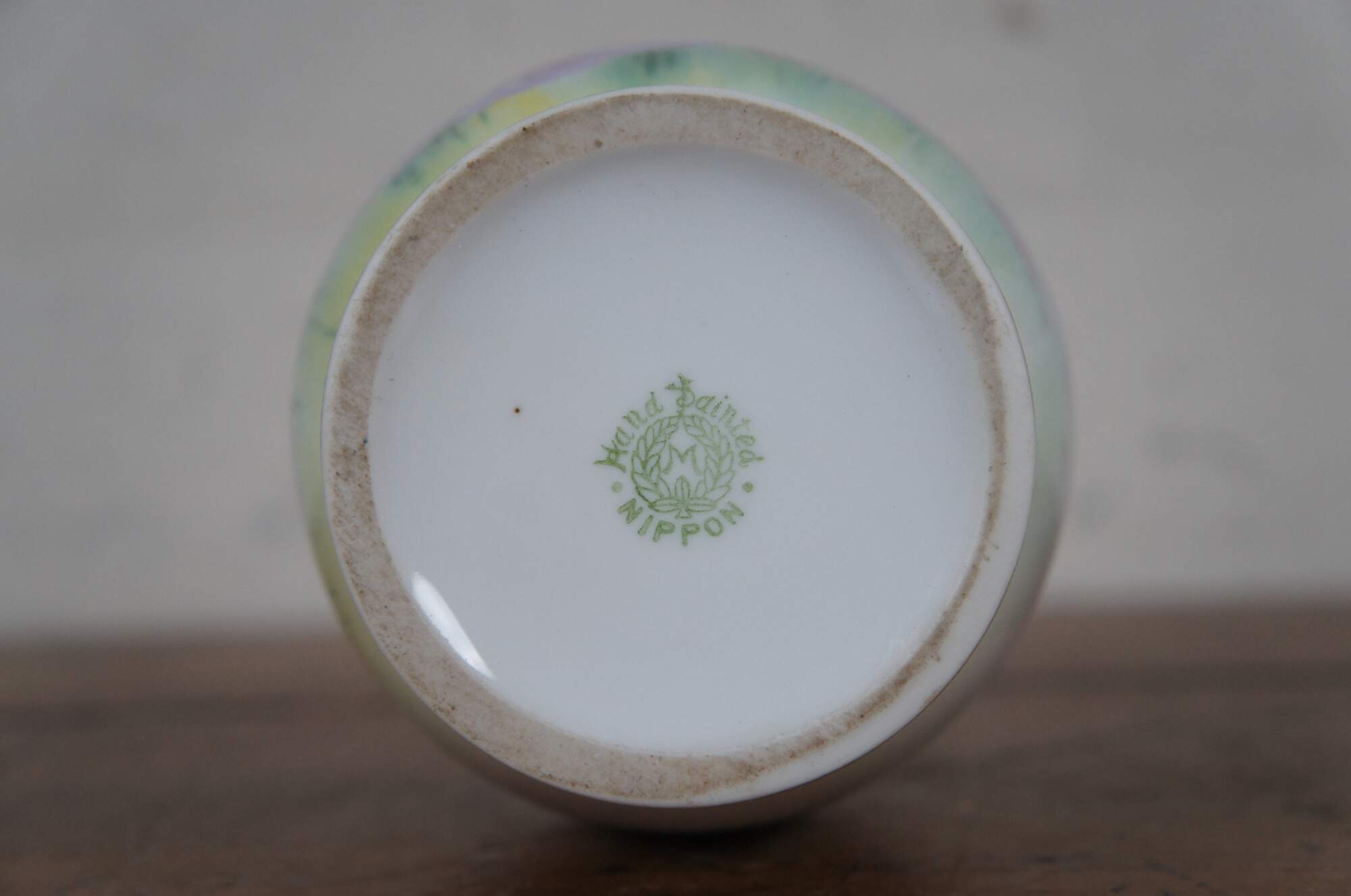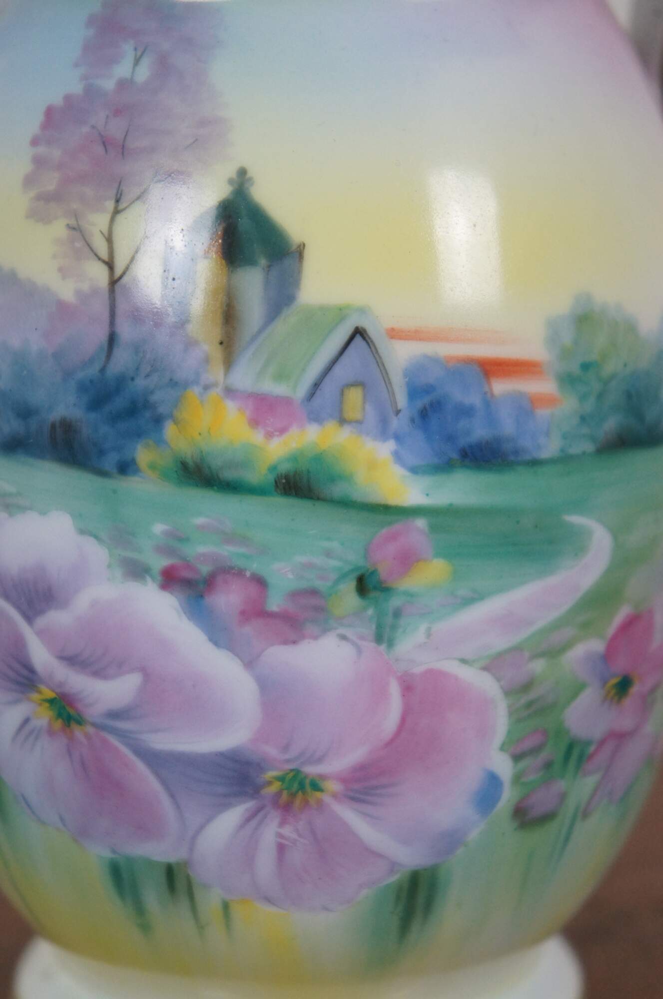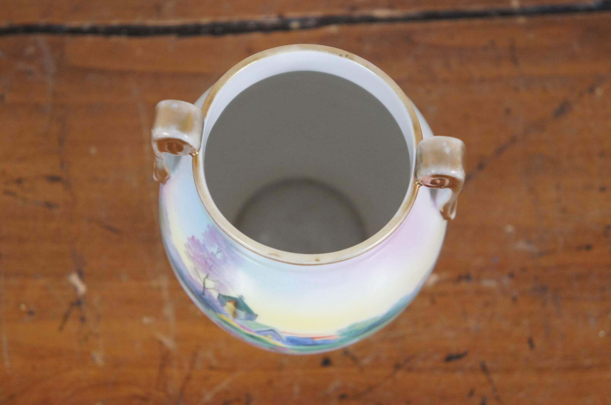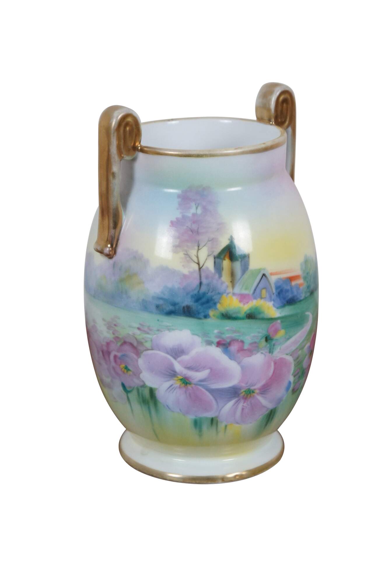 Antique early 20th century Notitake porcelain vase with gilt art deco style handles, hand painted with a pastel country landscape with a village church / barn with silo beyond a foreground of pansies. Mark used circa 1911-1921.