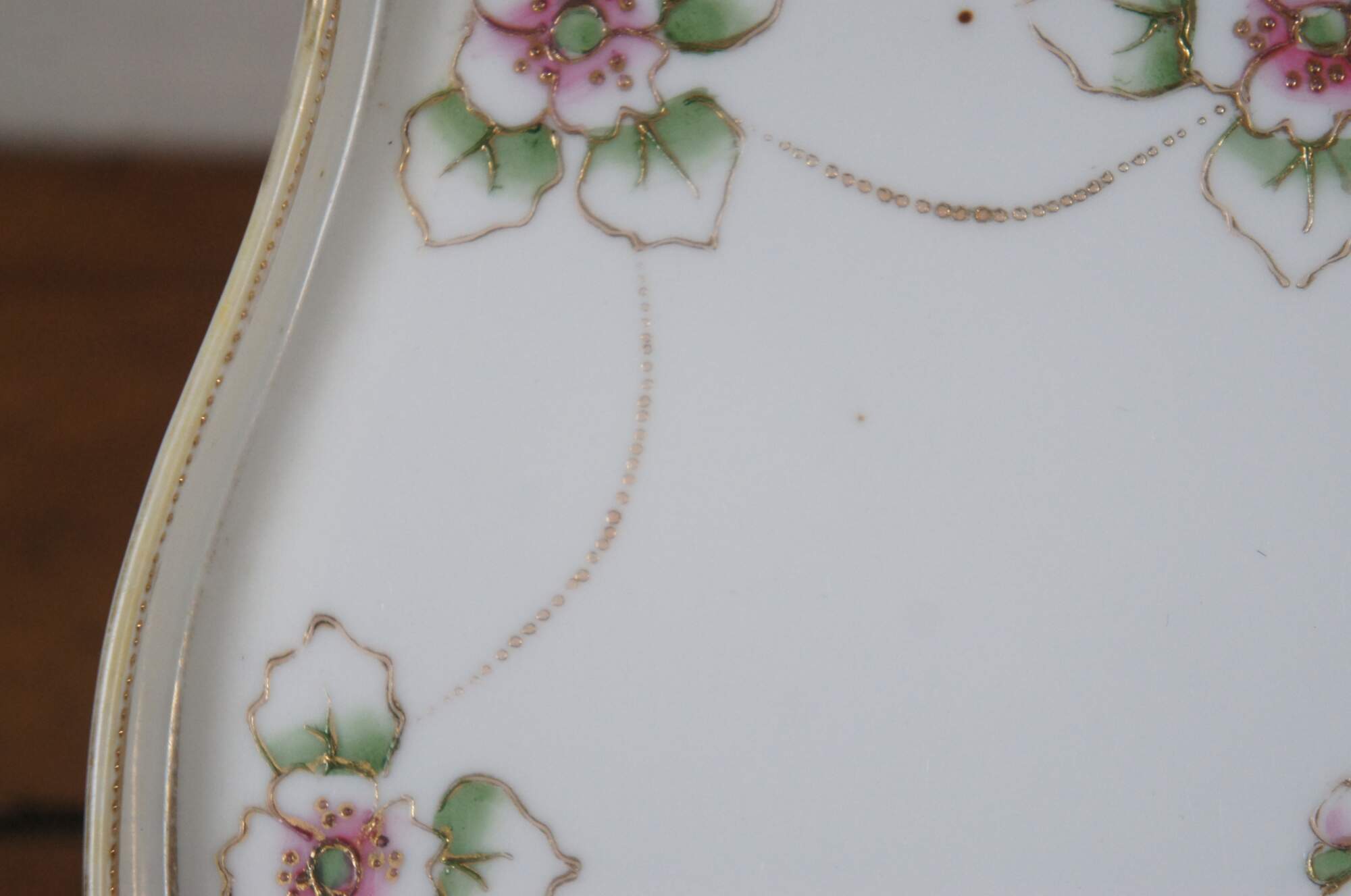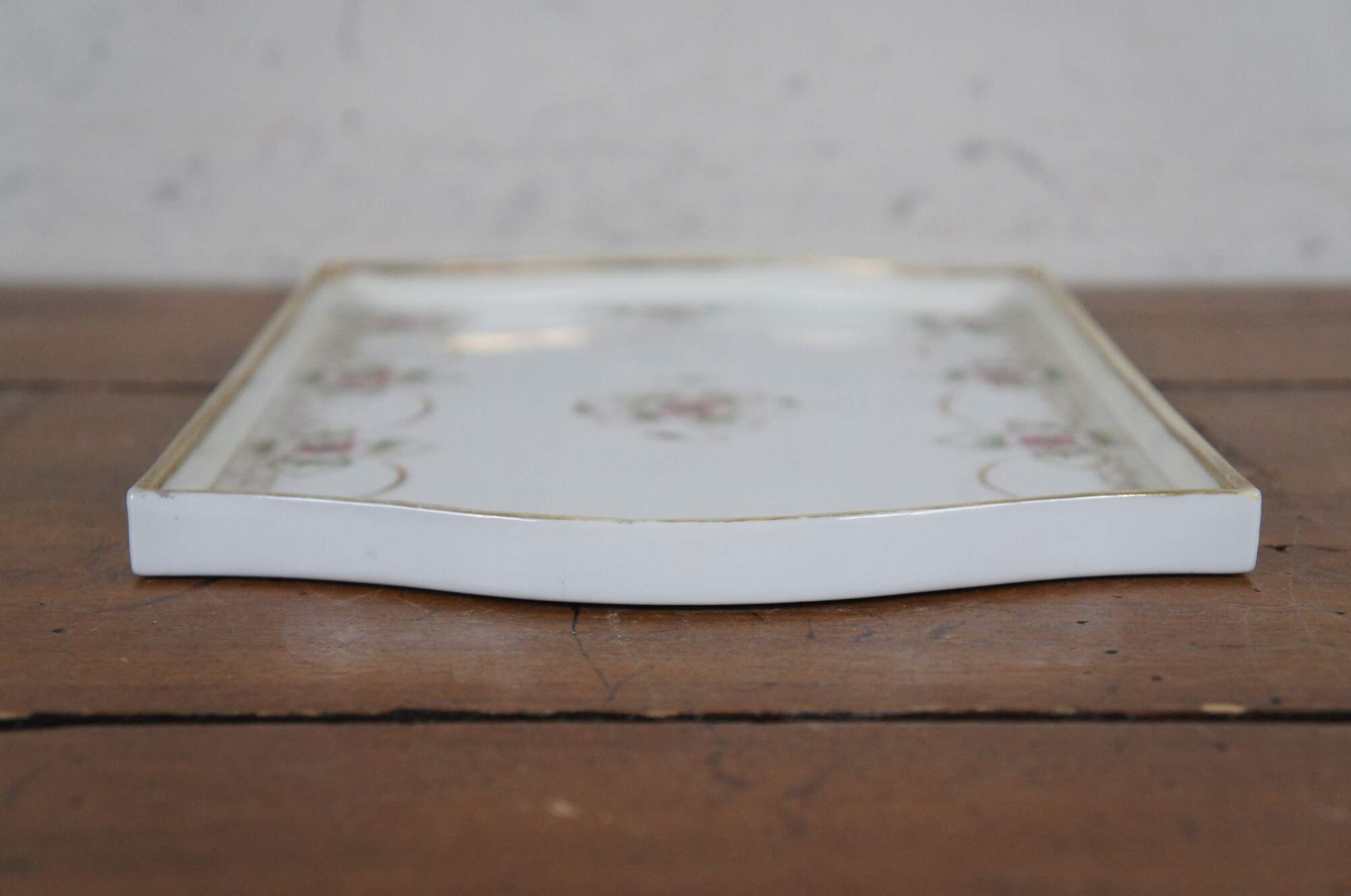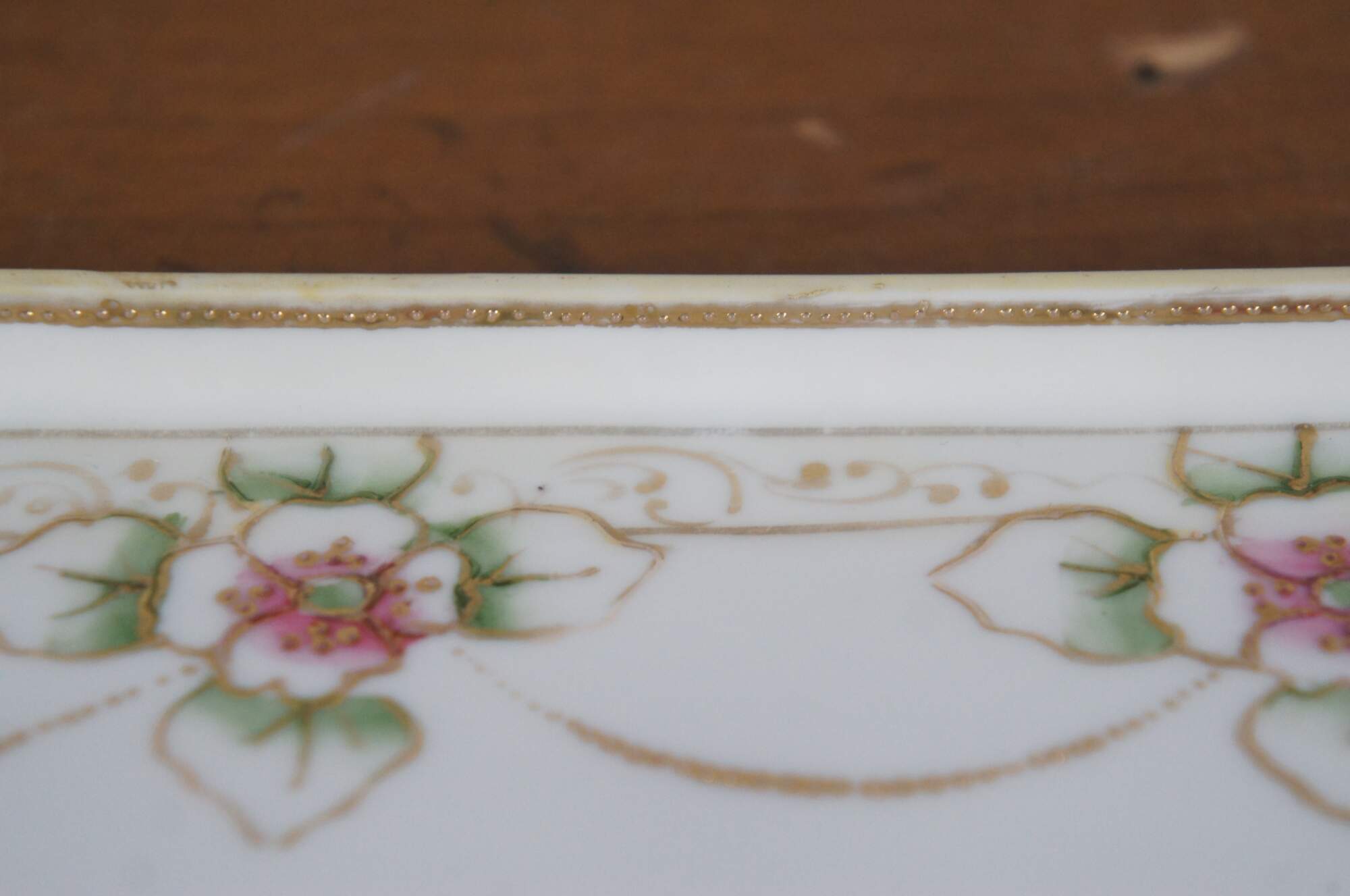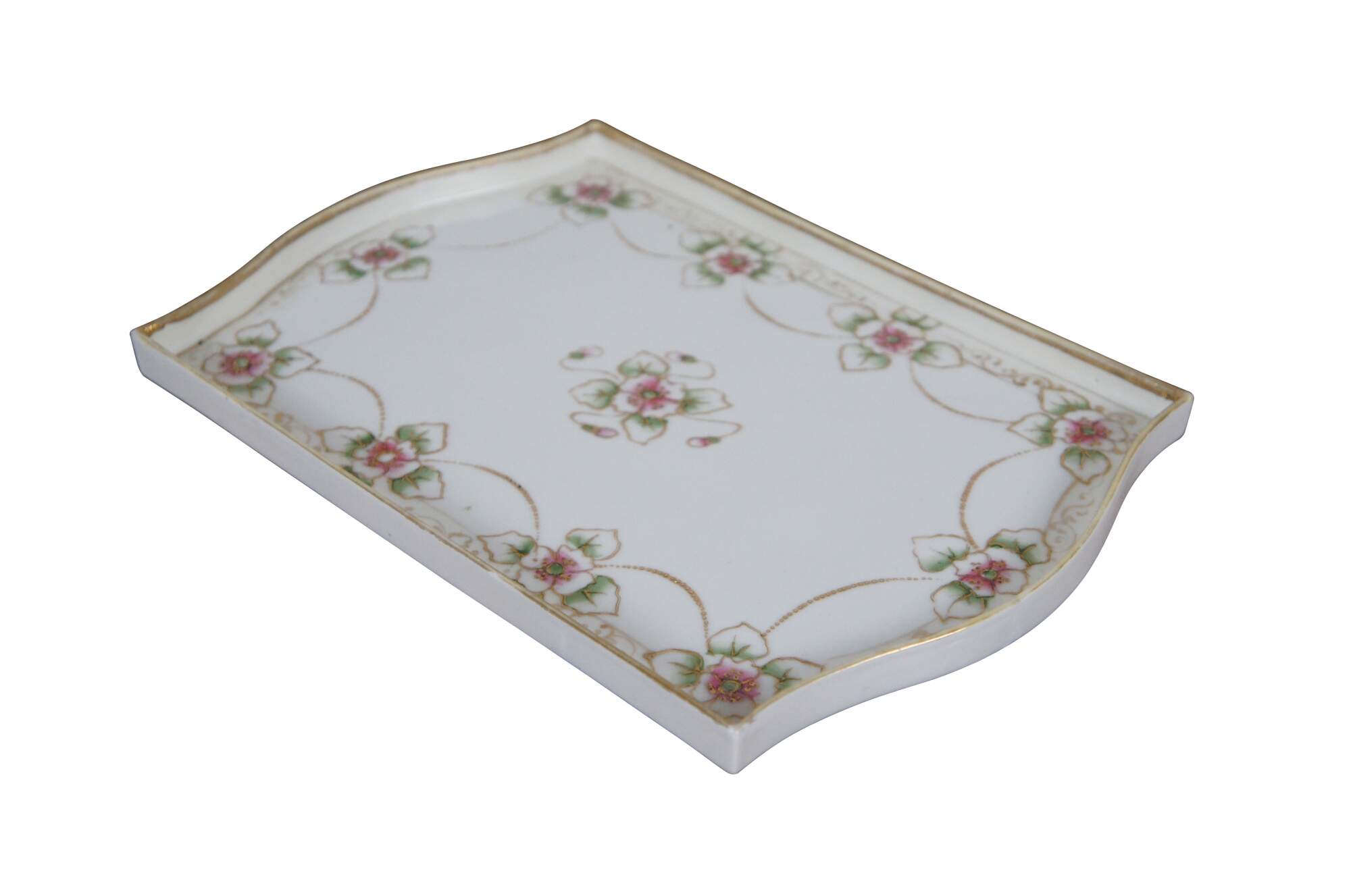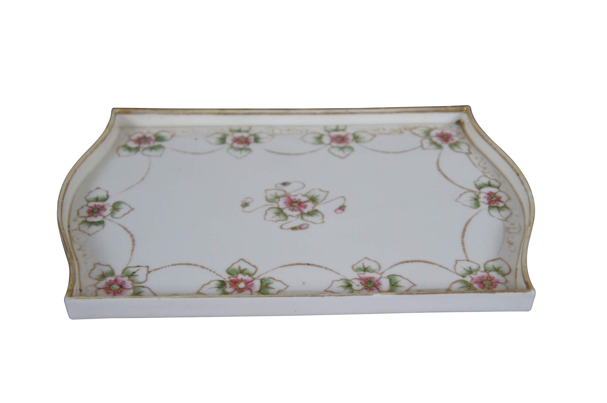 Antique early 20th century Noritake porcelain vanity tray. Rectangular shape with oxbow ends and raised edge, hand painted with pink and green roses connected with beaded gilt swags. Mark used circa 1911-1921.