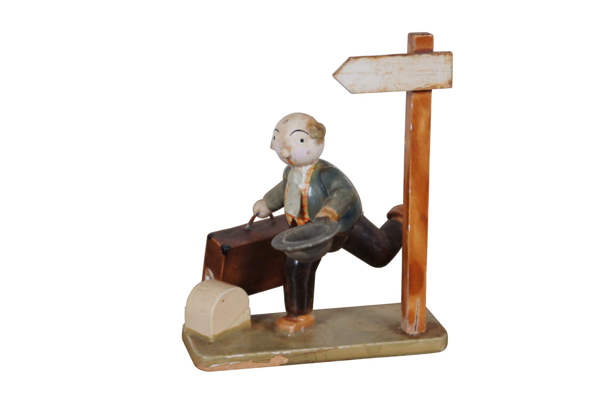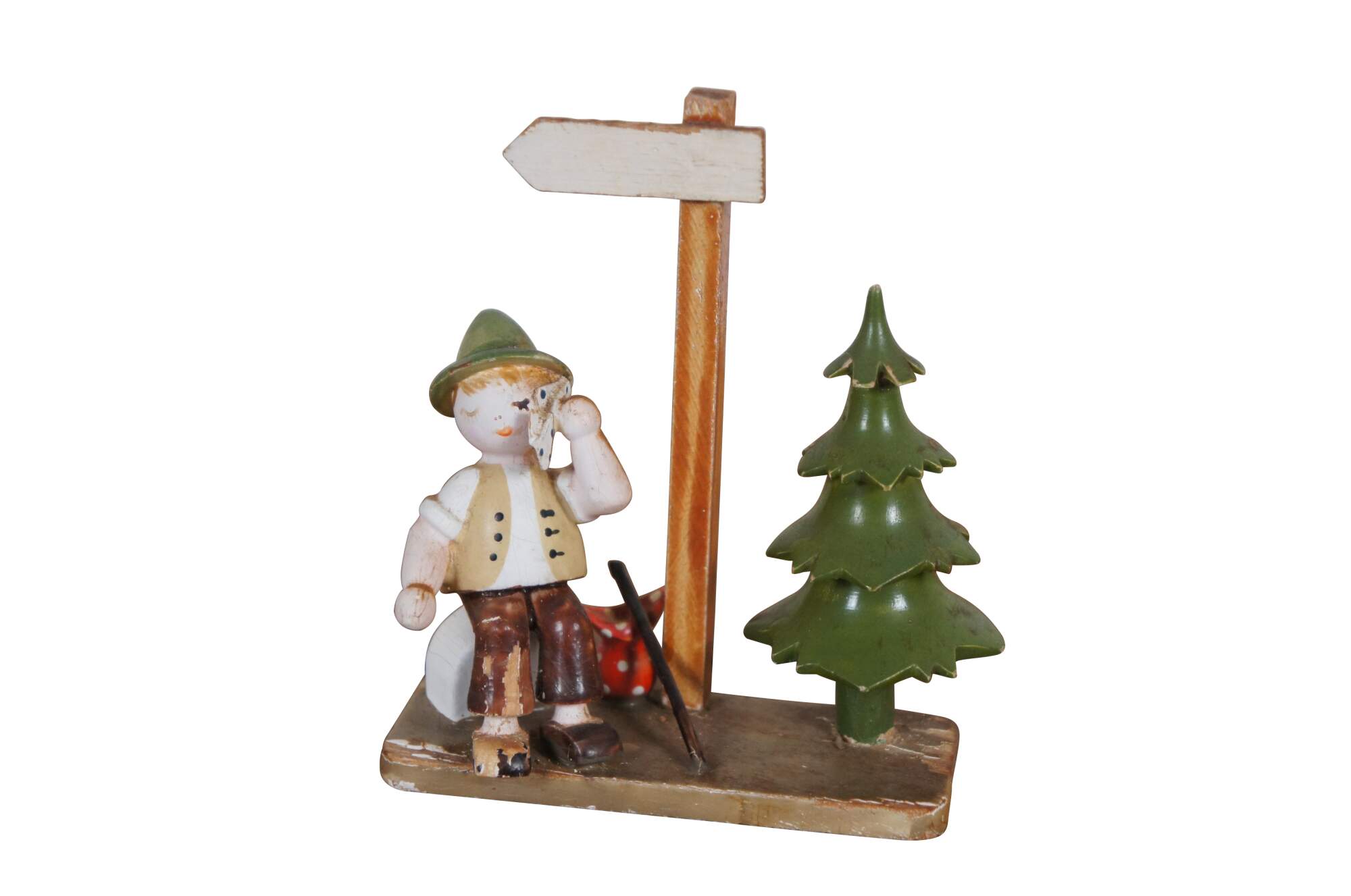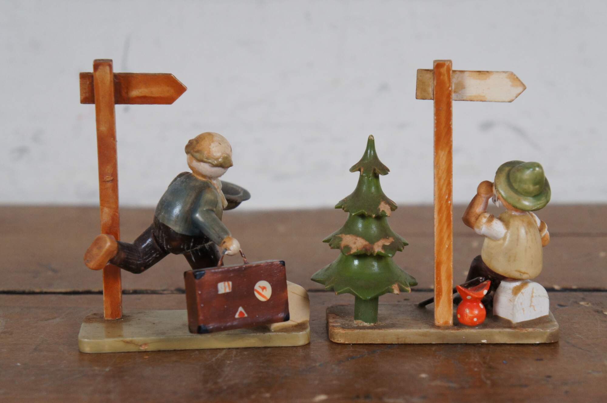 Pair of circa mid 20th century wooden German / Erzgebirge folk art figurines attributed to Hedo. One depicts a balding man with suitcase and hat, running past a signpost. The other shows a young hitch hiker in Bavarain / Tyrolean hat, wiping the sweat from his face as he rests beside a sign post and pine tree.