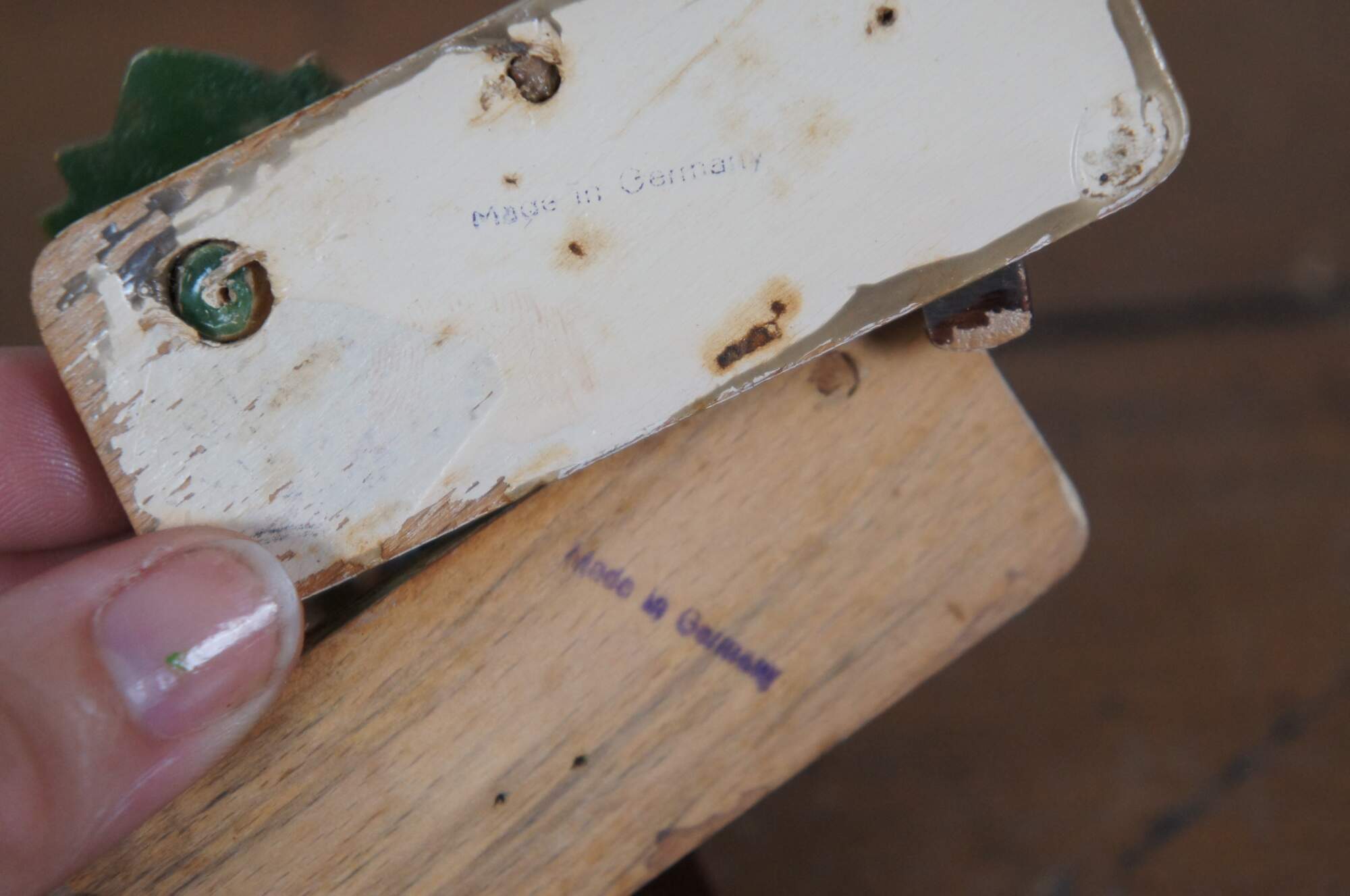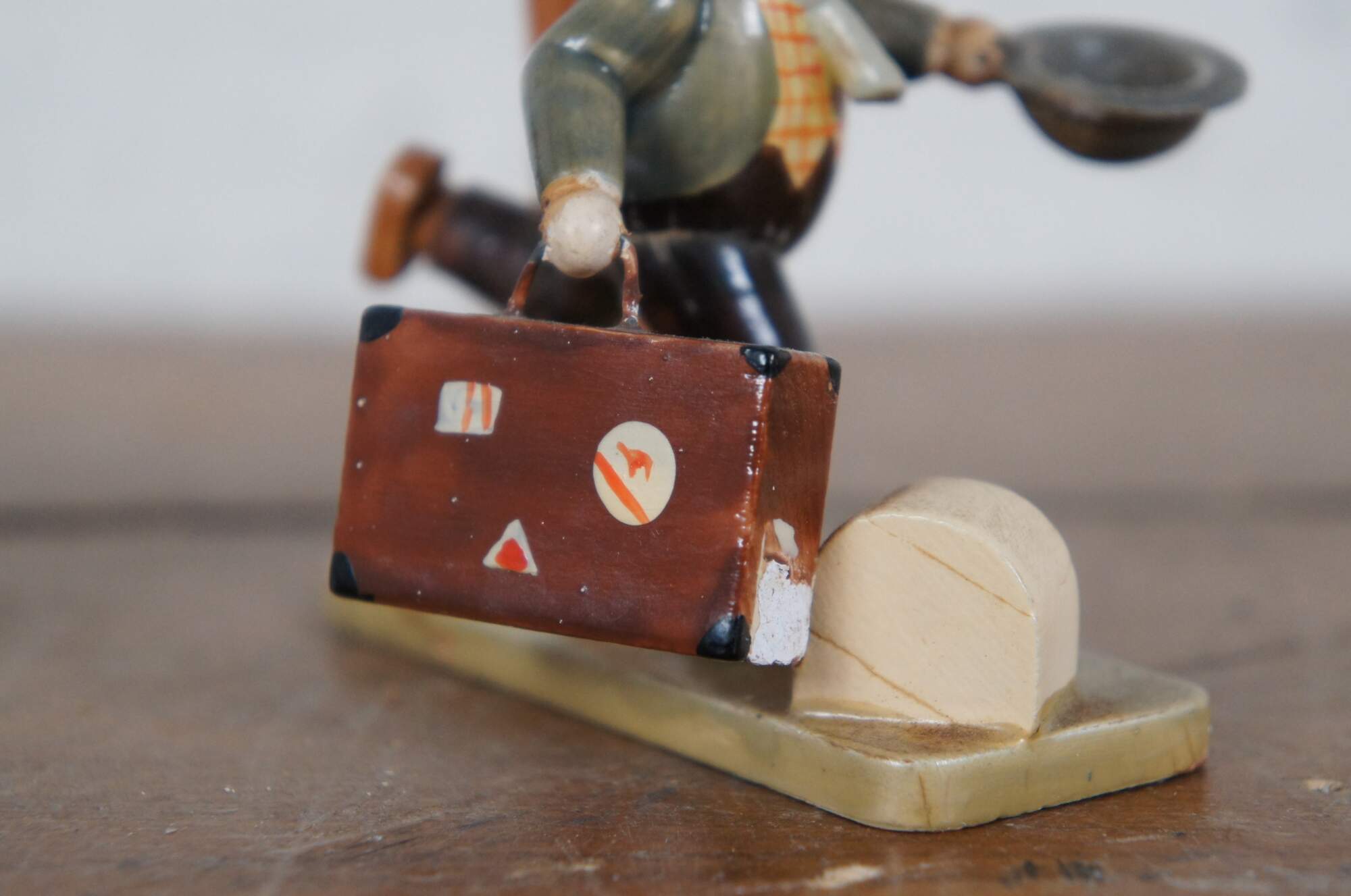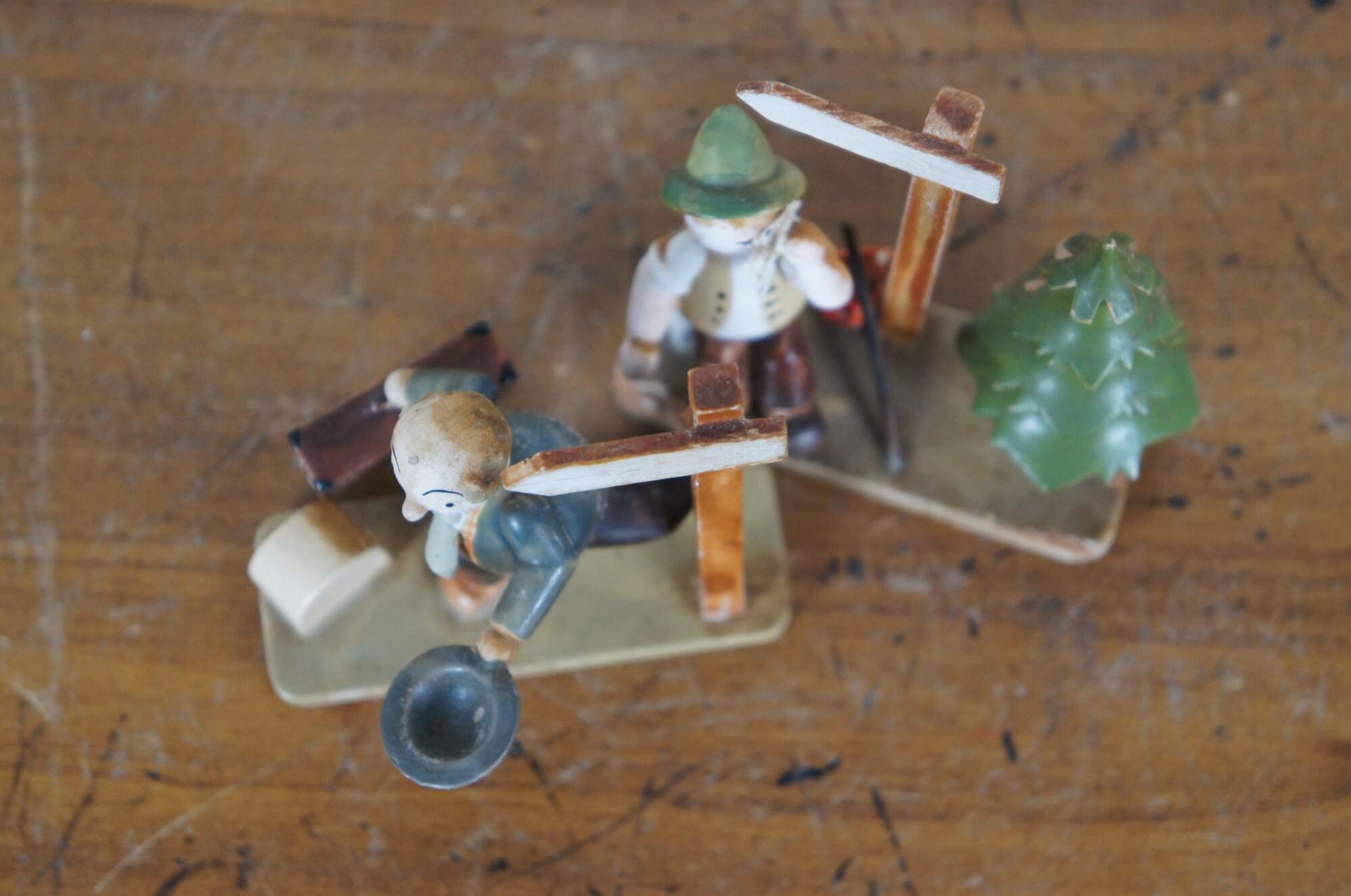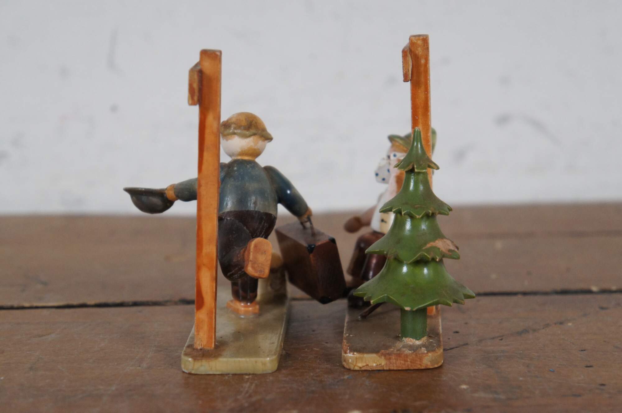 Pair of circa mid 20th century wooden German / Erzgebirge folk art figurines attributed to Hedo. One depicts a balding man with suitcase and hat, running past a signpost. The other shows a young hitch hiker in Bavarain / Tyrolean hat, wiping the sweat from his face as he rests beside a sign post and pine tree.