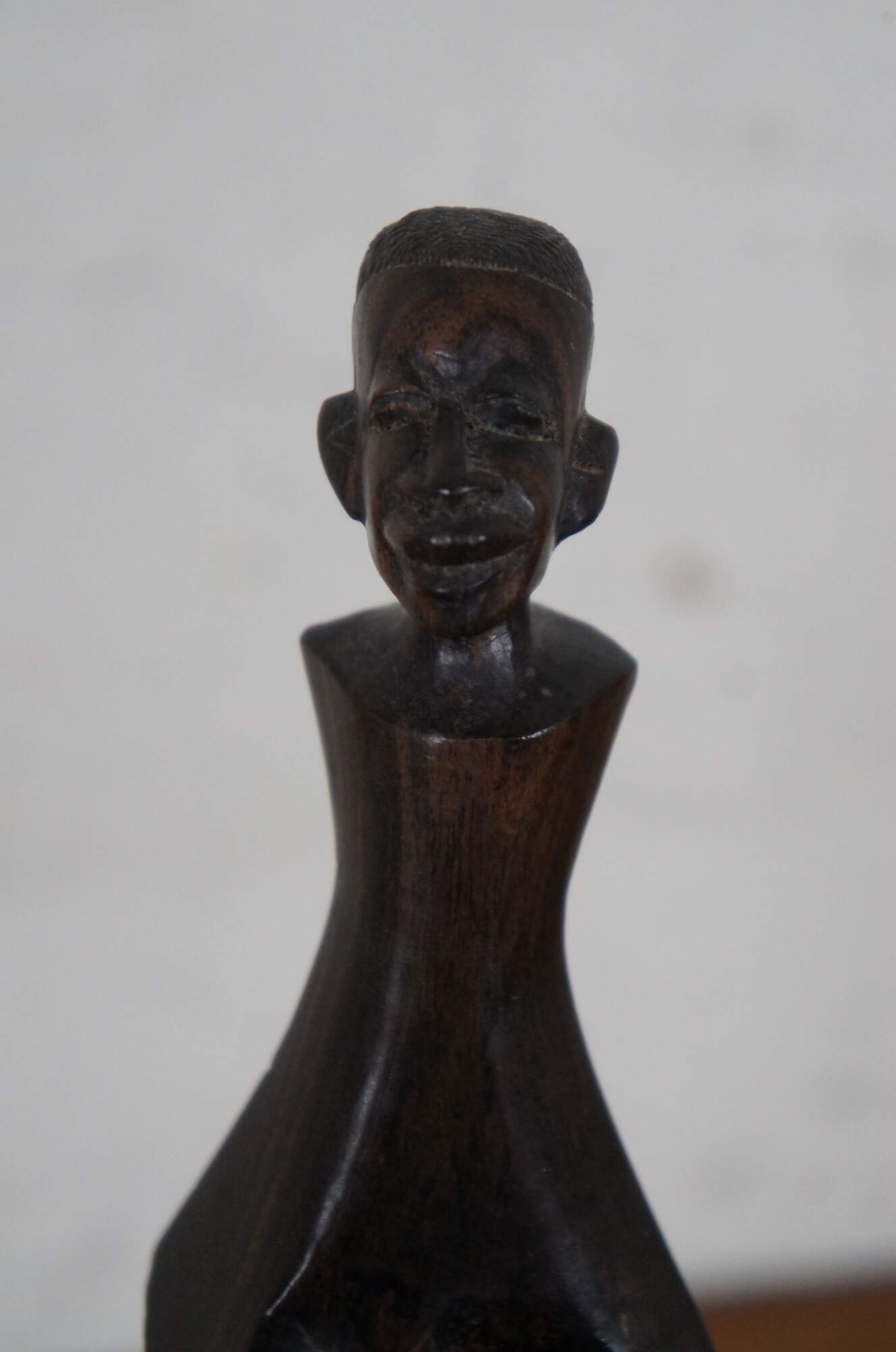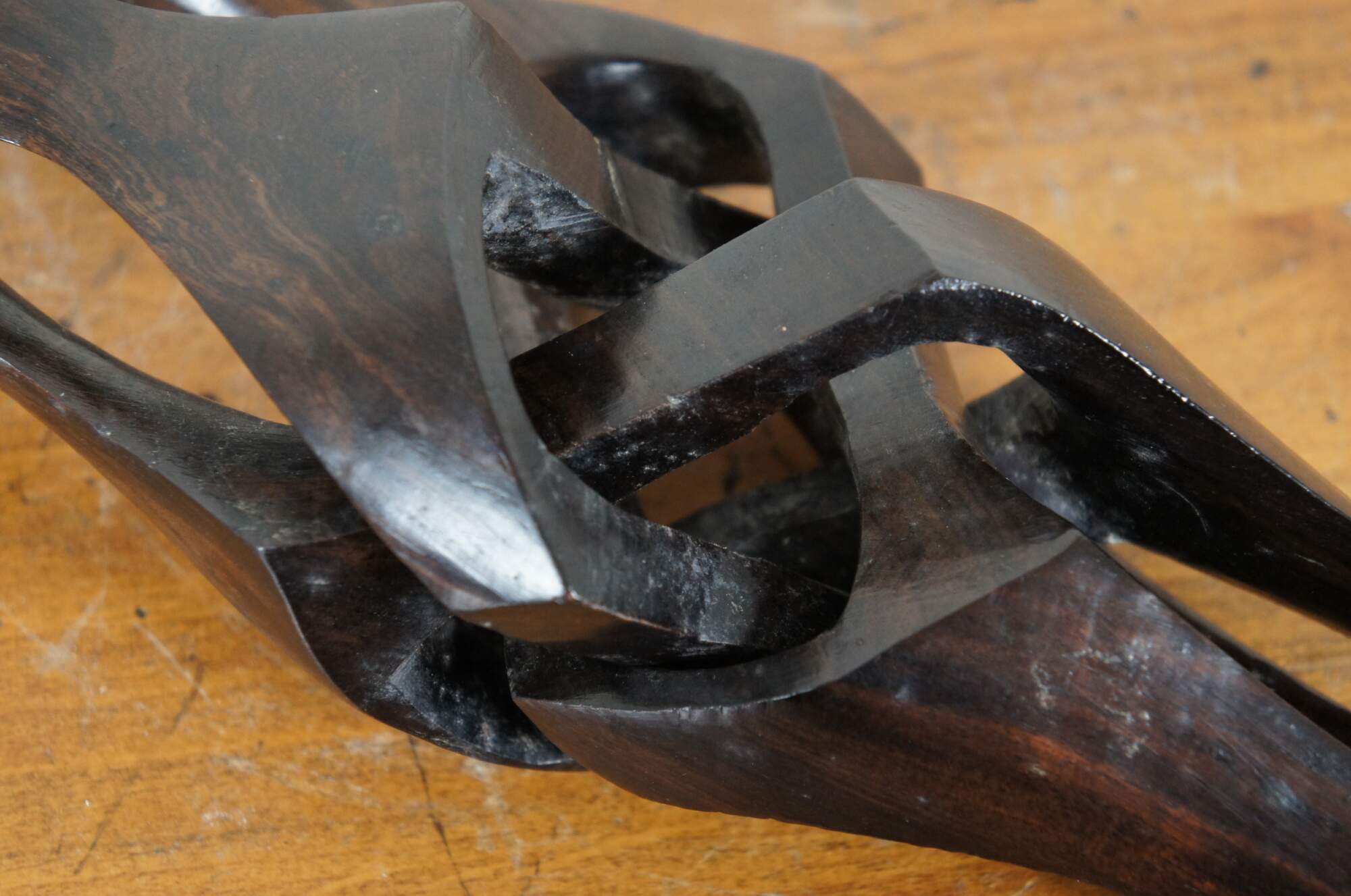 20th century carved wood African folk art sculpture / tripod, featuring three interlocking legs topped with carved faces.