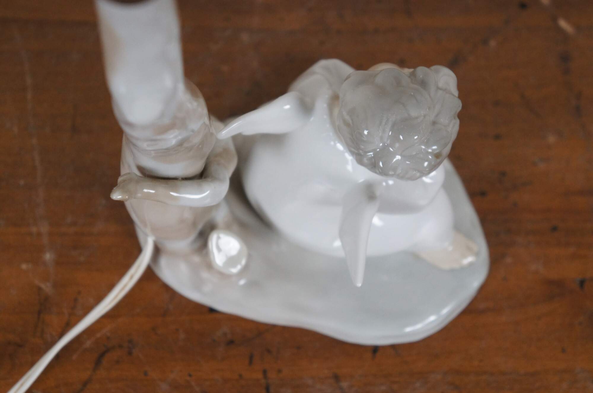 Circa 1970's Lladro porcelain table lamp designed by Fulgencio Garcia titled "Angel Pensando Lampera" or Angel Thinking Lamp, depicting a young angel in thought, seated at the foot of a bare tree trunk. First issued 1969; retired 1976. 4539. 4546.