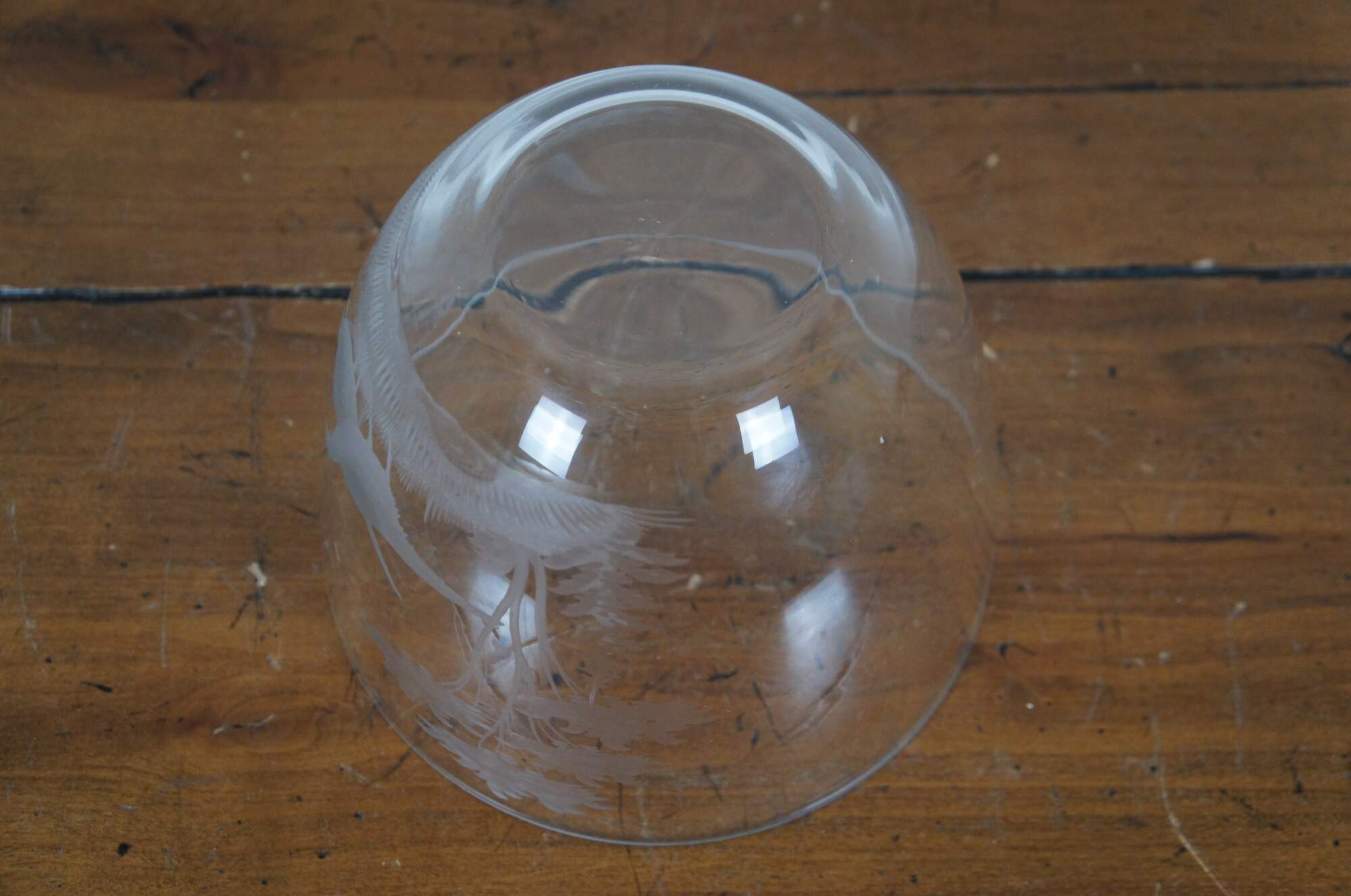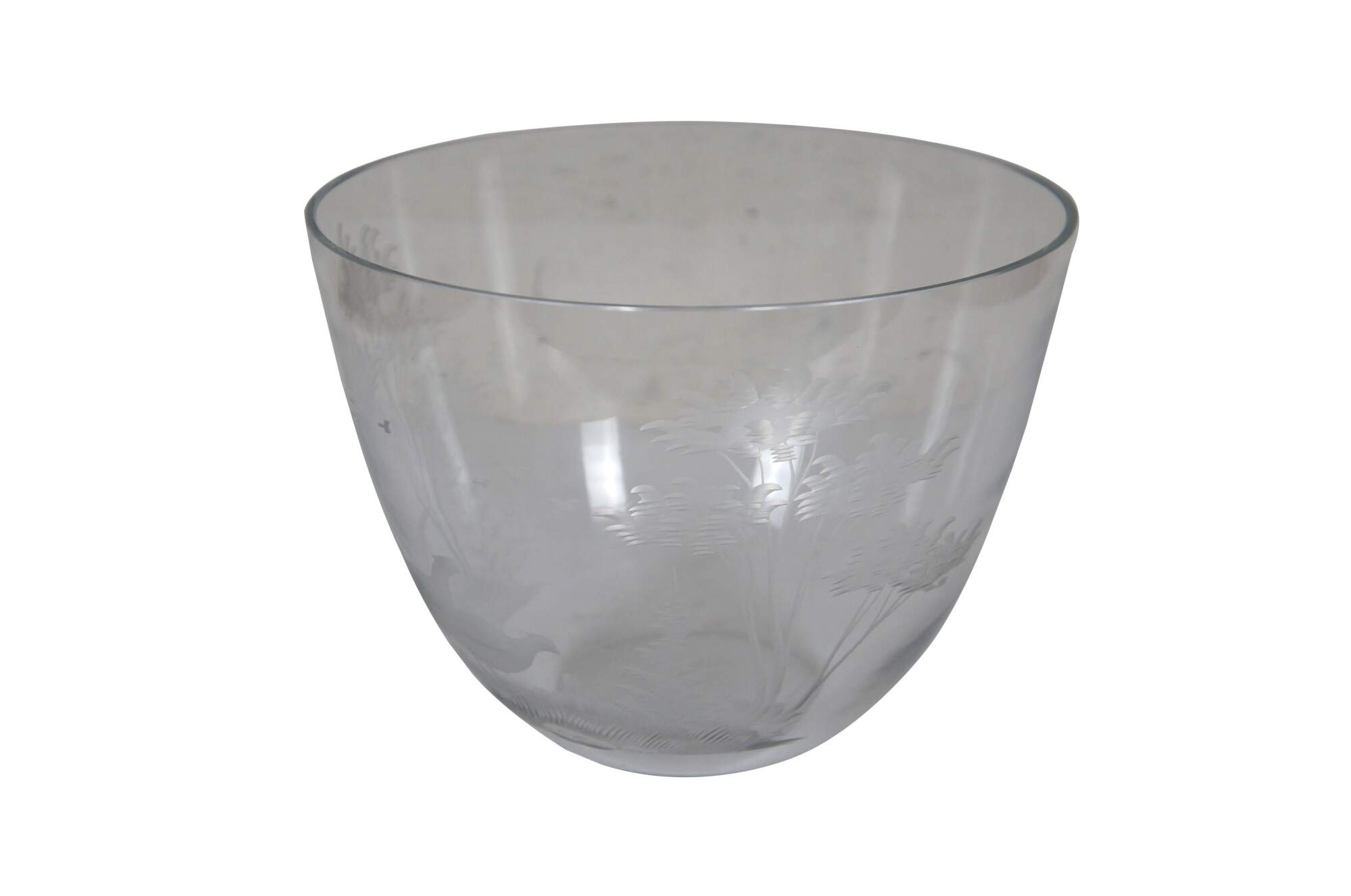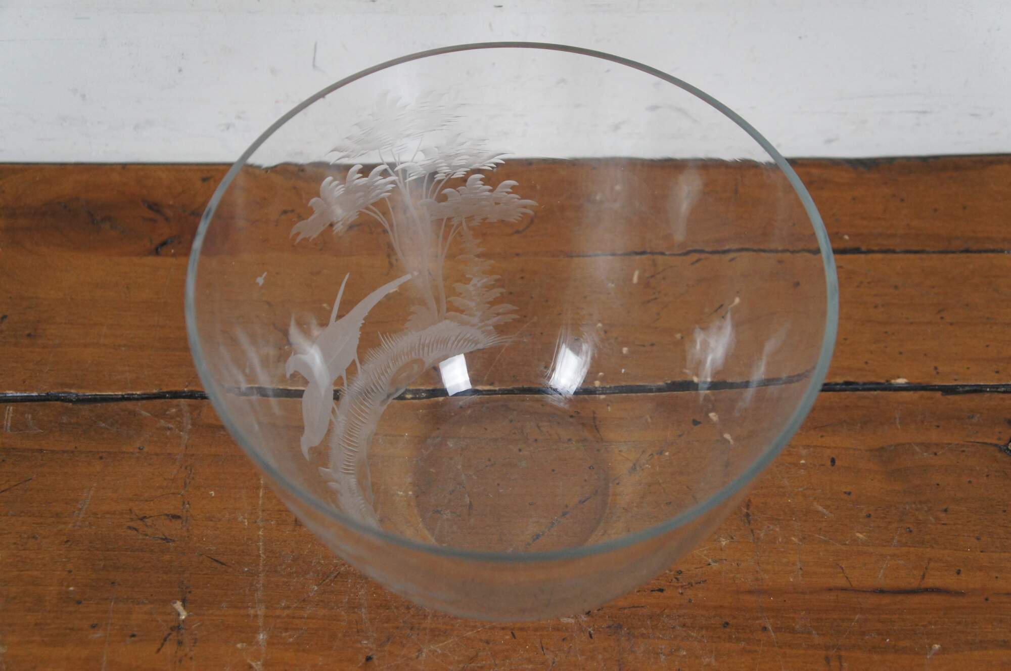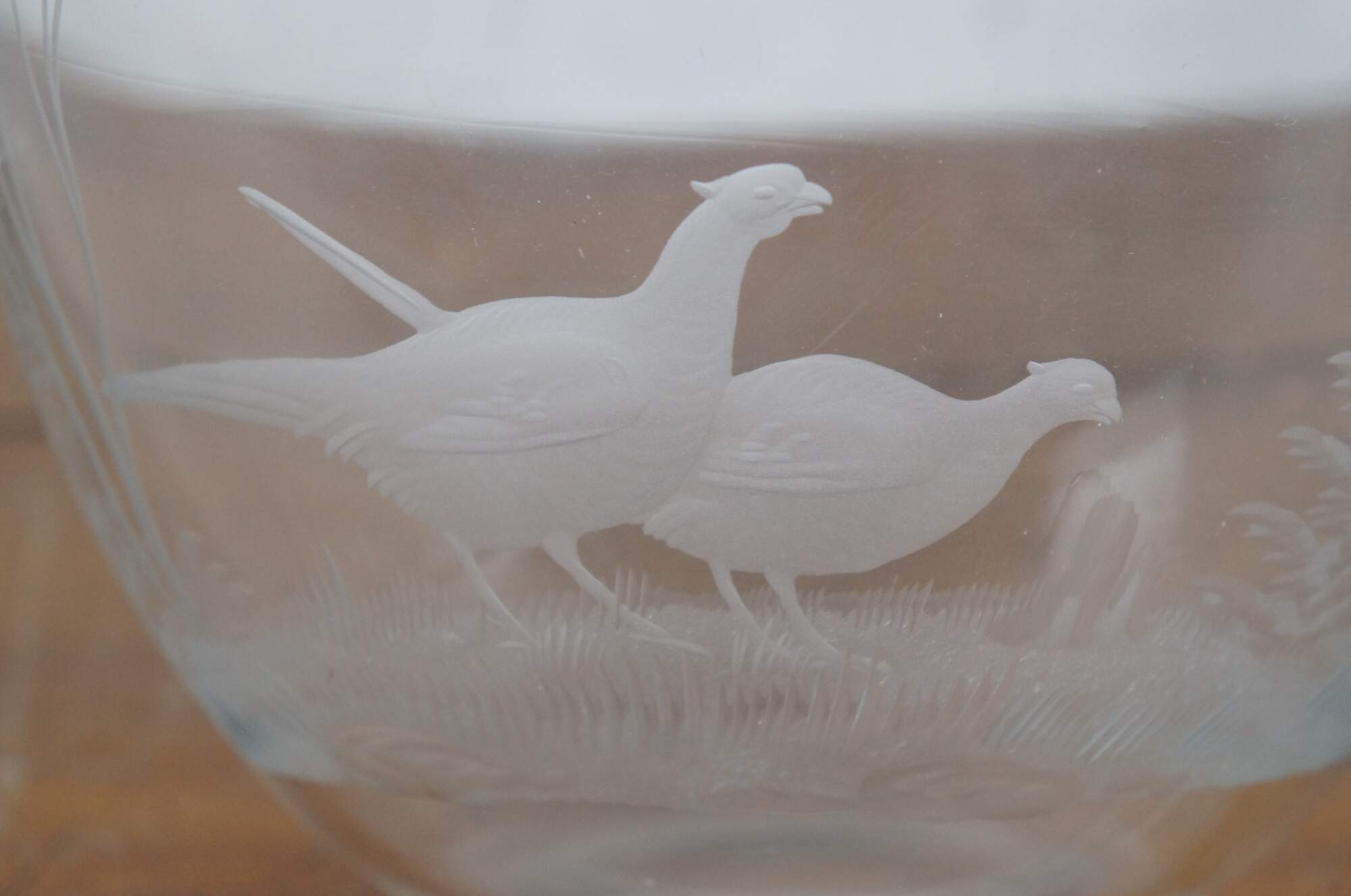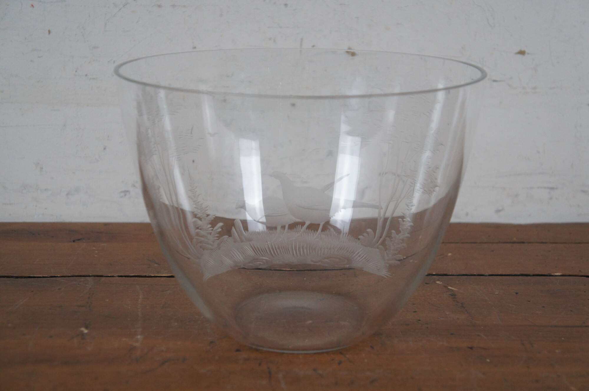 Vintage German Queen Lace clear crystal centerpiece / serving bowl etched with a hunt scene / landscape of trees and two pheasants.