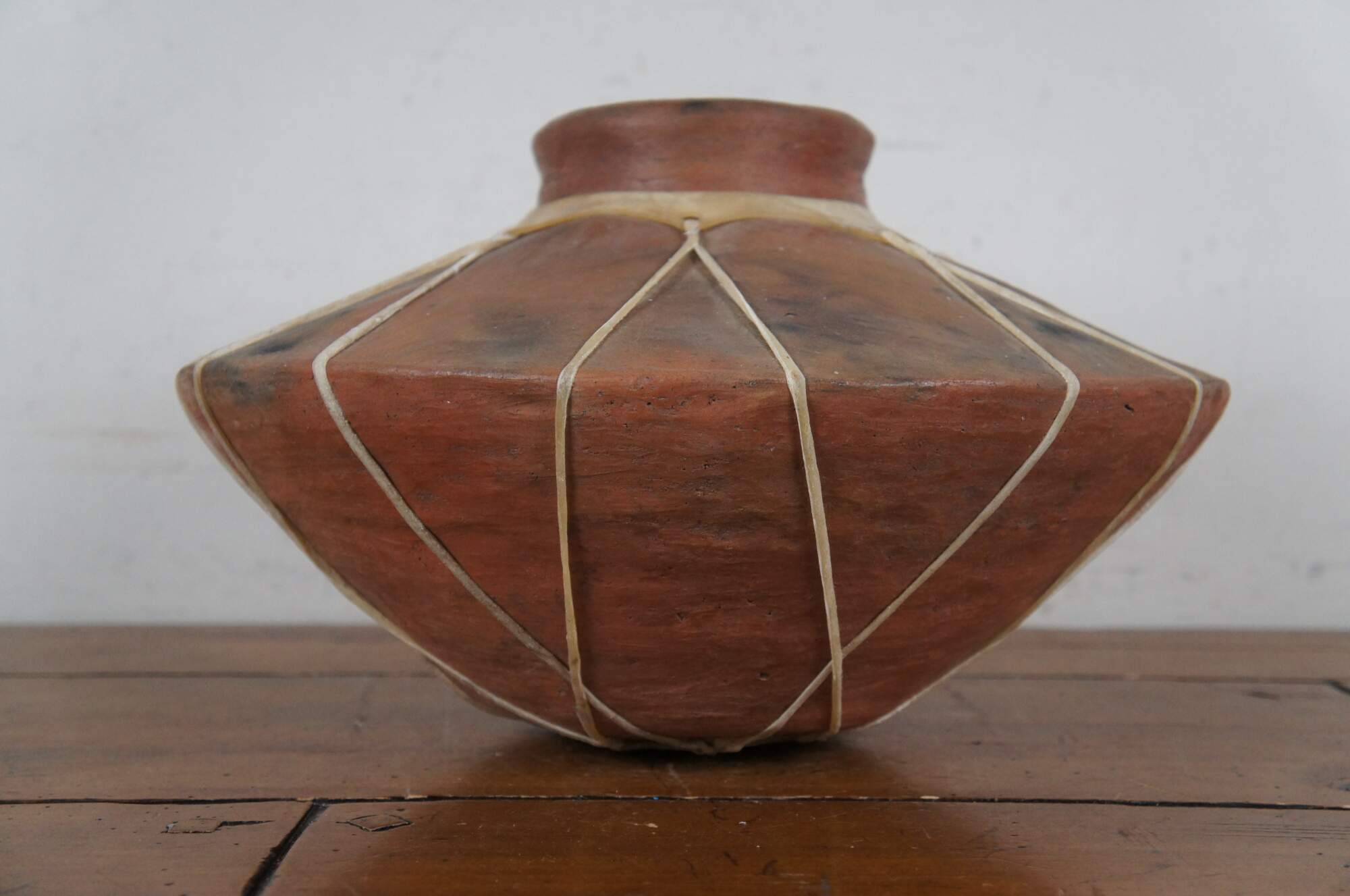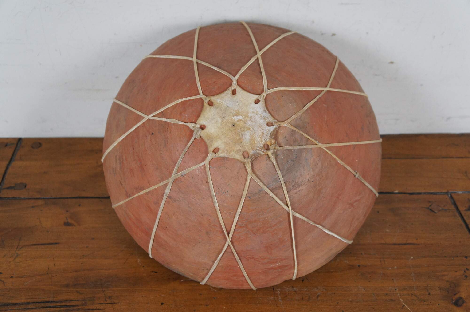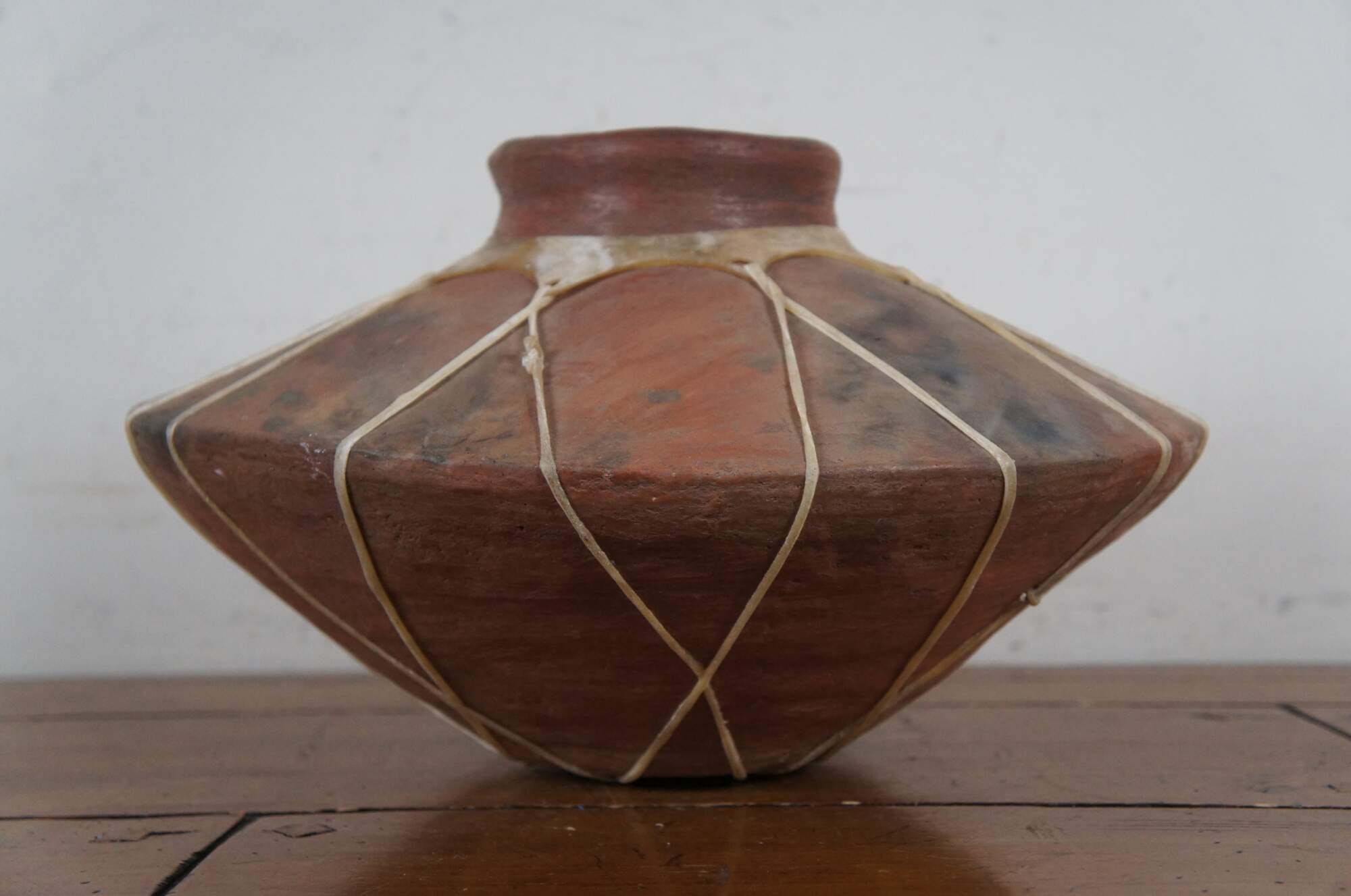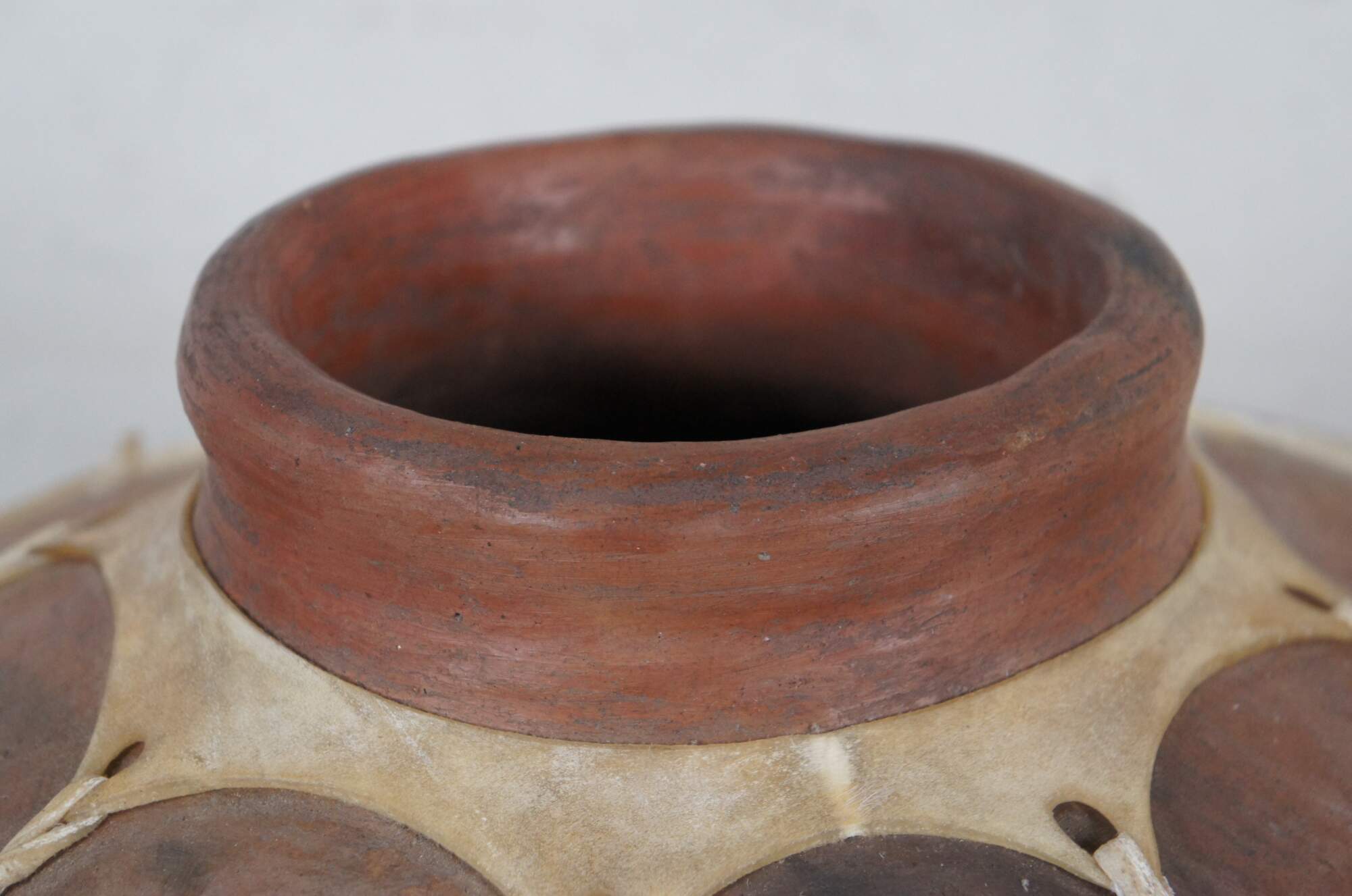 Vintage 20th century Native Tarahumara Mexican / Southwestern olla / water pot. Made of red clay / terracotta by the indigenous tribal Indians, it features a round, saucer-like form with tapering triangular base and top, bound with stretched pieces of leather / sinew.