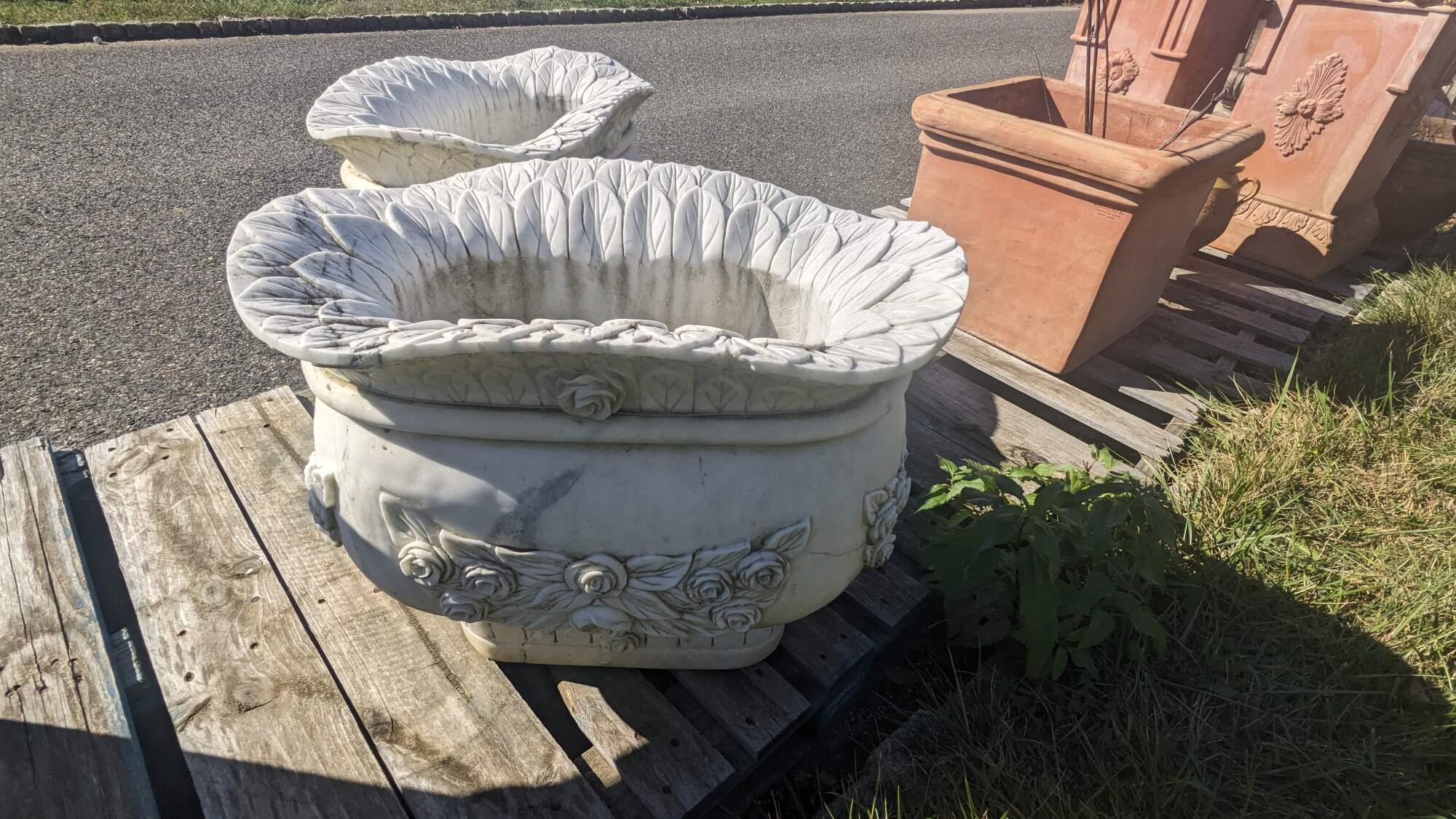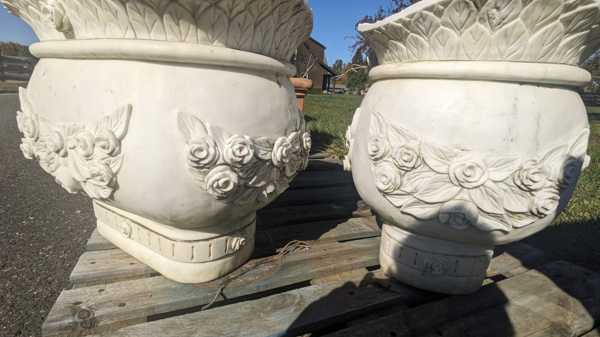 A stately pair of Italian Marble rose jardinière urn planters. Each massive pot is beautifully decorated with a rose and leaf motif. The bowl or lip is uniquely flared with a camelback shape. A beautiful set that will make a wonderful addition to any garden, path, entry or staircase. Approximately 350 lbs each