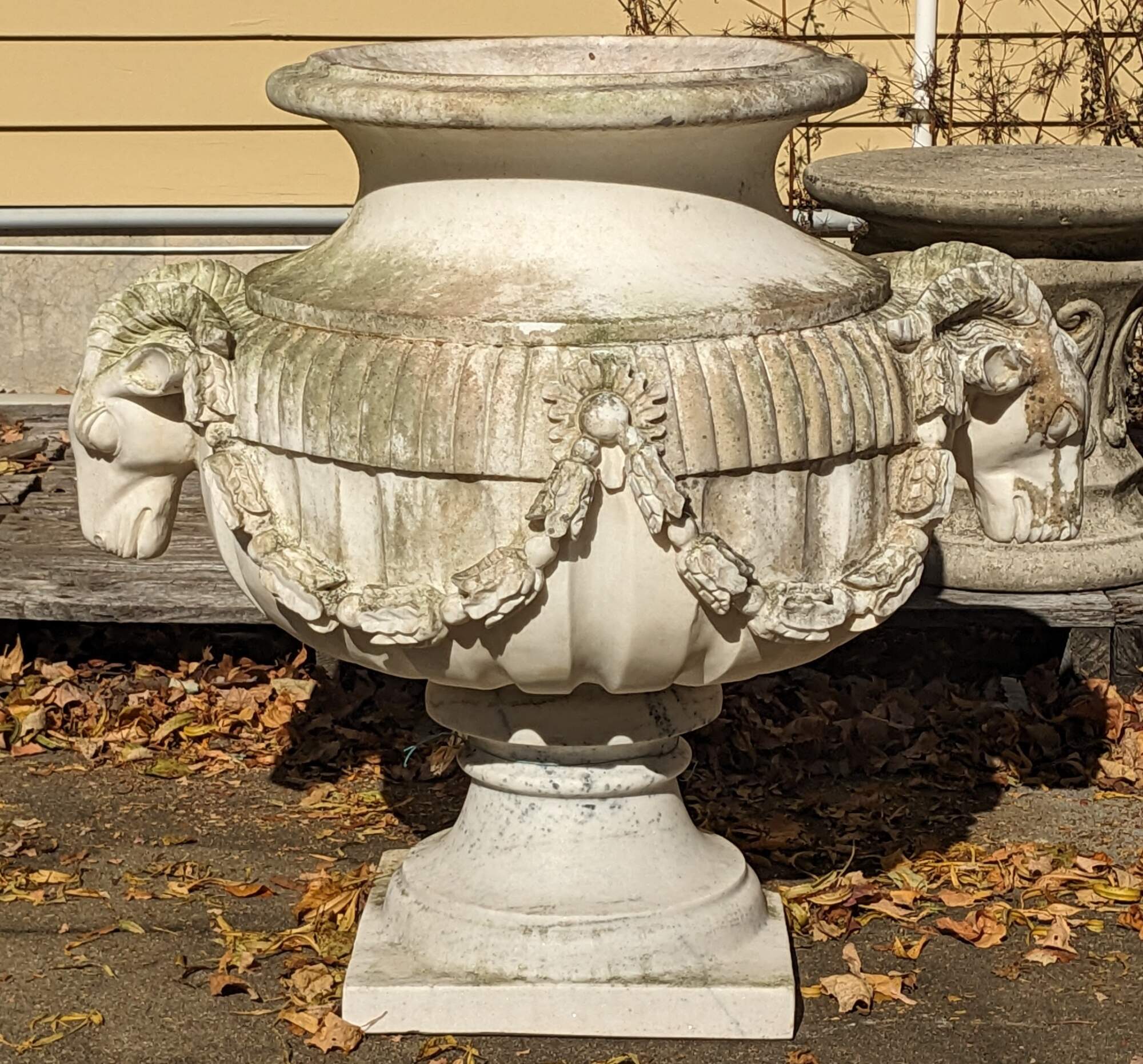 Stately pair or Figural Italian made Grecian style urn over stands. Each is beautifully crafted from marble with Ram / Goat heads at each side. Features a foliate drapery motif connecting each ram head and fluted / reeded exteriors.