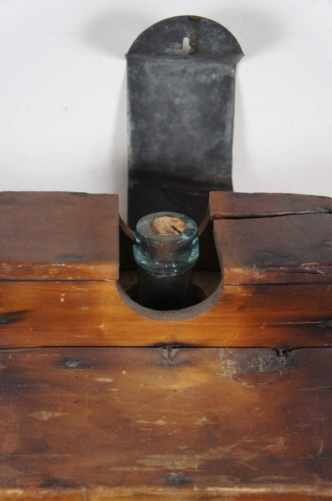 Late 19th century antique demijohn - an overzied wine bottle in pale blue glass with cork stopper - and hardwood tantalus style wine box / storage crate with lockable metal flap on top. Stamped on front G.W. Banker of New York. Circa 1880s.