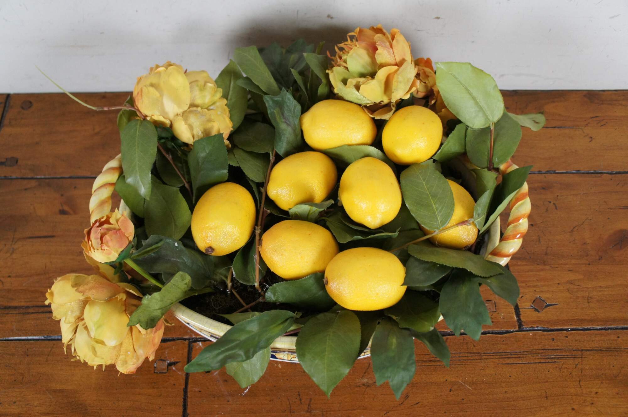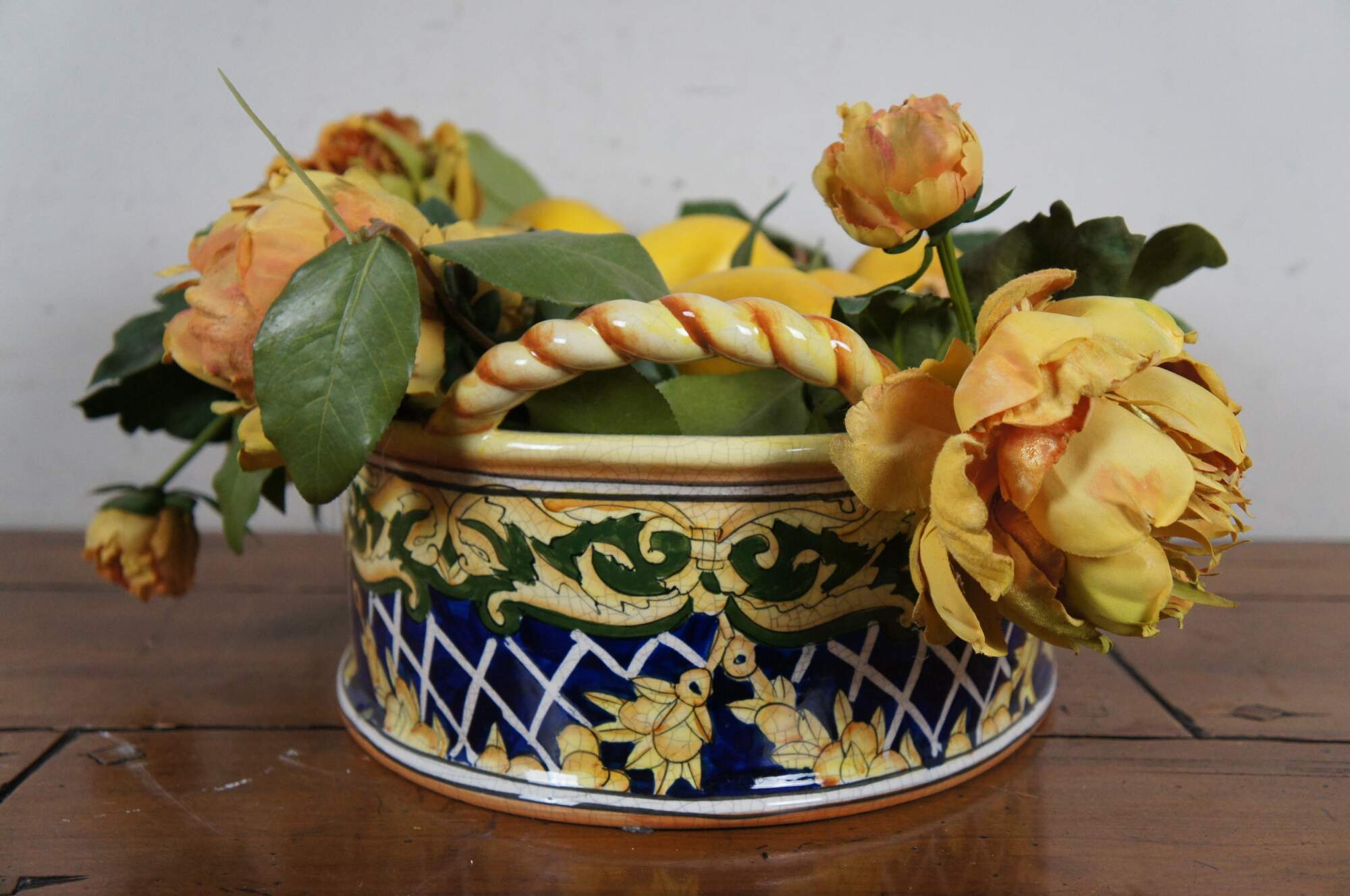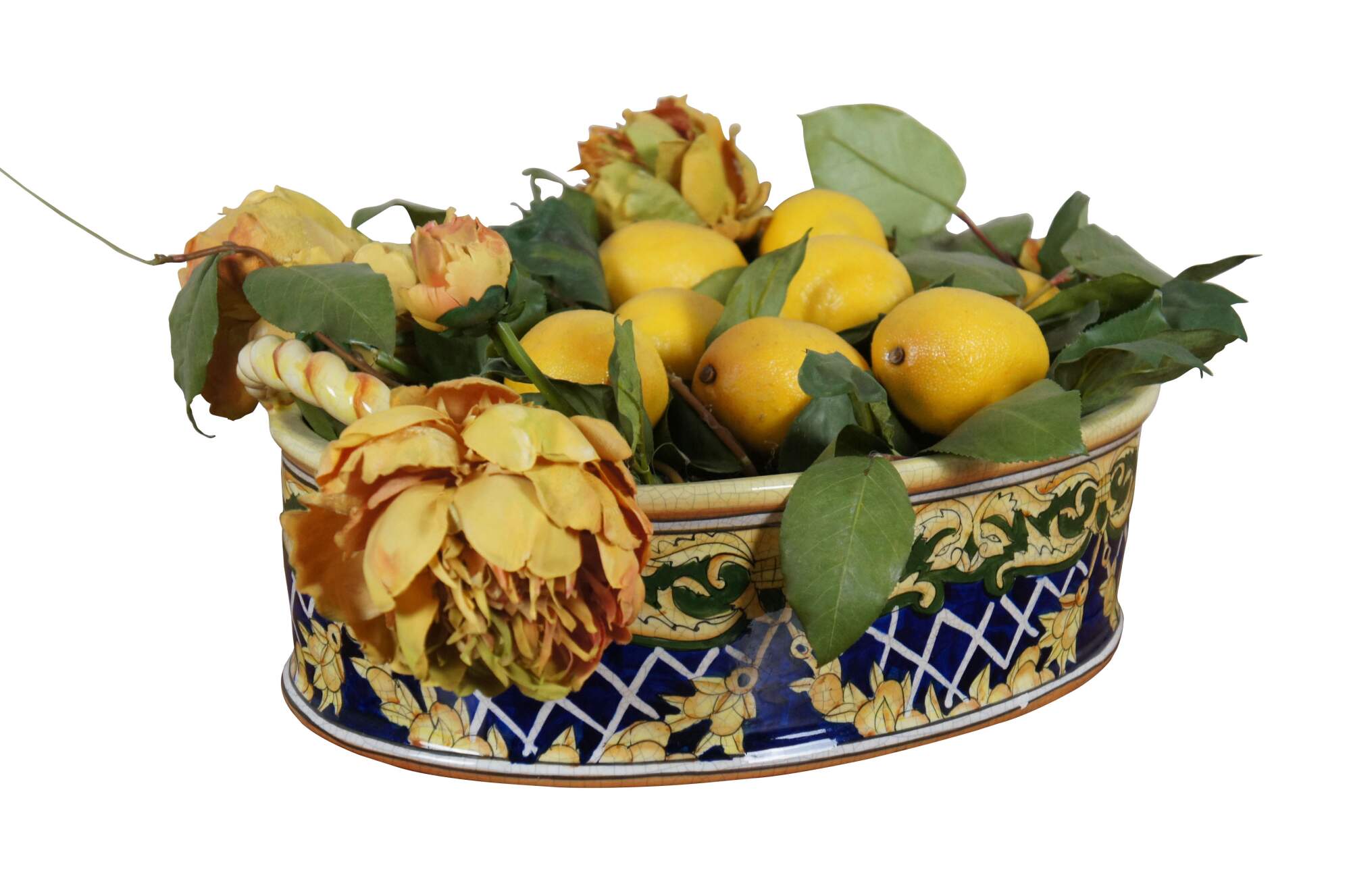 Late 20th century deruta / Italian majolica style ceramic planter / jardiniere. Oval form with rope twist, basket style handles, painted with a blue and white foliate design accented with golden foliate swags of lemons. Filled with artificial yellow peony blossoms and lemons. Made in China. Not for Food Use. For Decorative Purpose Only.