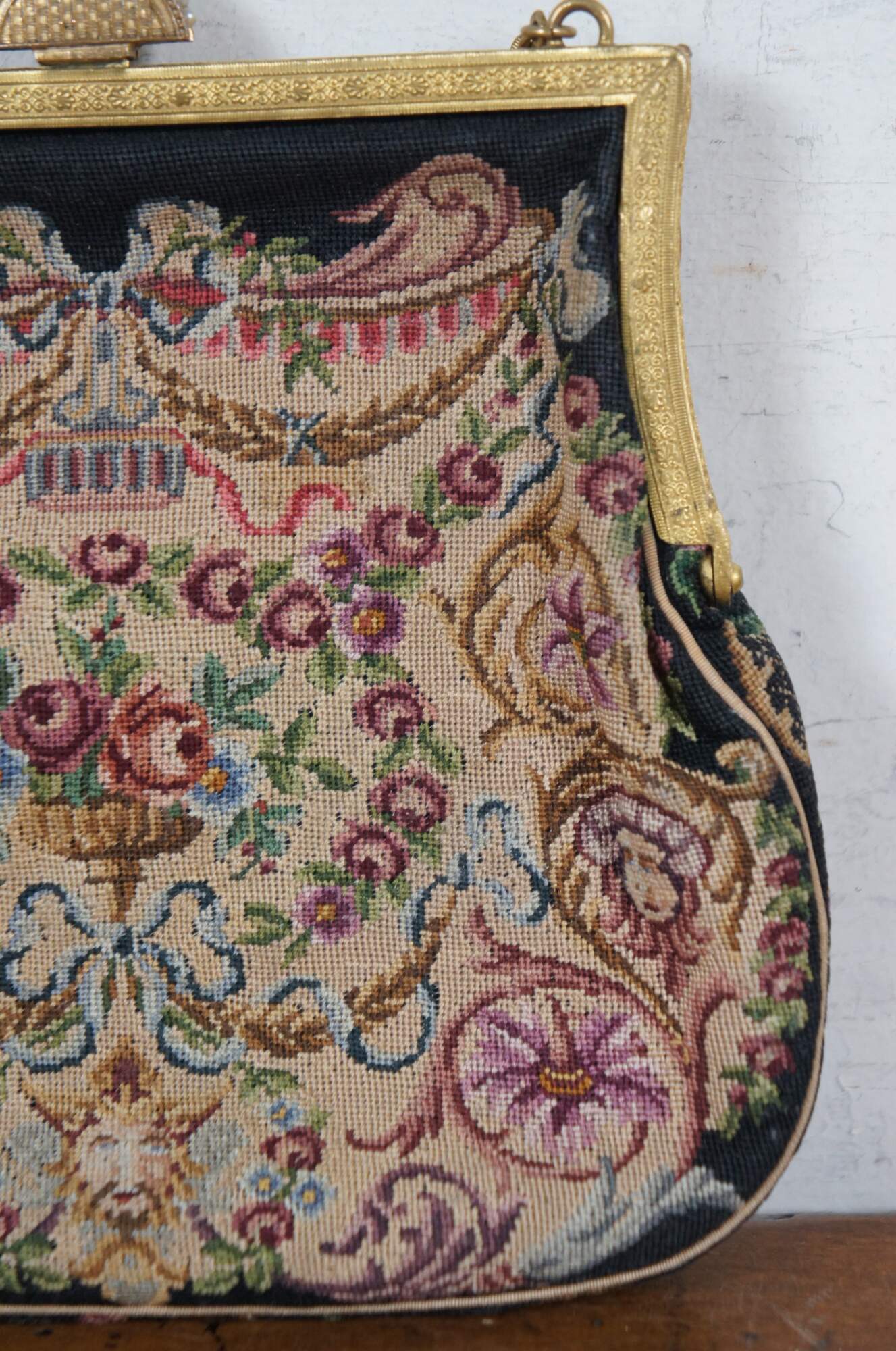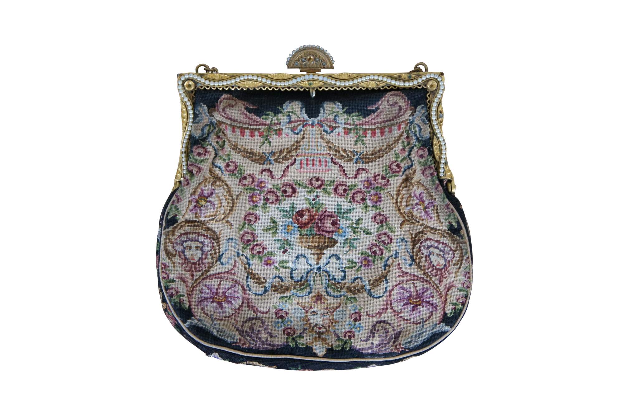 Early to mid 20th century petit point embroidered tapestry evening bag / purse, featuring an intricate design of flowers, foliates, and faces. Patterned gold tone clamshell clasp with fan shaped catch, decorated with rhinestones and faux seed pearls. Tan fabric interior with two slip pockets. Gold tone cable chain strap.