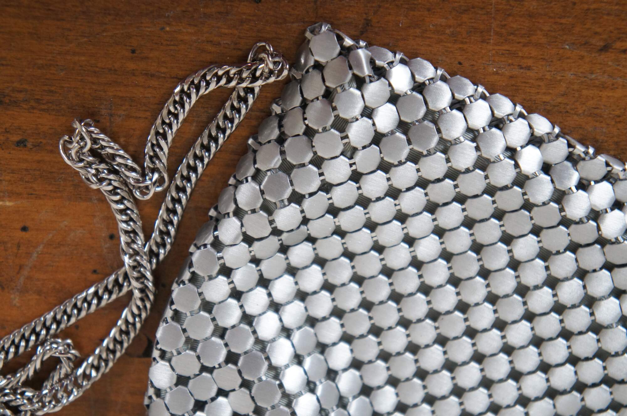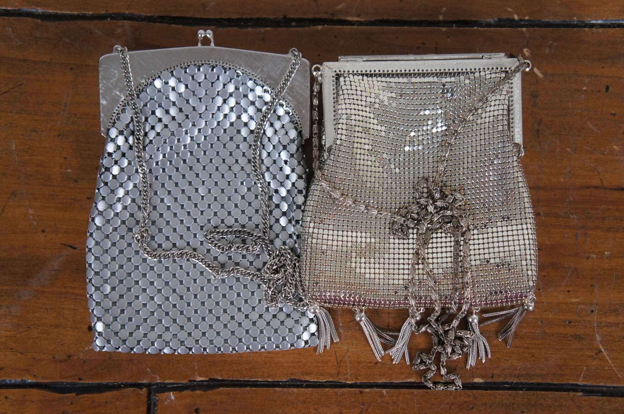 Pair of early to mid 20th century silver tone metal mesh purses / evening bags. One by Whiting & Davis features a bruched silver mesh with brightly polished clasp molded with an art nouveau motif of flowers and cherub; gray fabric lining; curb chain shoulder strap. The other (unmarked) features bright silver mesh with five metal tassels suspended from the base and an art deco flip top clasp; scroll/snail chain shoulder strap; gray satin lining.