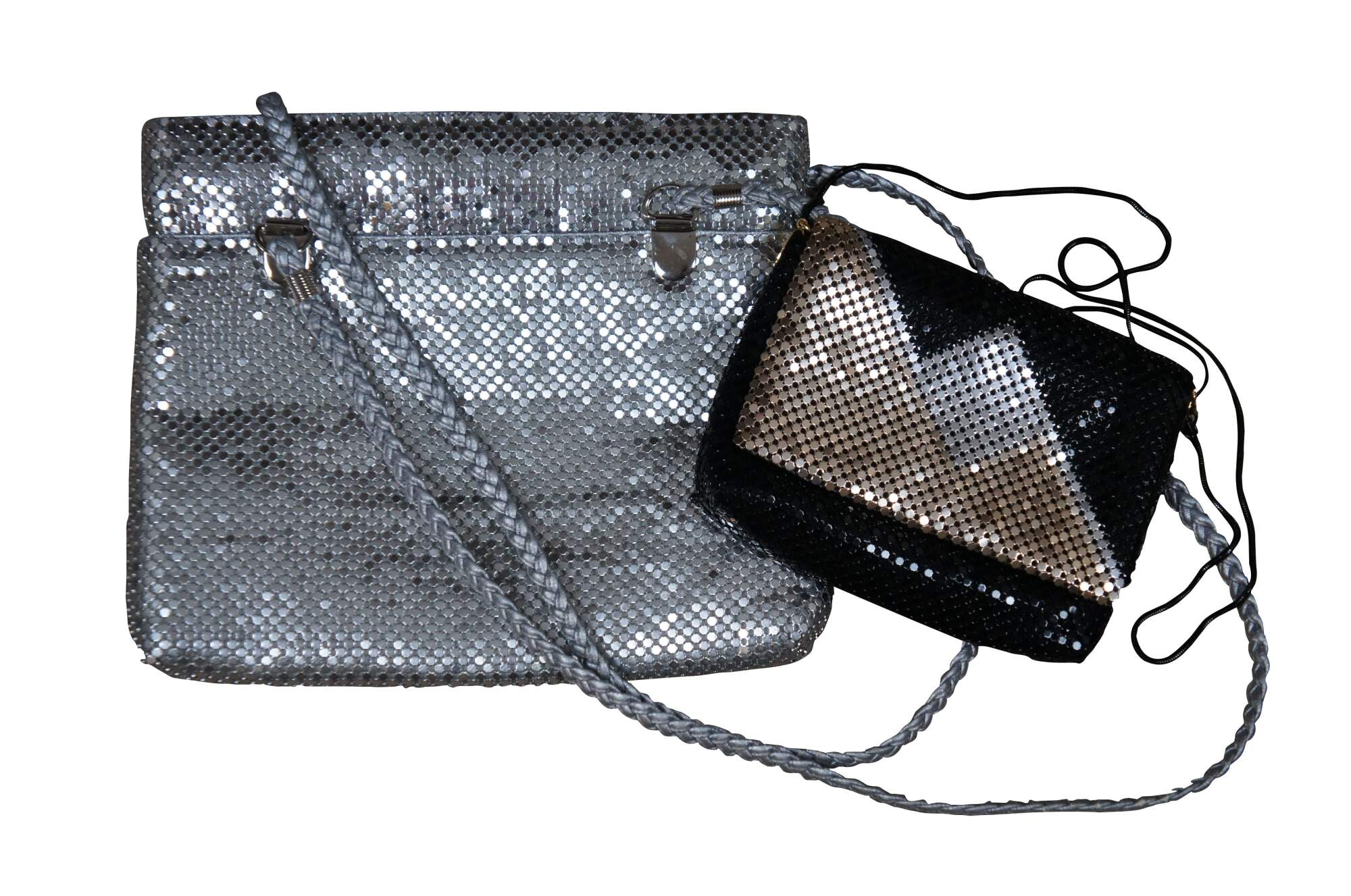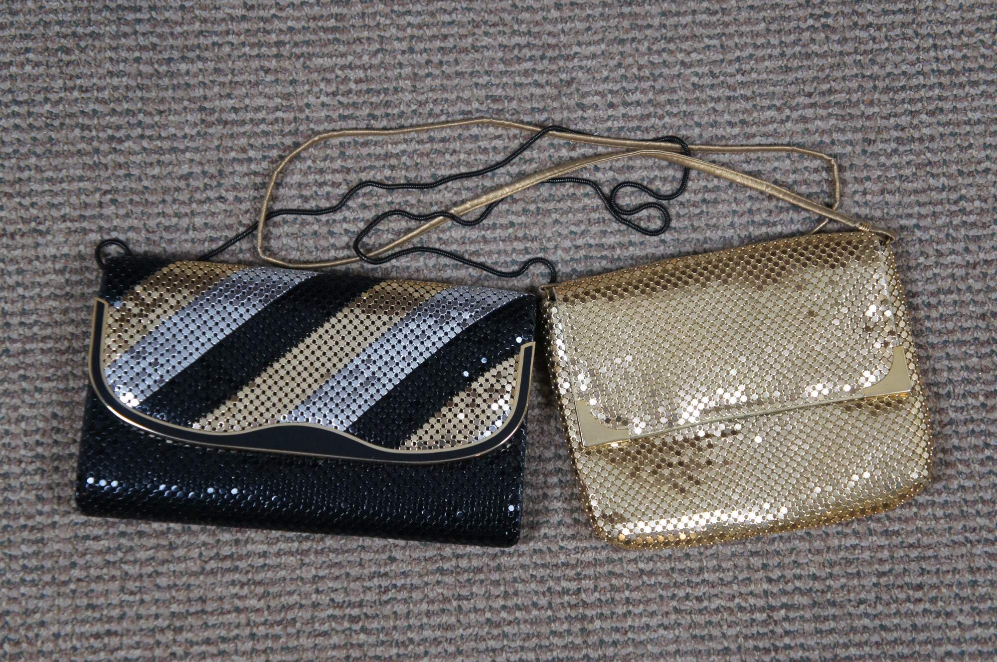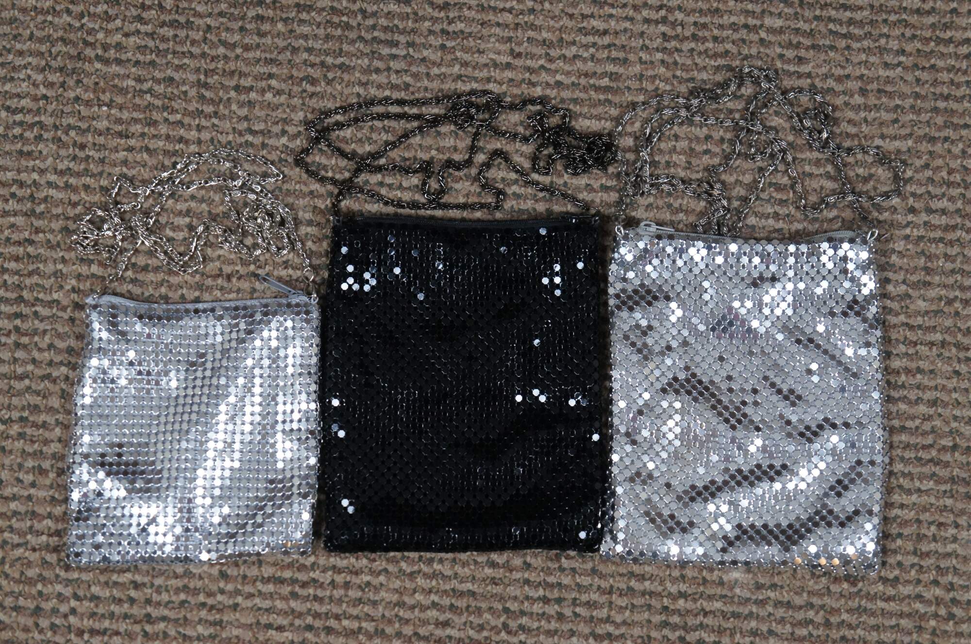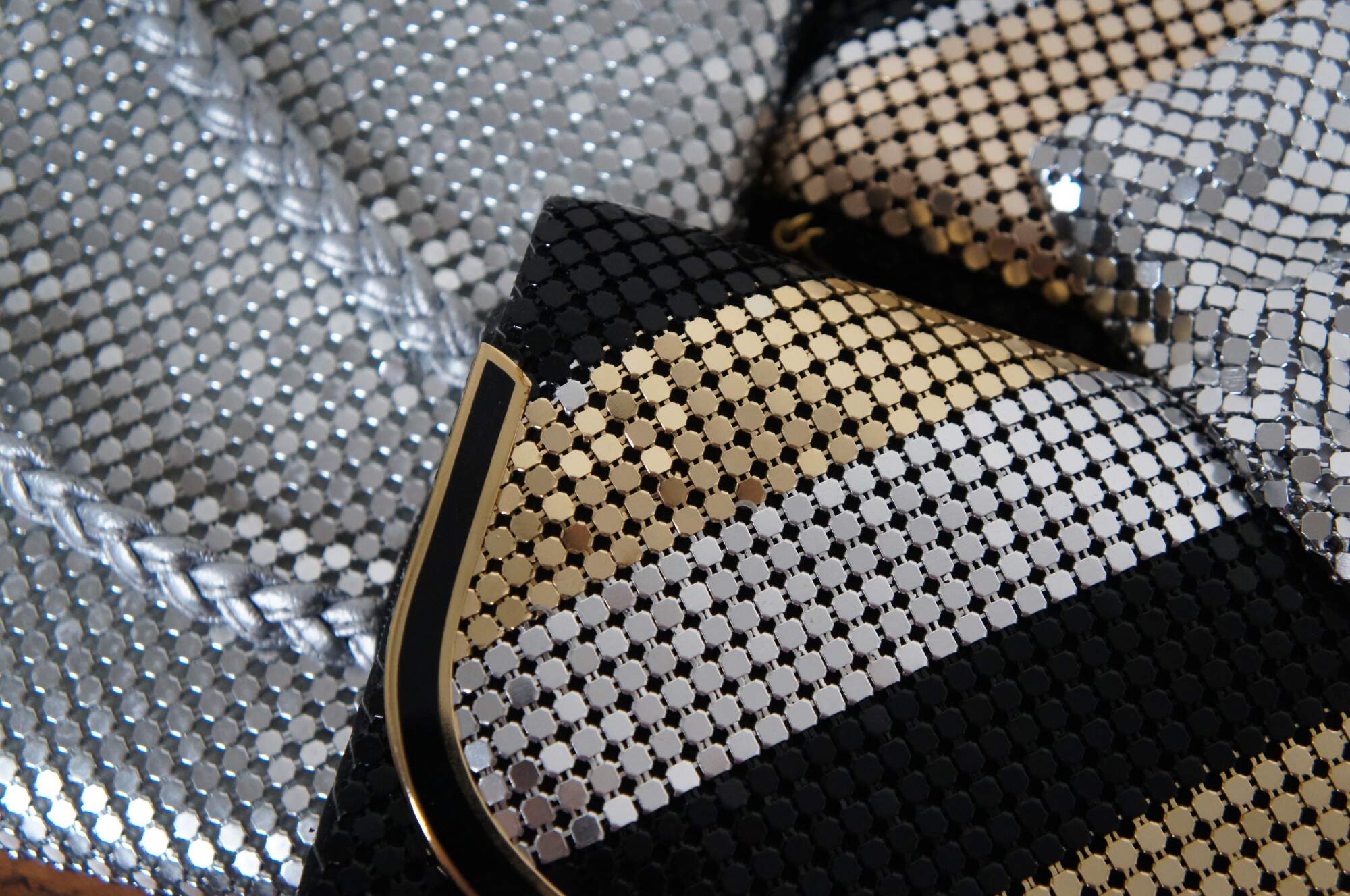 Lot of 11 late 20th century metal mesh evening bags. Four silver, two gold, three black, and two with black gold and silver flaps. Brands include: Y&S, Twilight Collection, La Regale Ltd, Style & Co. Made in China / Hong Kong / Taiwan.