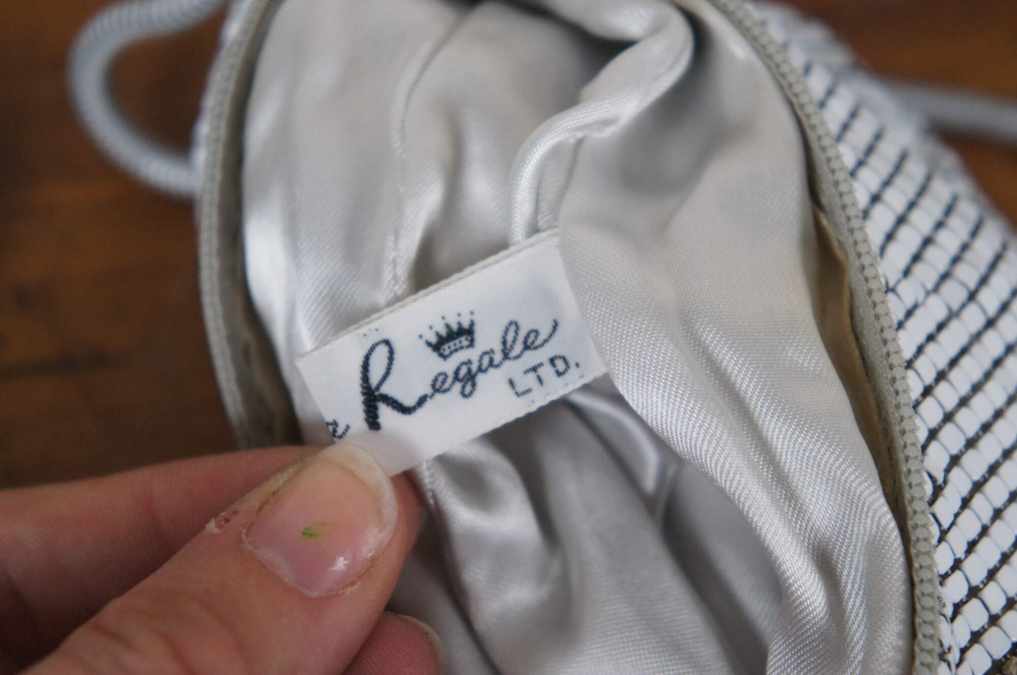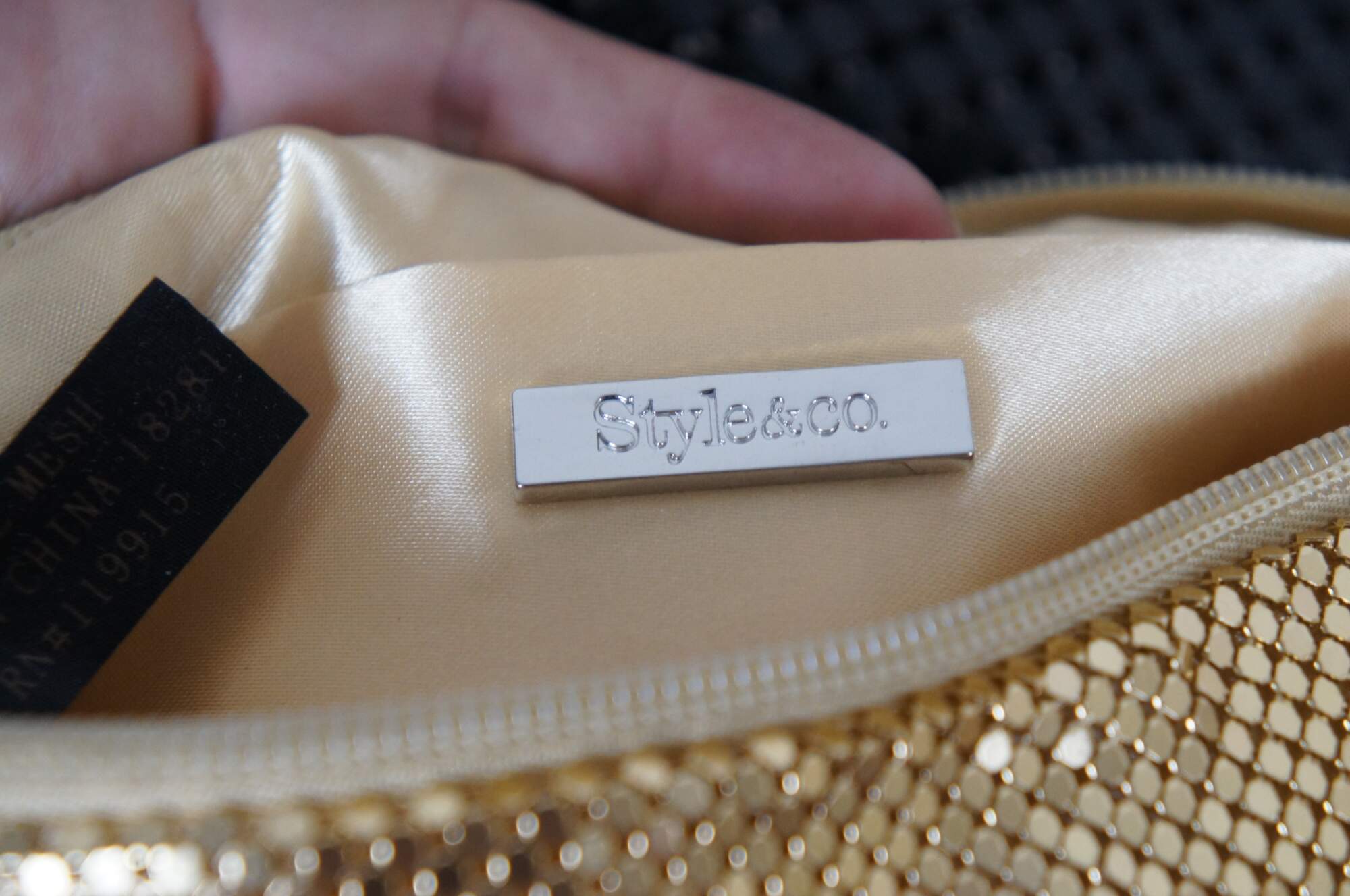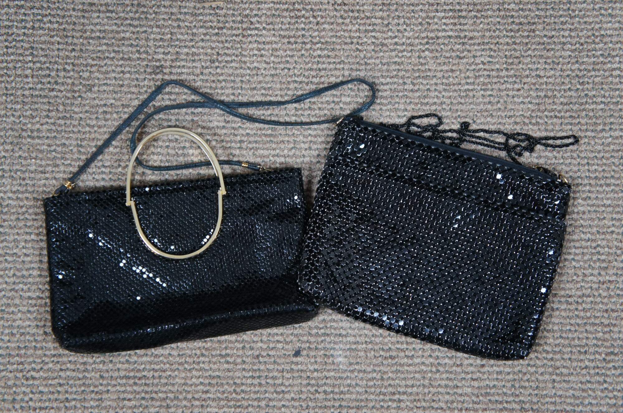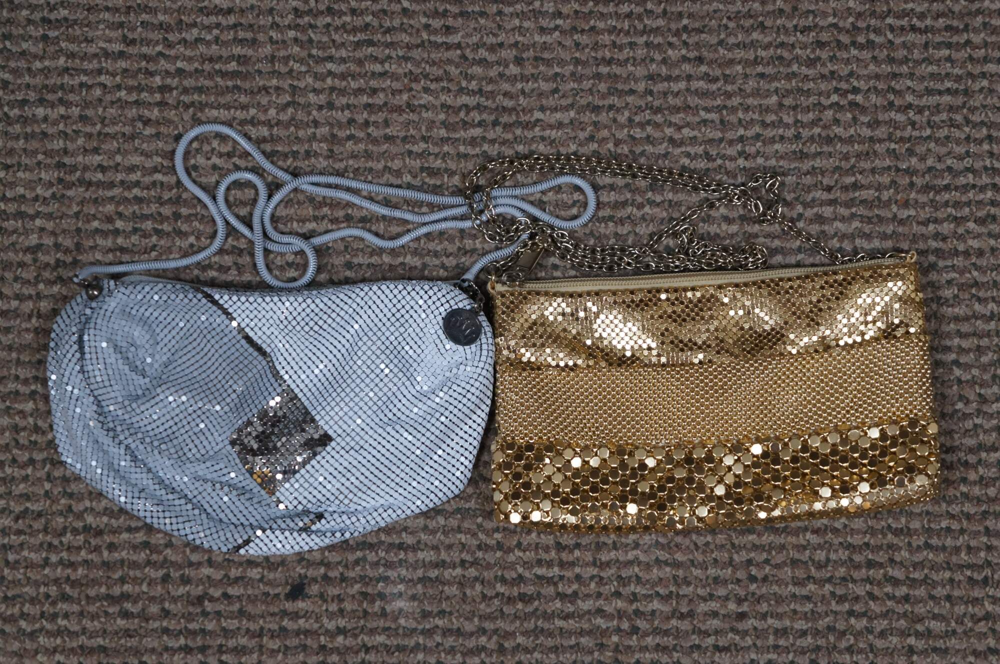 Lot of 11 late 20th century metal mesh evening bags. Four silver, two gold, three black, and two with black gold and silver flaps. Brands include: Y&S, Twilight Collection, La Regale Ltd, Style & Co. Made in China / Hong Kong / Taiwan.