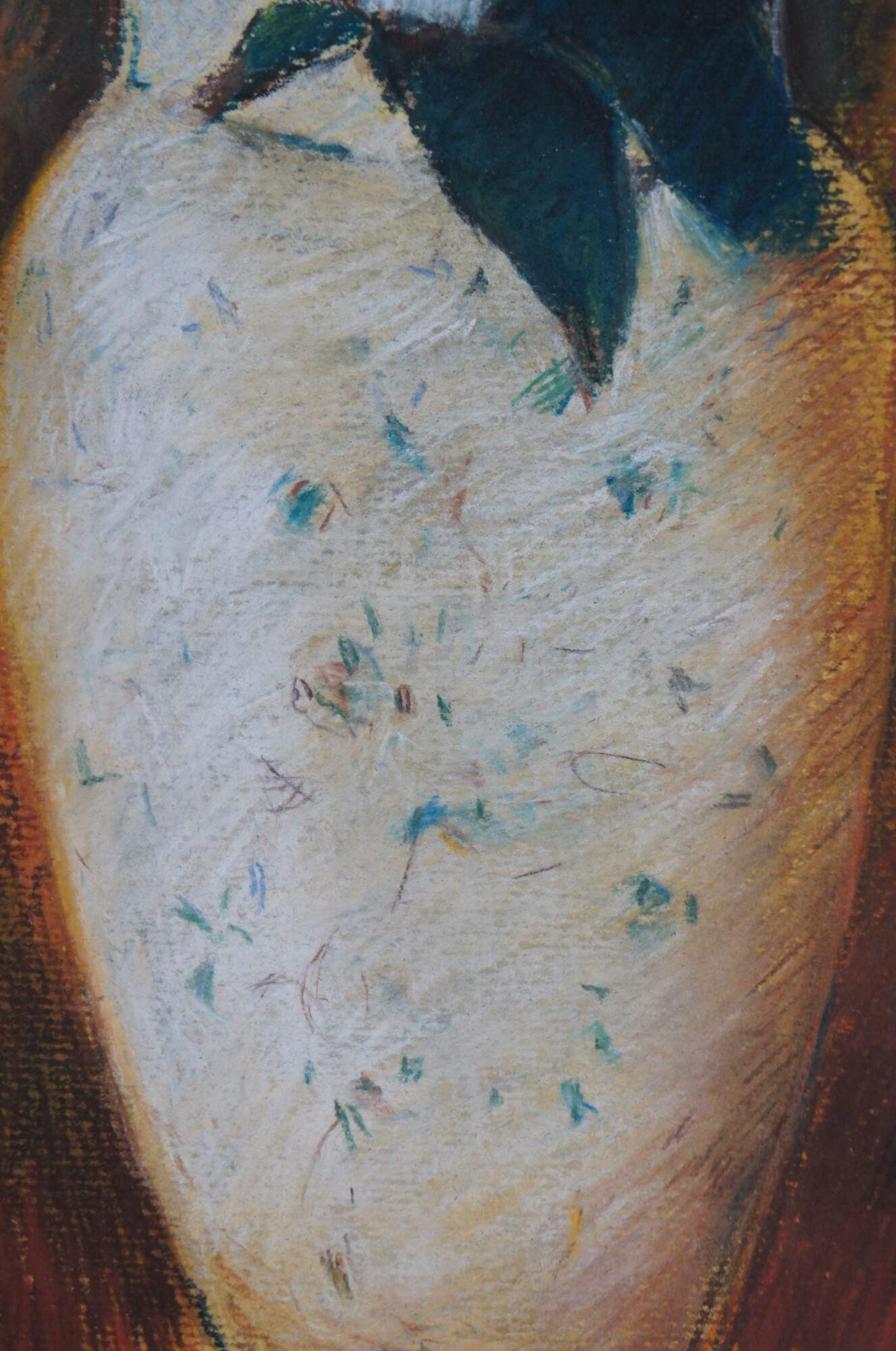 Late 20th century print on board after the pastel painting "Large Bouquet In A Japanese Vase" by Odilon Redon. Depicts a multicolored bouquet of flowers in a white vase on a mottled background. Gold beveled frame with white linen border.