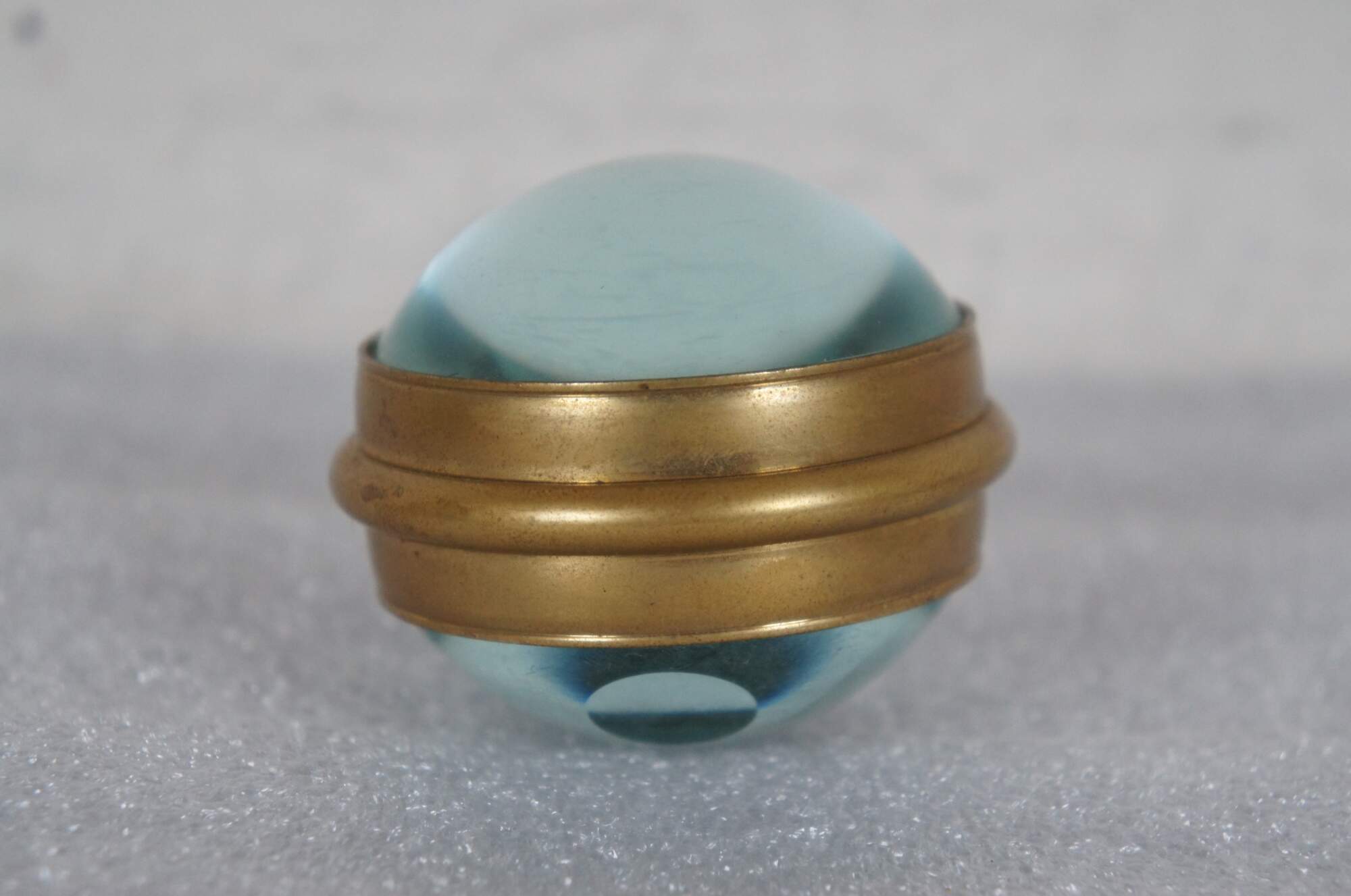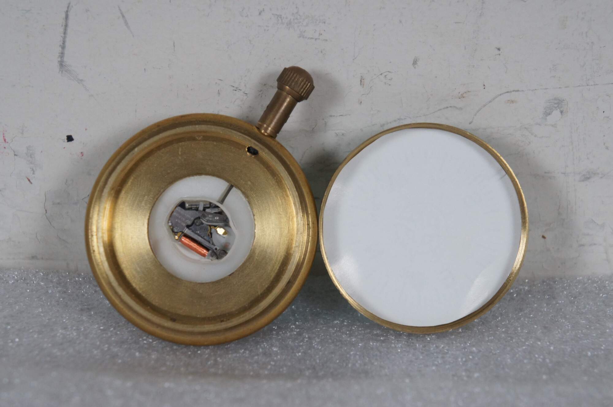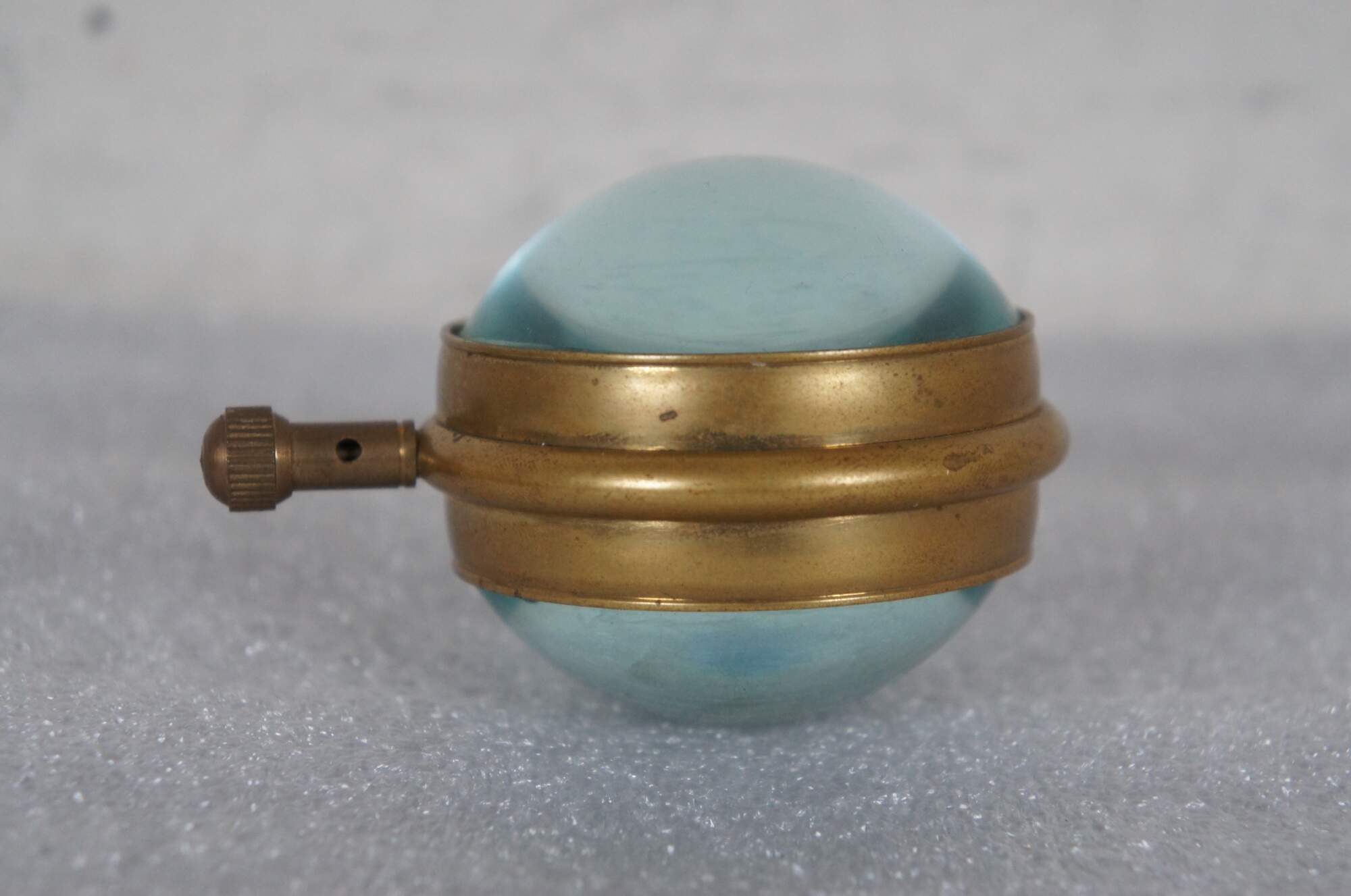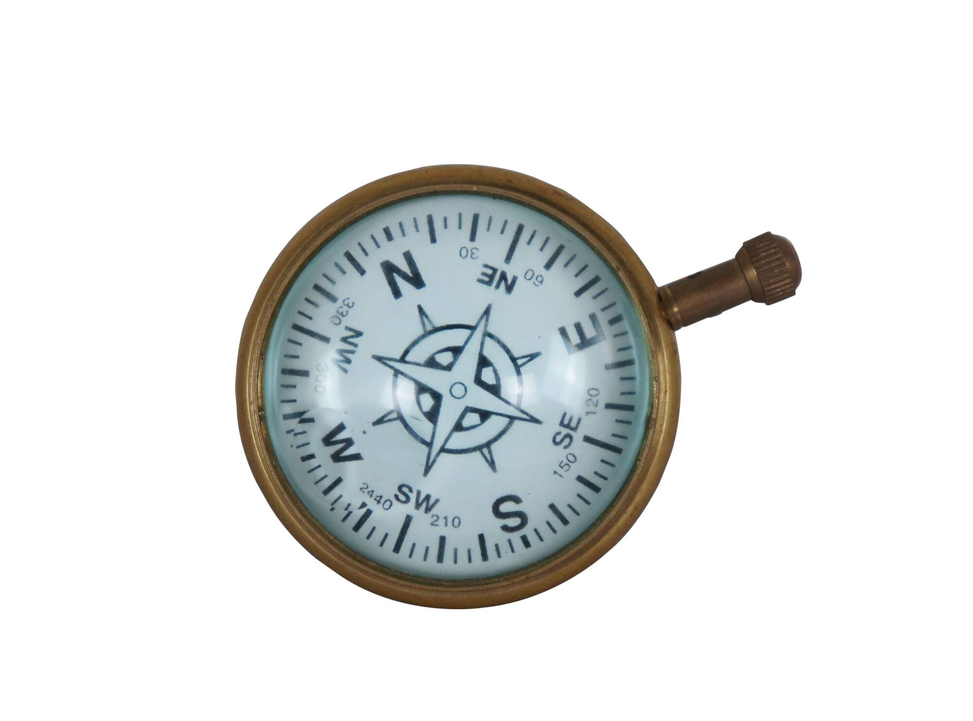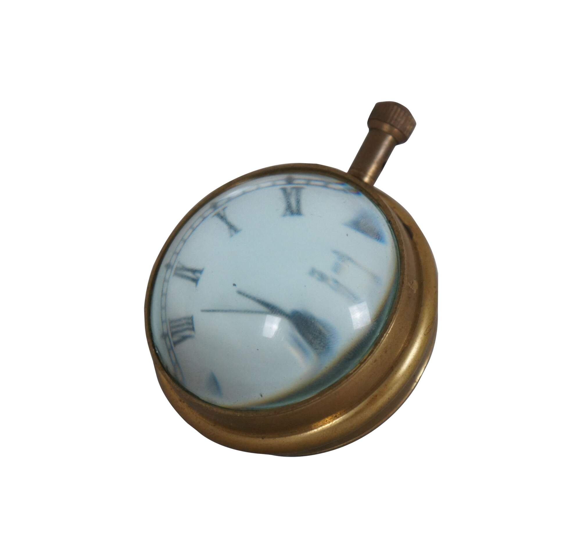 Late 20th century bubble glass desk clock - pocket watch shaped brass frame with orb shaped bubble glass front and back. White clock face with black Roman numerals and hand, marked 1939. Reverse is printed with a faux compass. Battery operated movement.