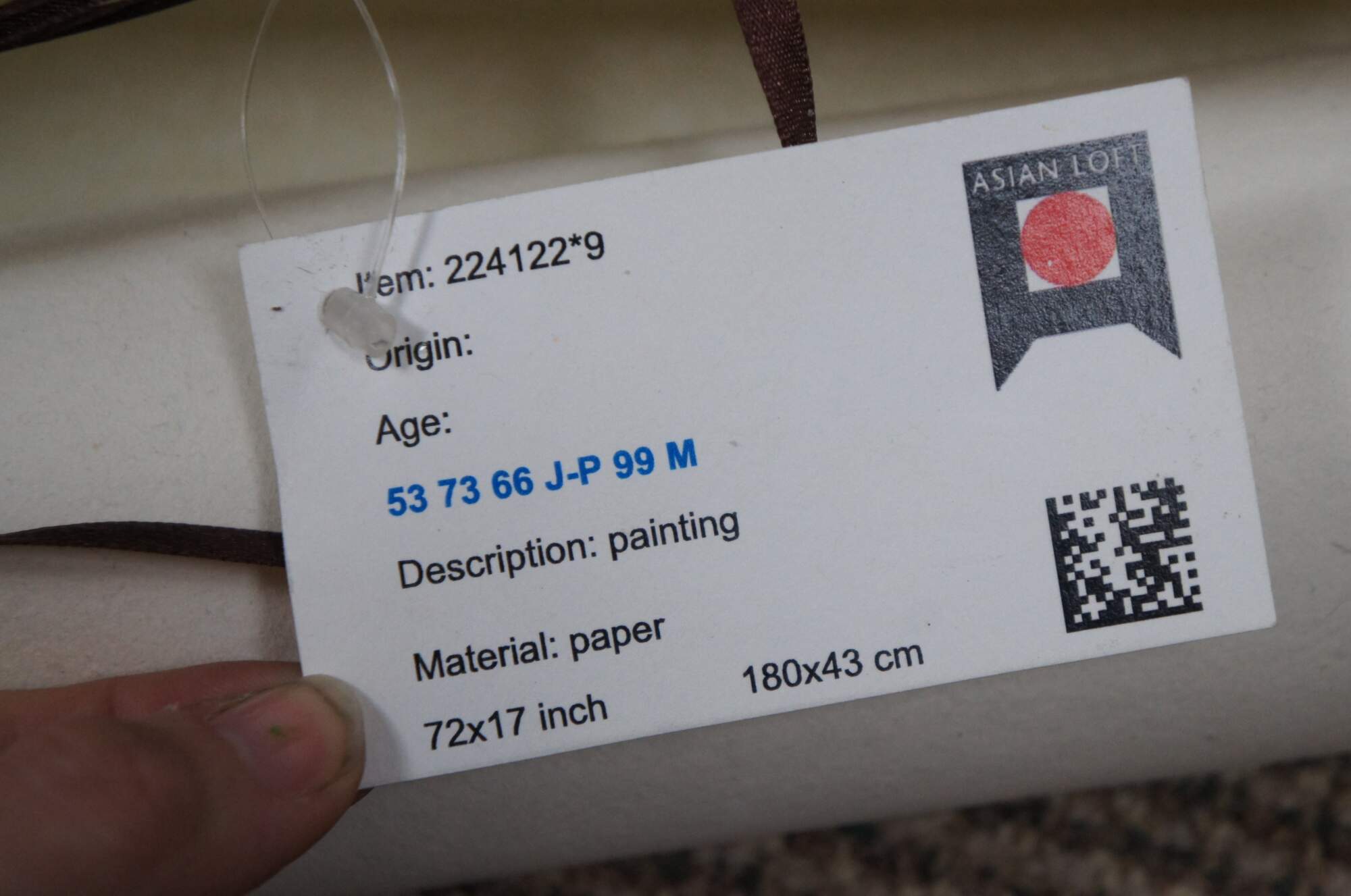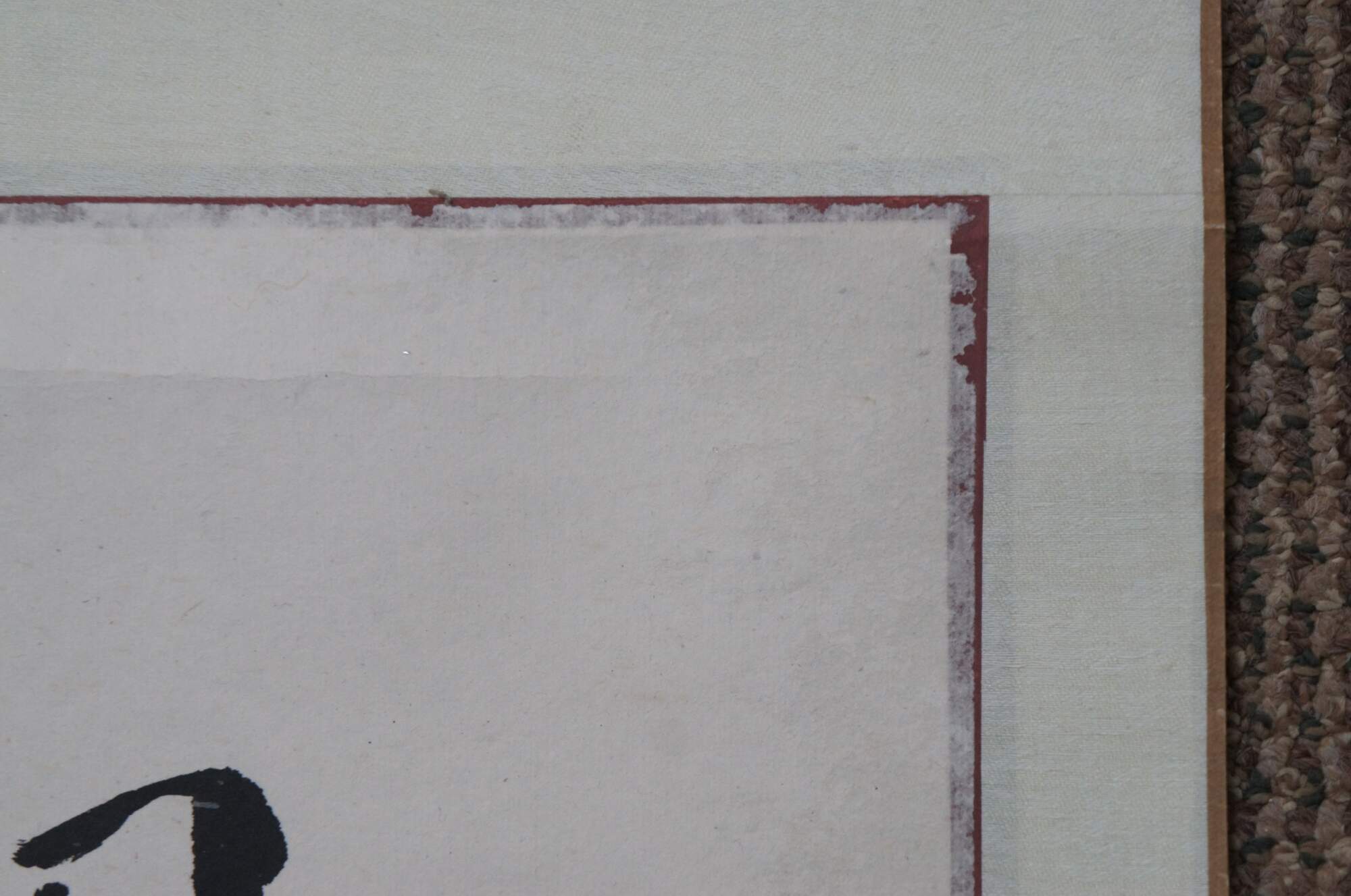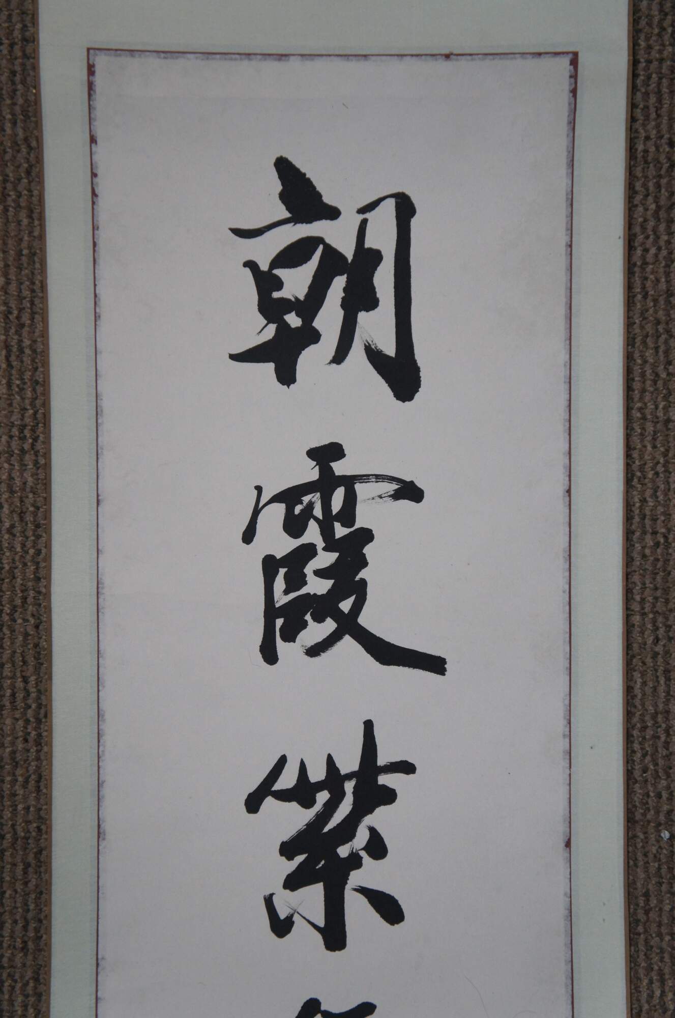 Vintage 20th century wall hanging paper scroll featuring a simple design of Chinese calligraphy in black and white.