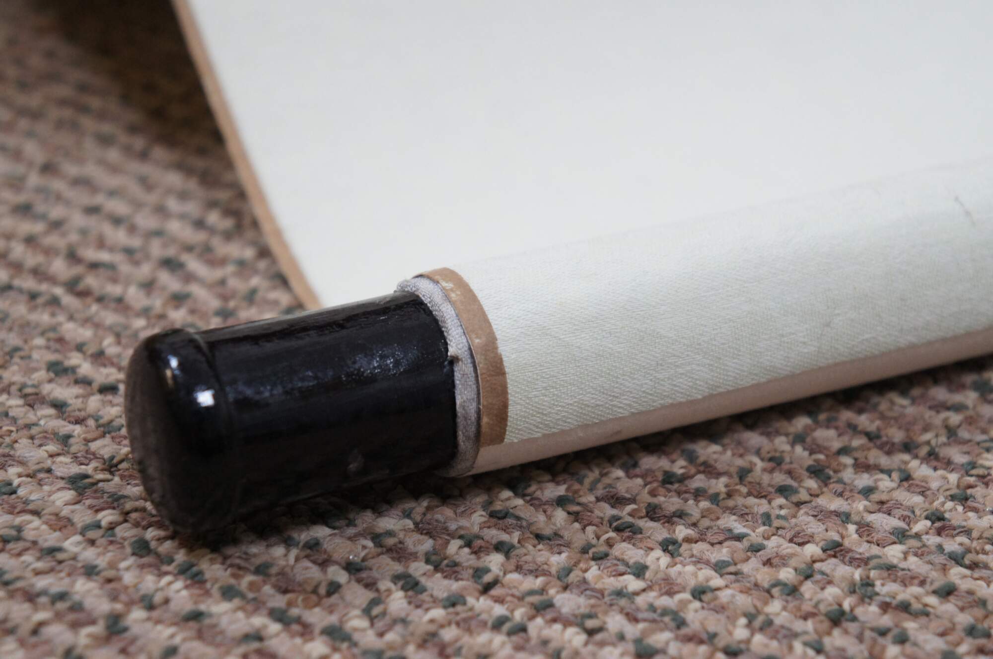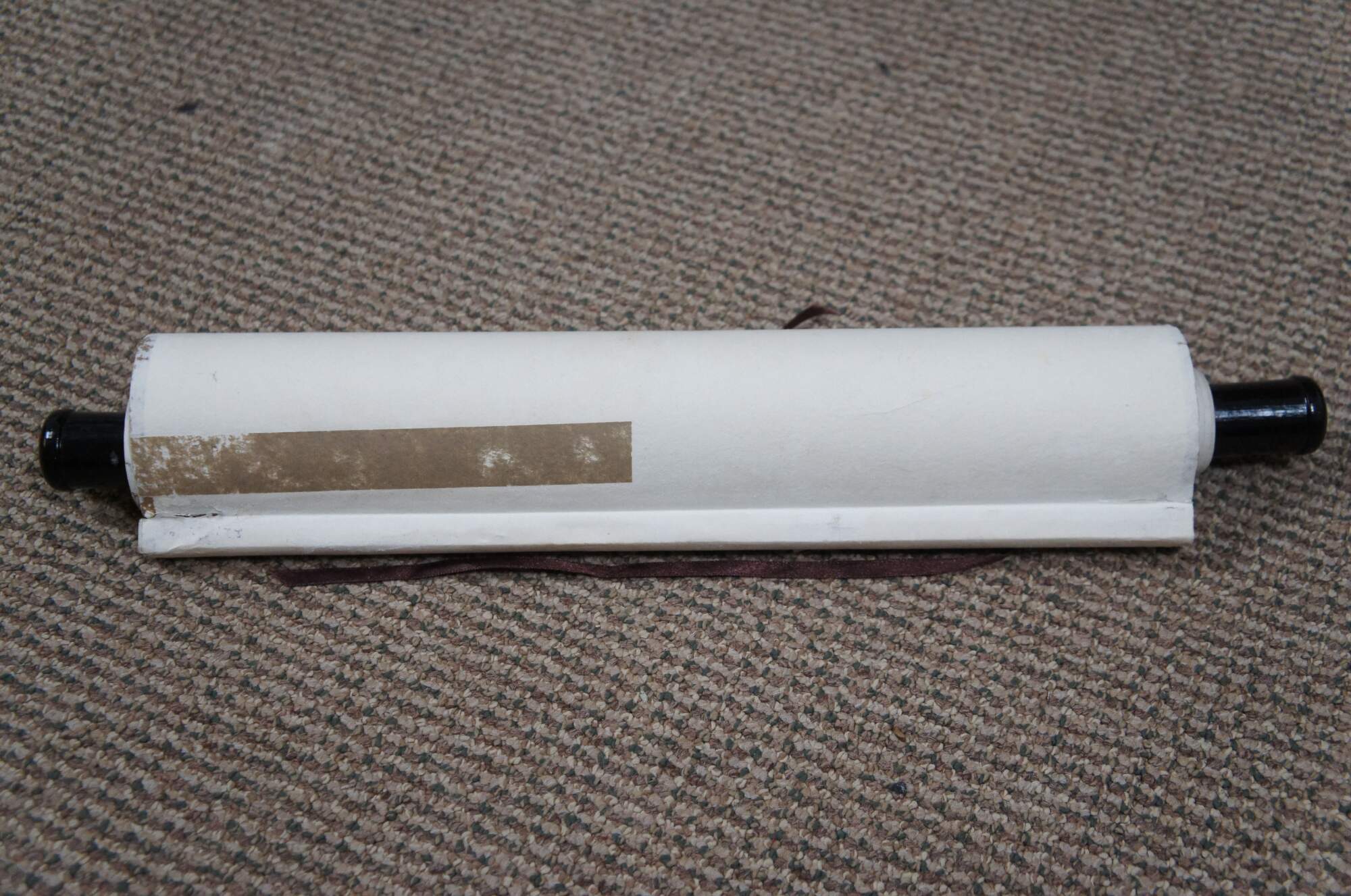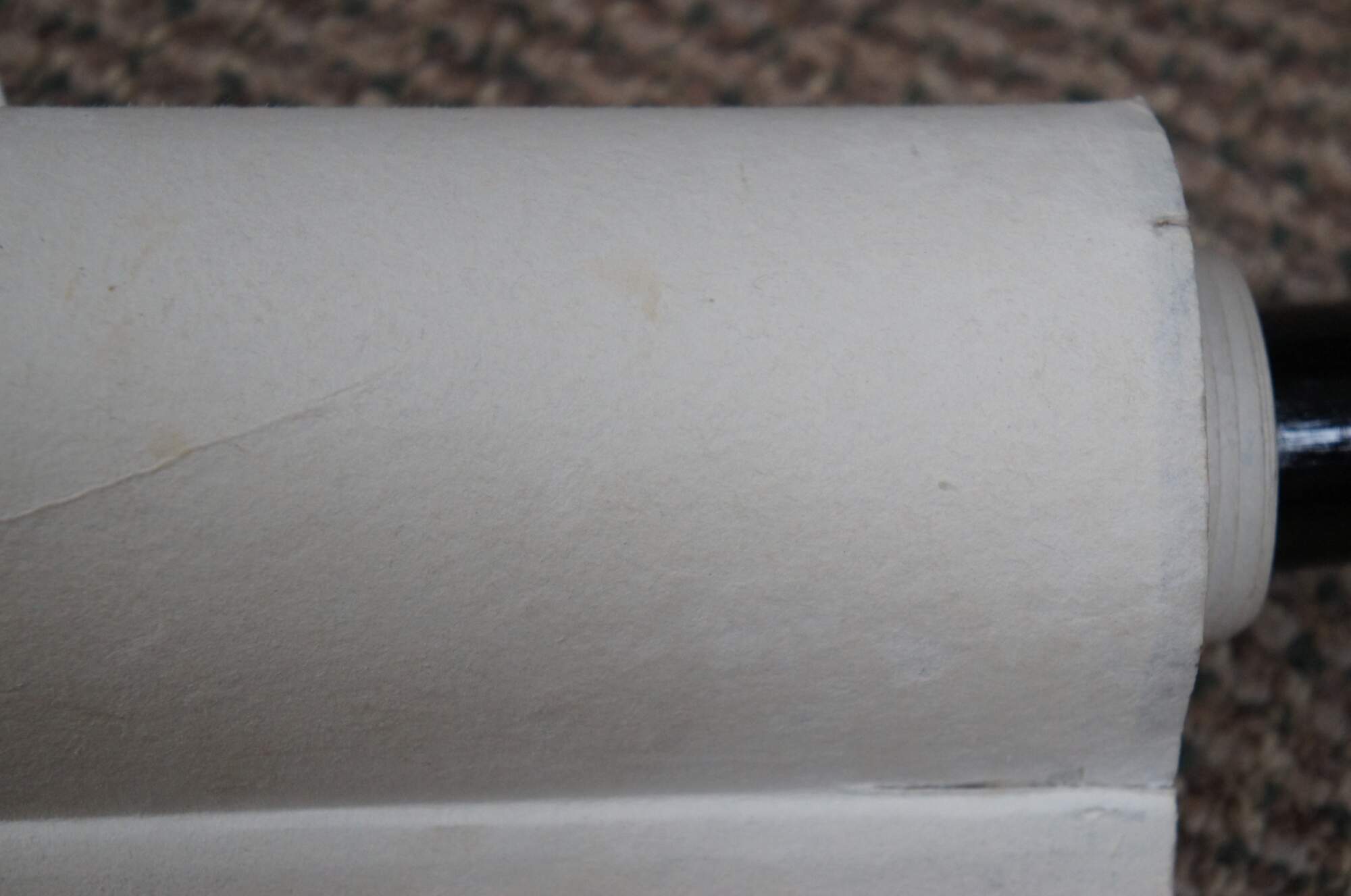 Vintage 20th century wall hanging paper scroll featuring a simple design of Chinese calligraphy in black and white.