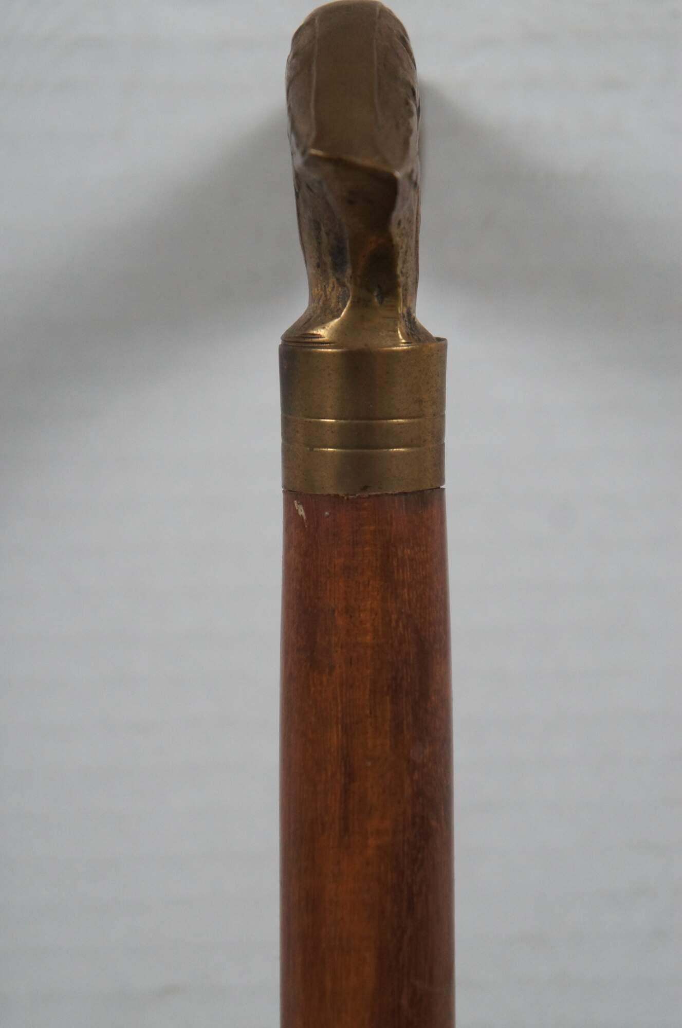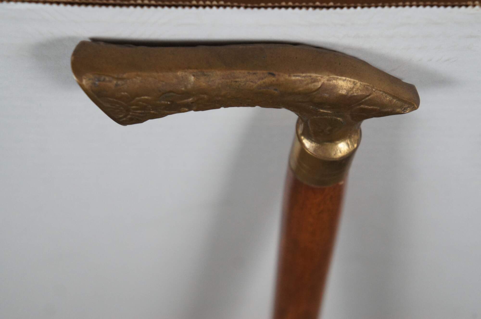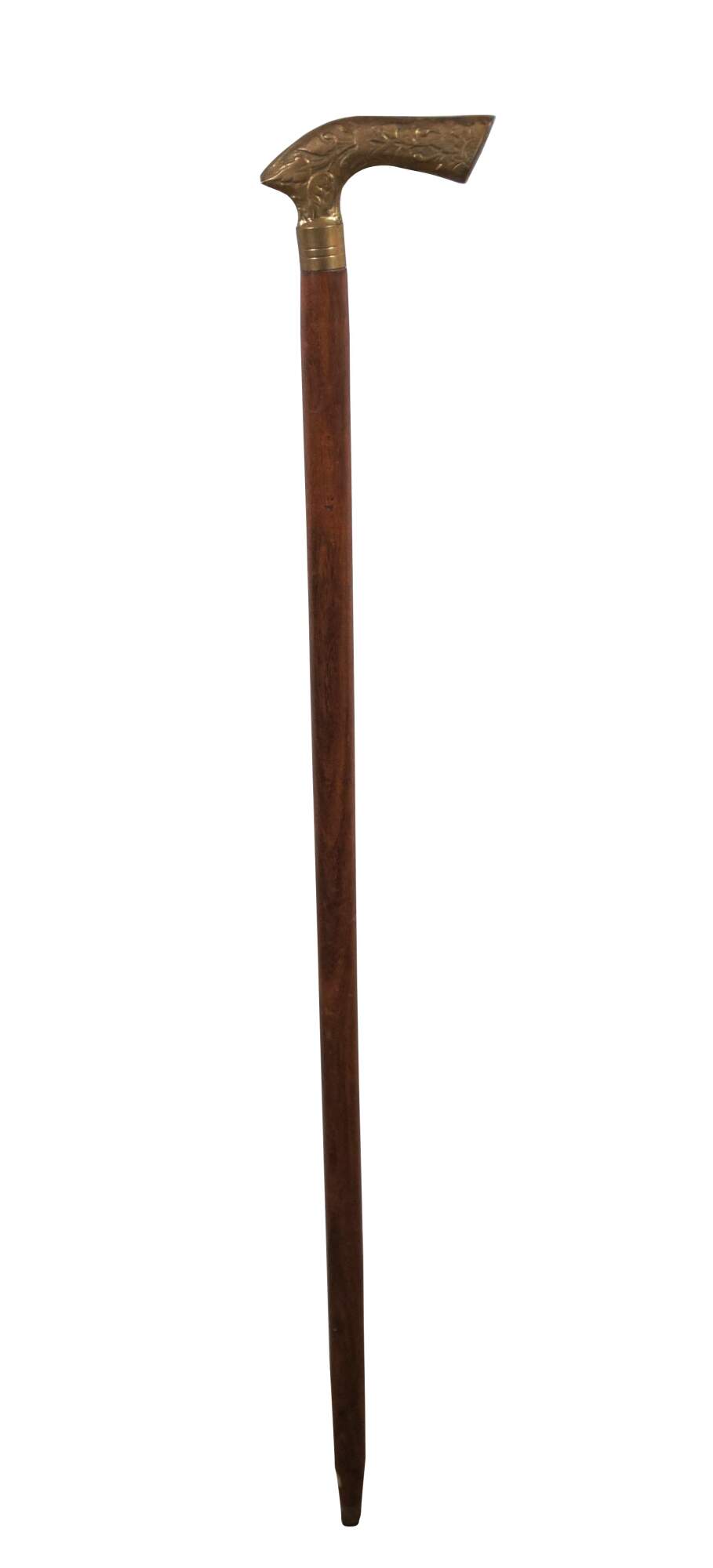 Late 20th century hardwood cane / walking stick with foliate embossed brass Derby / Fritz style handle. Made in India.