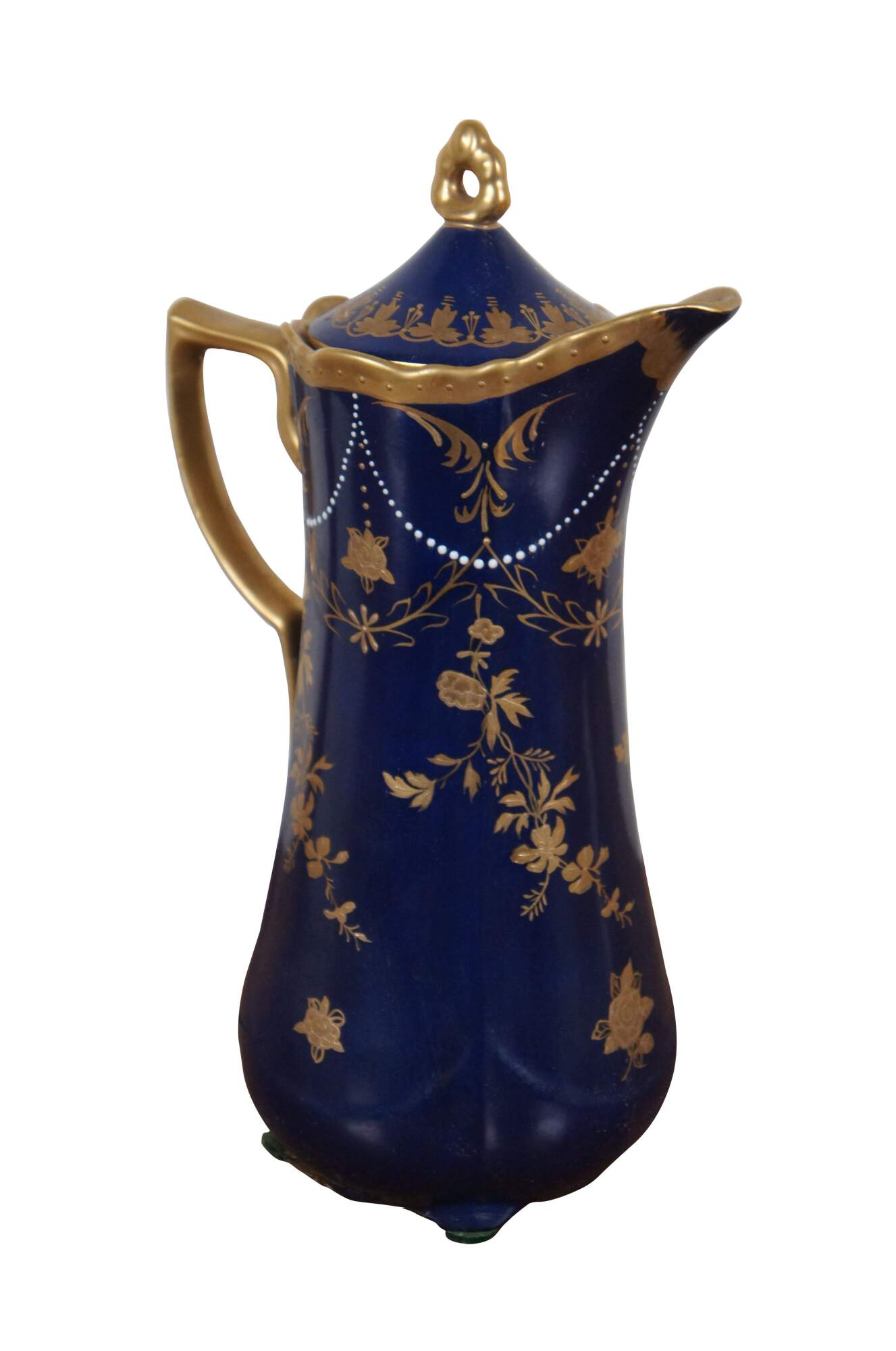 Late 19th to early 20th century porcelain tea / coffee / chocolate pot glazed in deep cobalt blue, decorated with slightly raised Neoclassical gilt swags of folaite and flowers. Gold painted rim, angular ear shaped handle and finial.