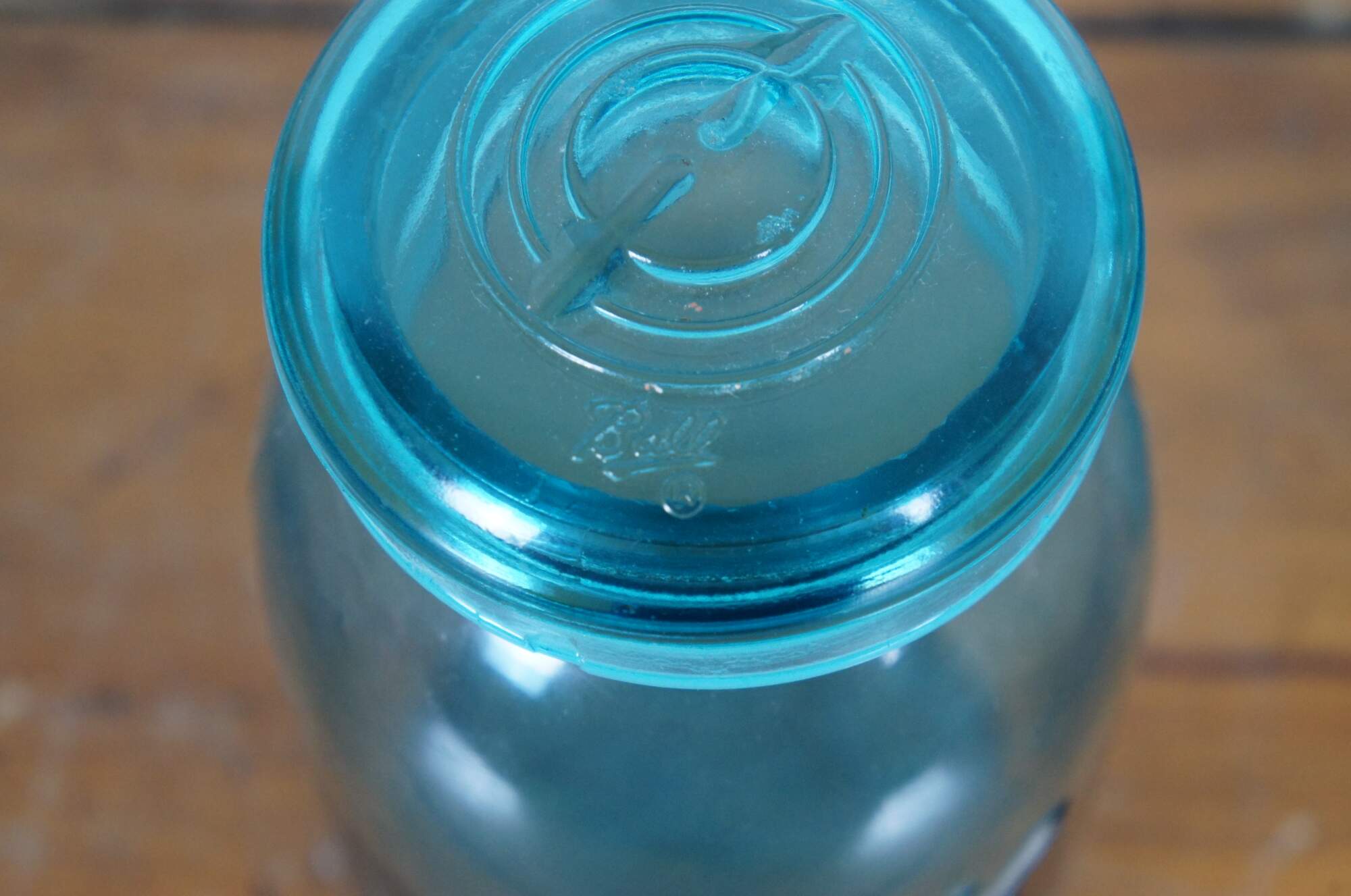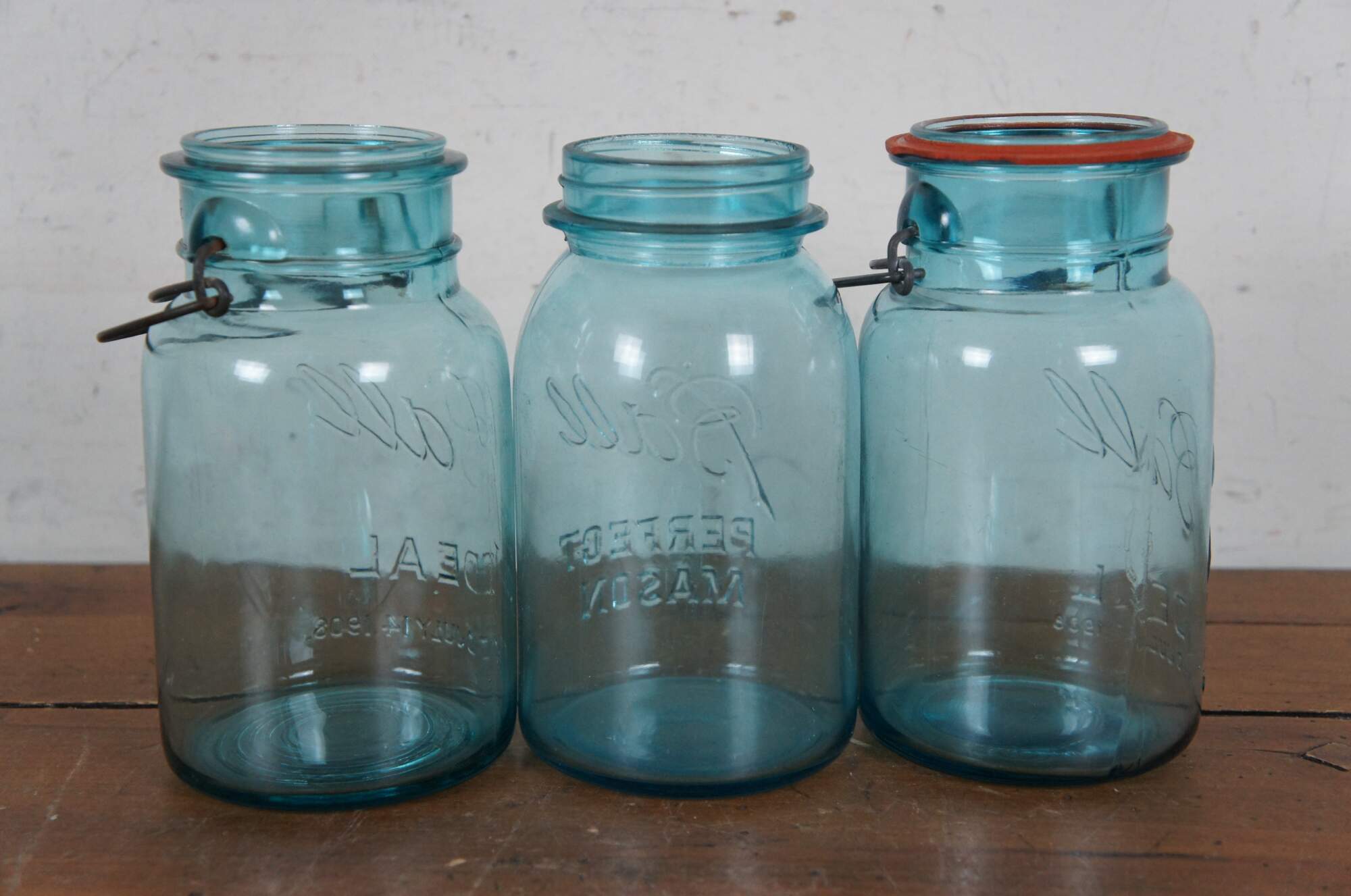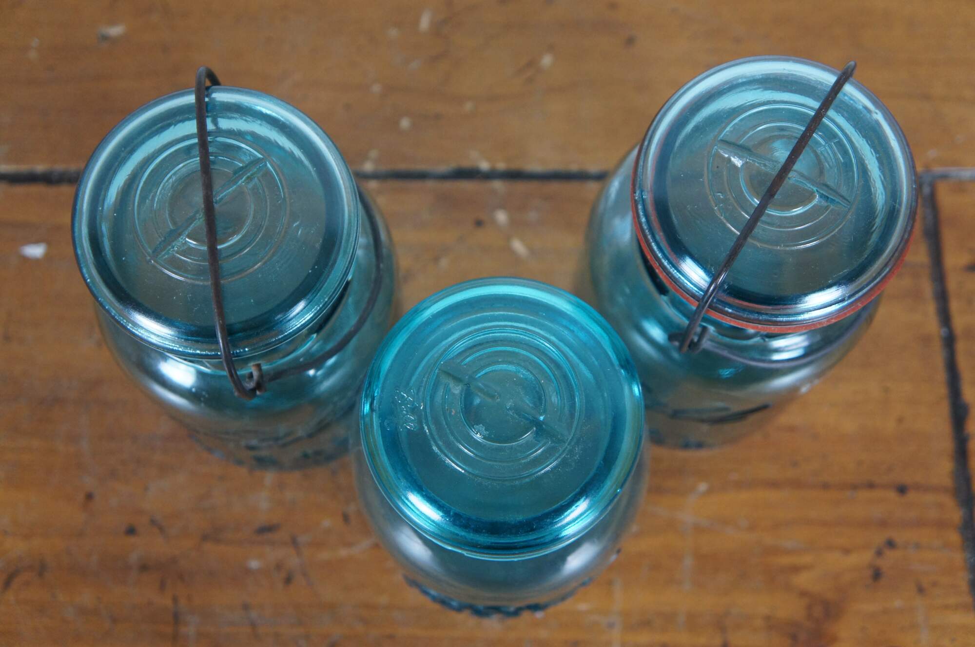 Set of 3 early 20th century Ball Perfect Mason and Ideal blue glass canning jars with wire bail closure on two, screw top on one, & three glass lids. Approximately pint and a half or 32 oz capacity. Bases labeled 12, 9 and 2 underneath. Mark used from 1923-1933.
