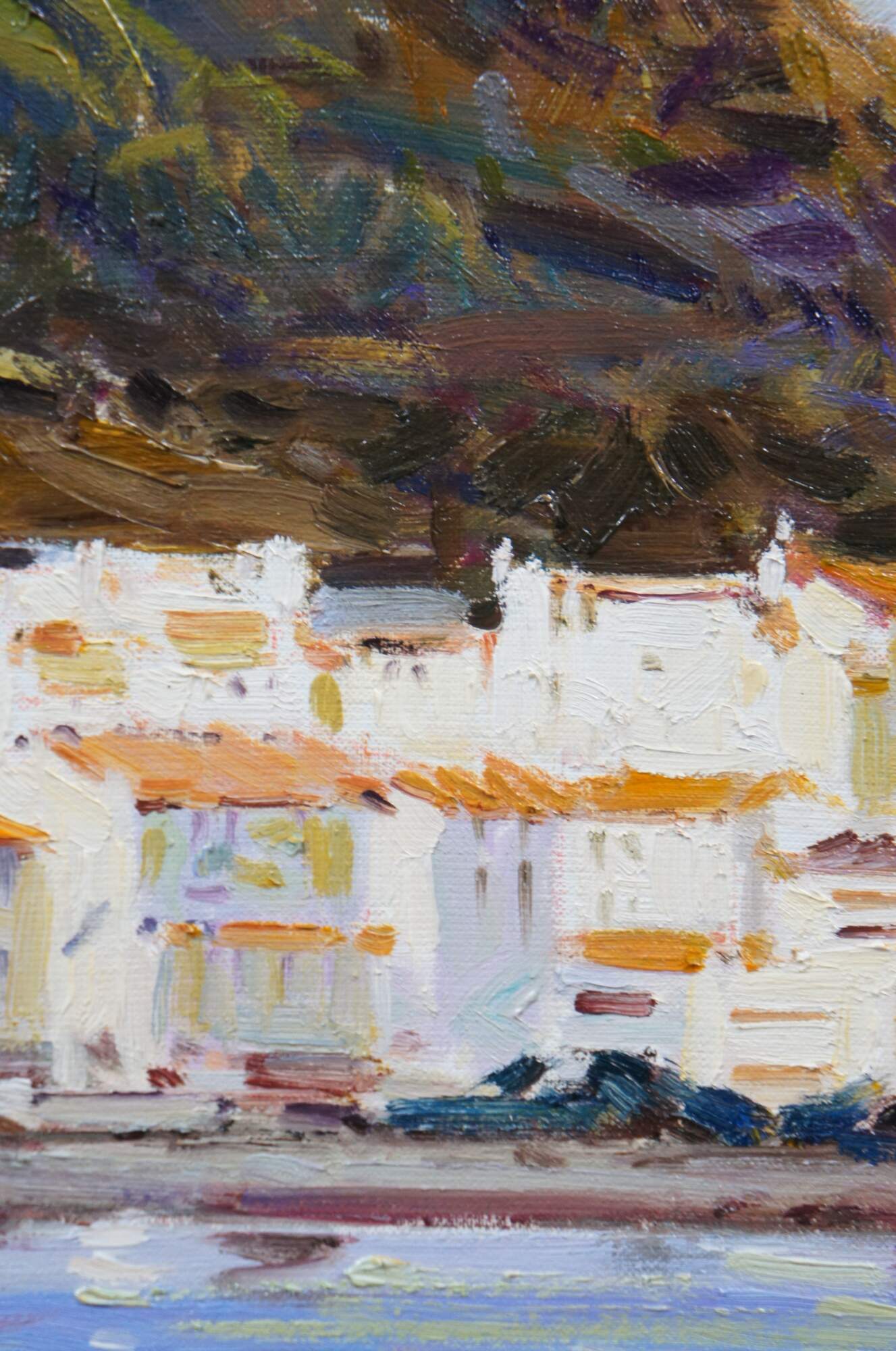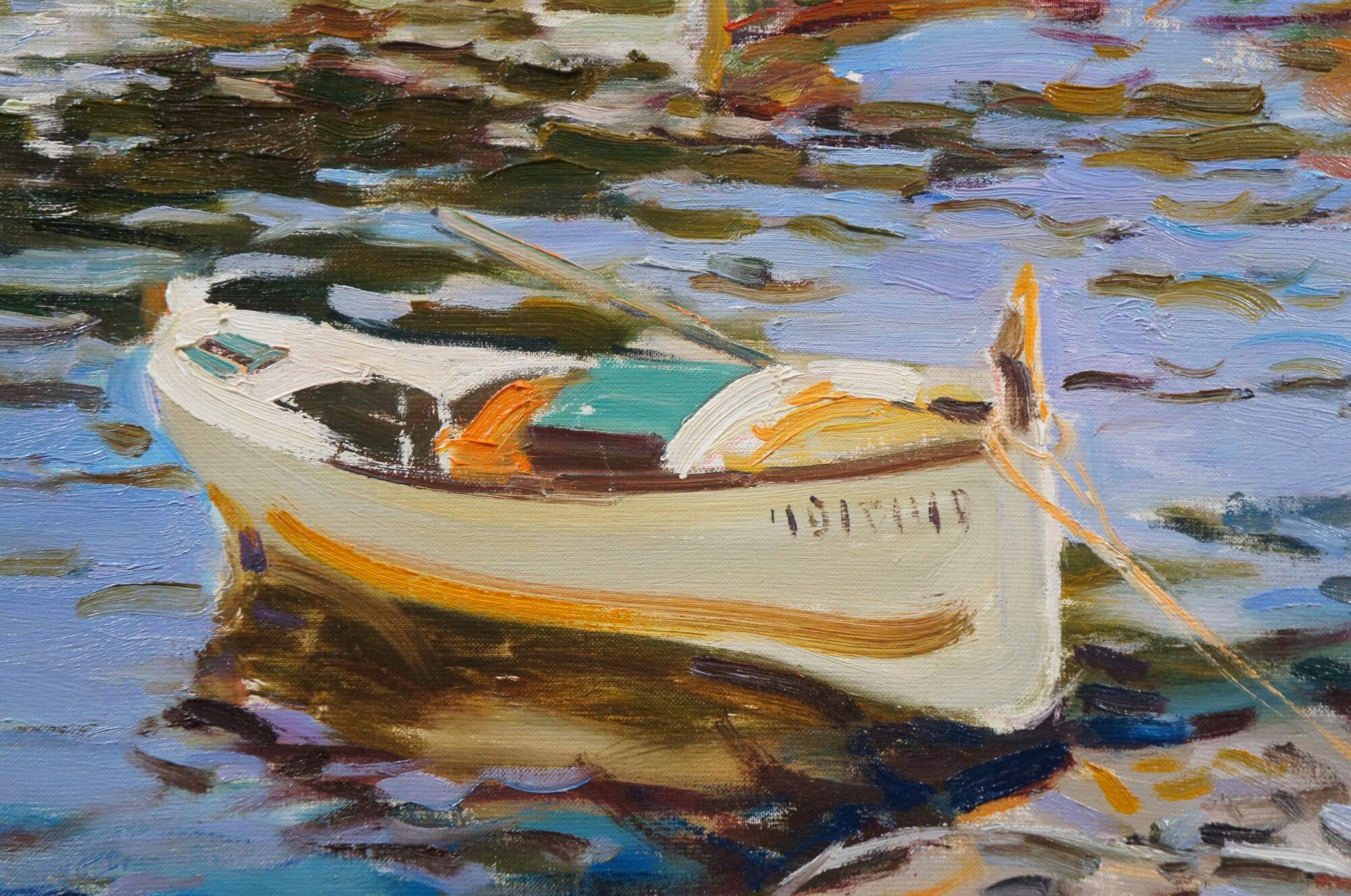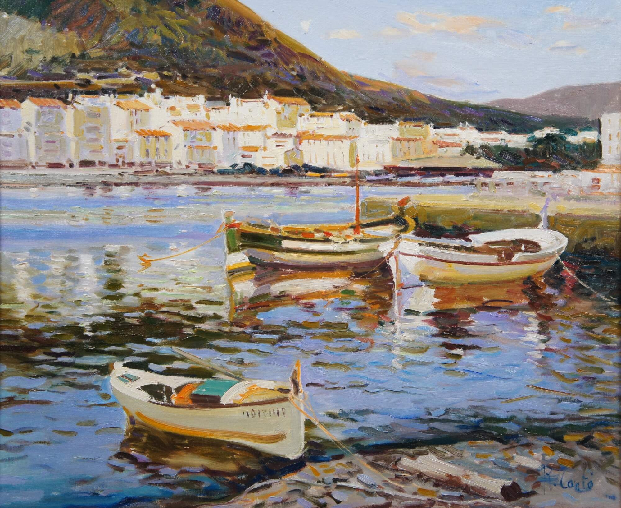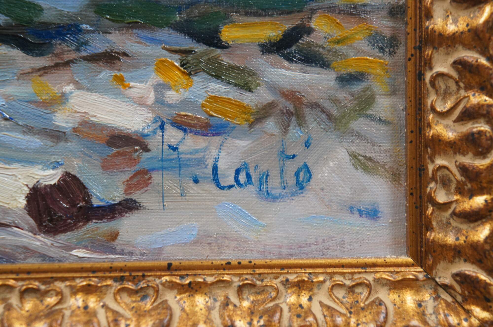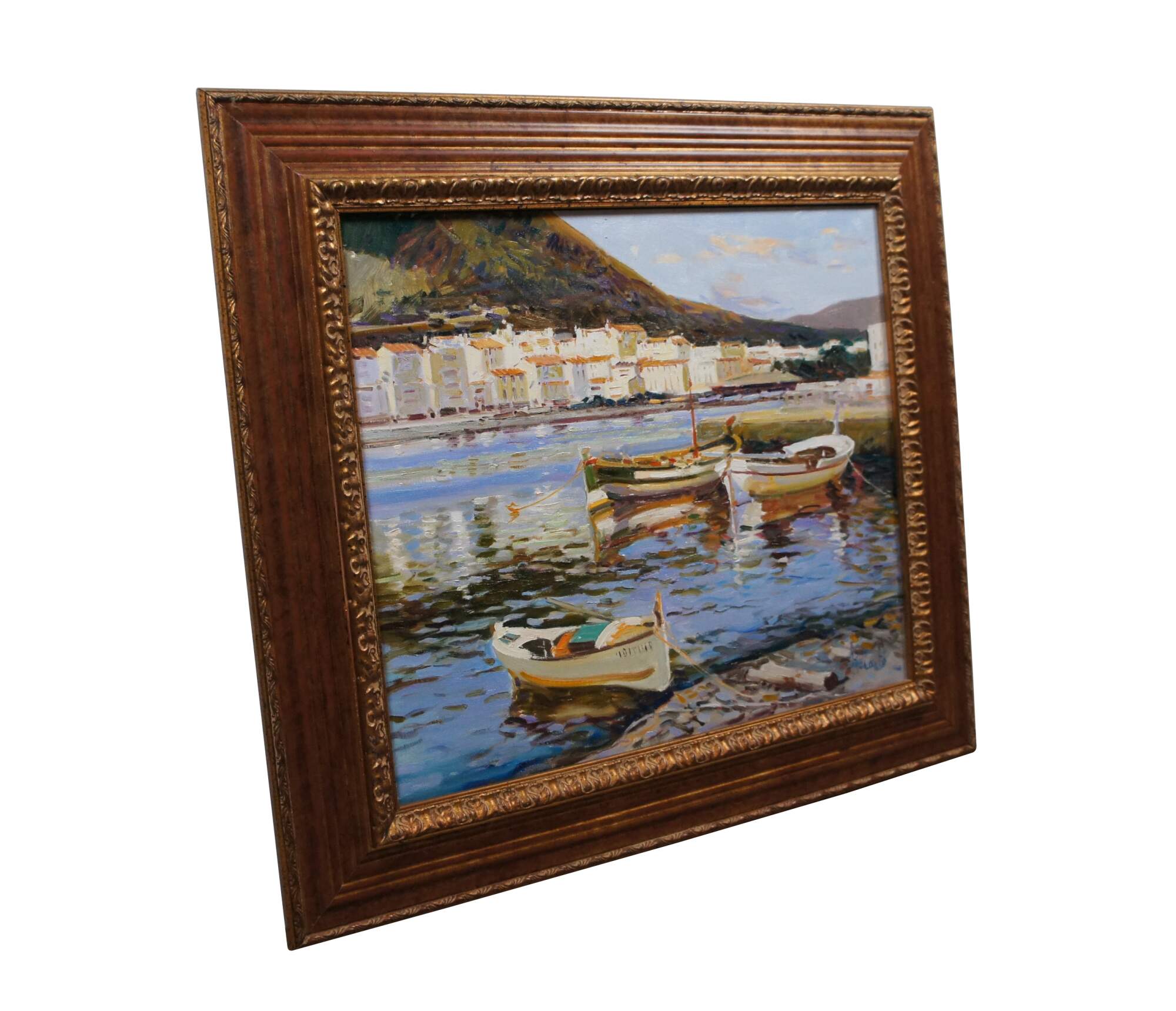 Late 20th century impressionist seascape oil painting on canvas by Rosa Canto, depicting small sailboats in a harbour with a Mediterranean cityscape / town of white buildings in the background. Signed R. Canto in lower right. Grooved giltwood frame with carved detail.