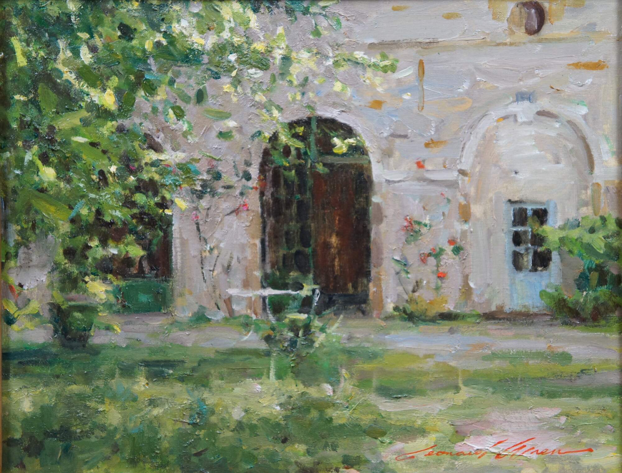 20th century Leonard Wren Impressionist oil painting on board titled "L'Orangerie - Burgundy" on reverse, depicting a view of arched doorways in a light stone building in a sun dappled French courtyard. Signed in lower right corner. Beveled gilt wood frame with art deco foliate corners.