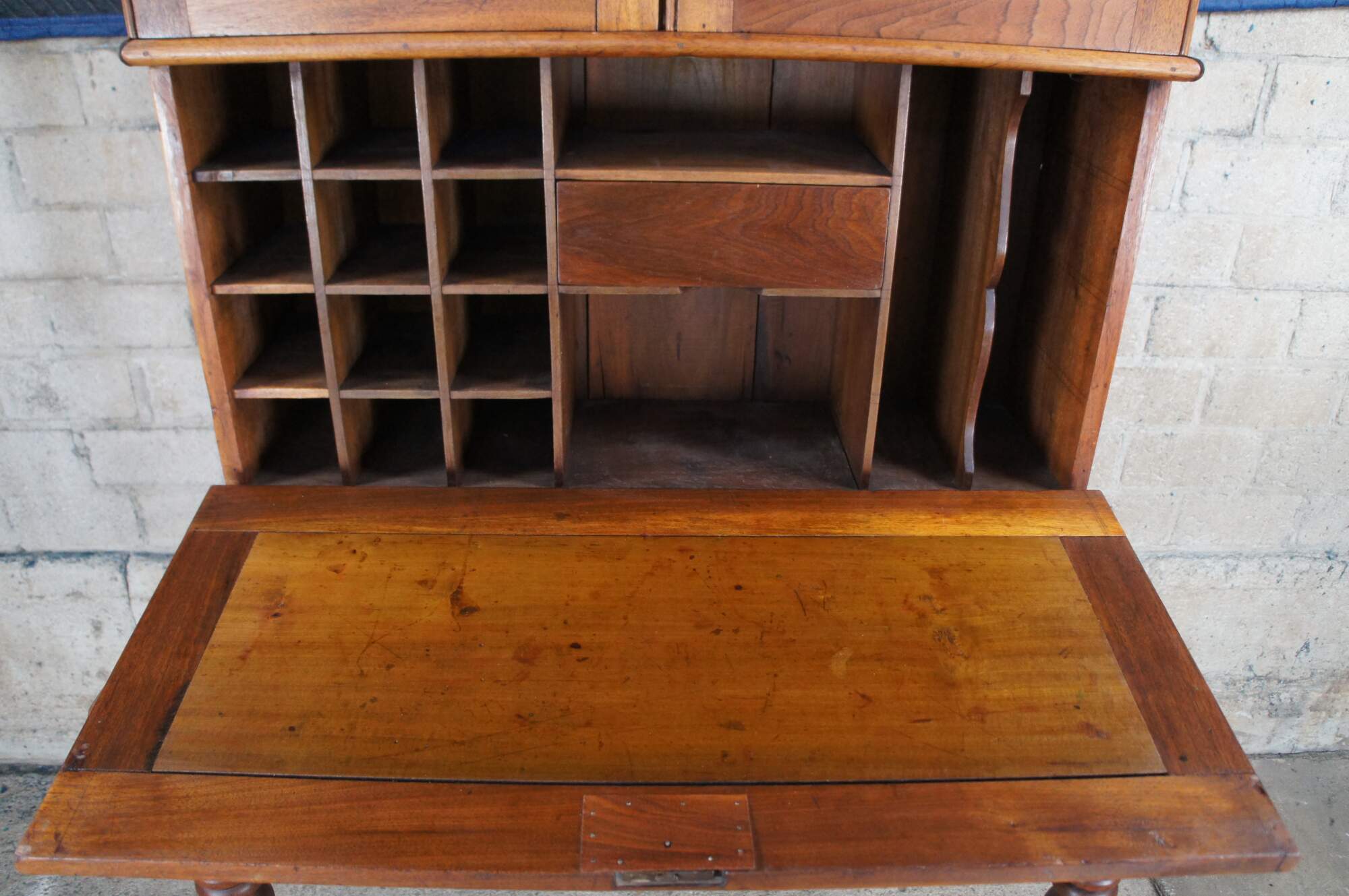 An equisite Early American Plantation, clerk or mail Desk, Circa mid 19th C.. This exceptional 2 piece desk features a lower desk with hand dovetailed drawer over four hand turned legs. The hutch portion showcases a large drop or fall front opening to several pigeon holes and a centrally located drawer. Above the secretary is a two door glass display with two adjustable shelves. A truly remarkable timless cabinet with veratilty and charm.