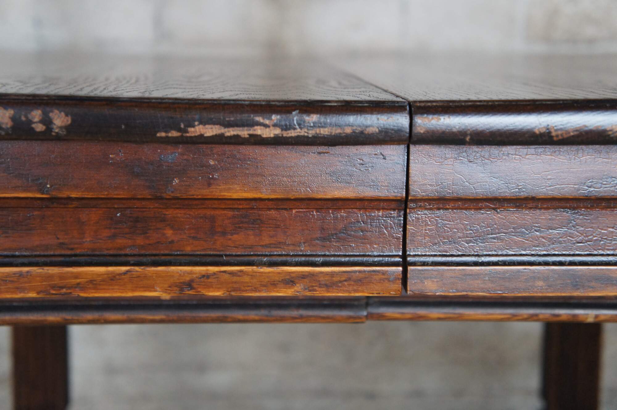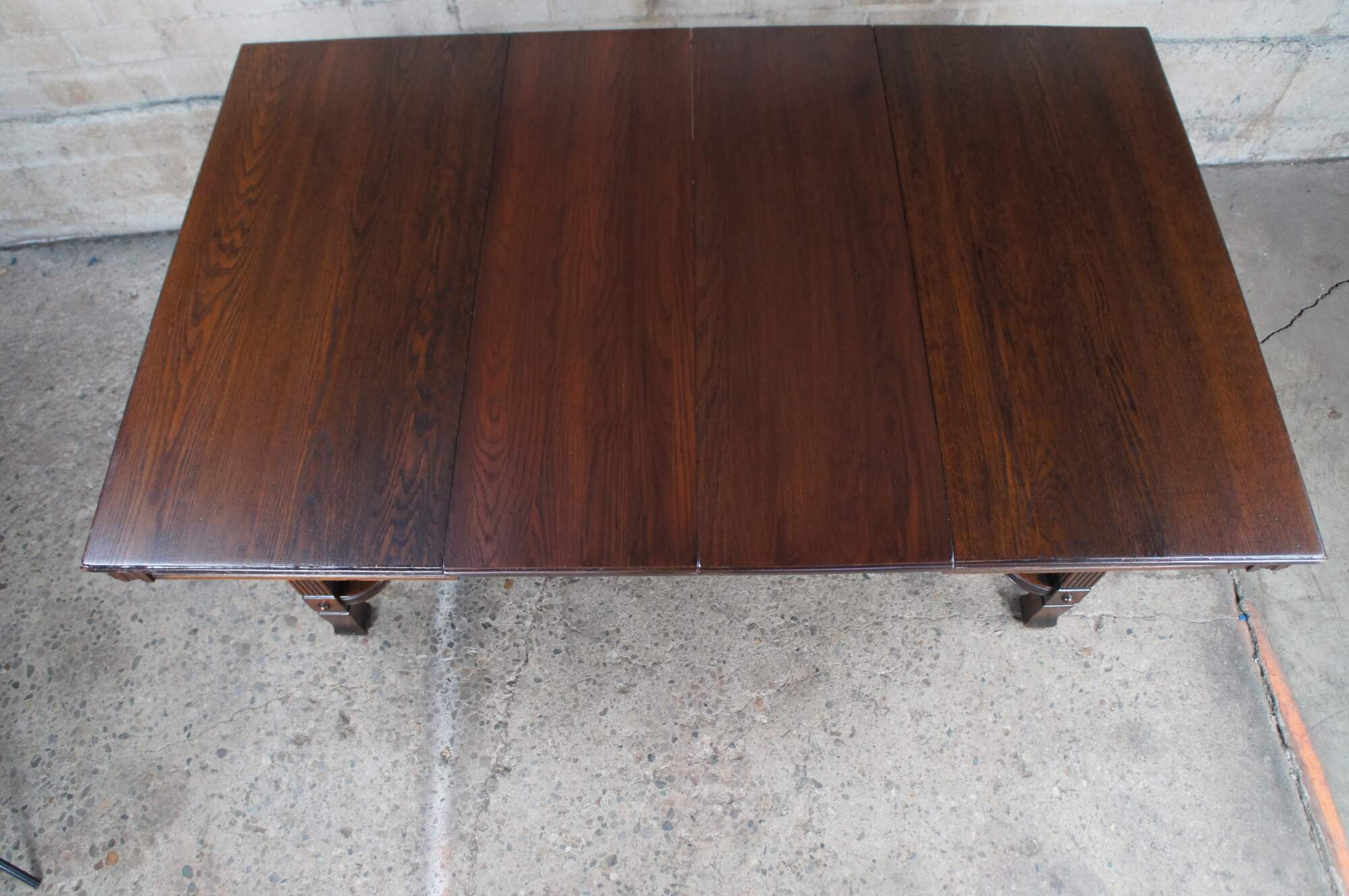Late Victorian extendable Oak Dining / Breakfast table. Features oak construction with thick square fluted legs connected by contoured stretchers with convex orbs. The table extends with two leaves and has a central pedestal leg that can be removed when not in use.