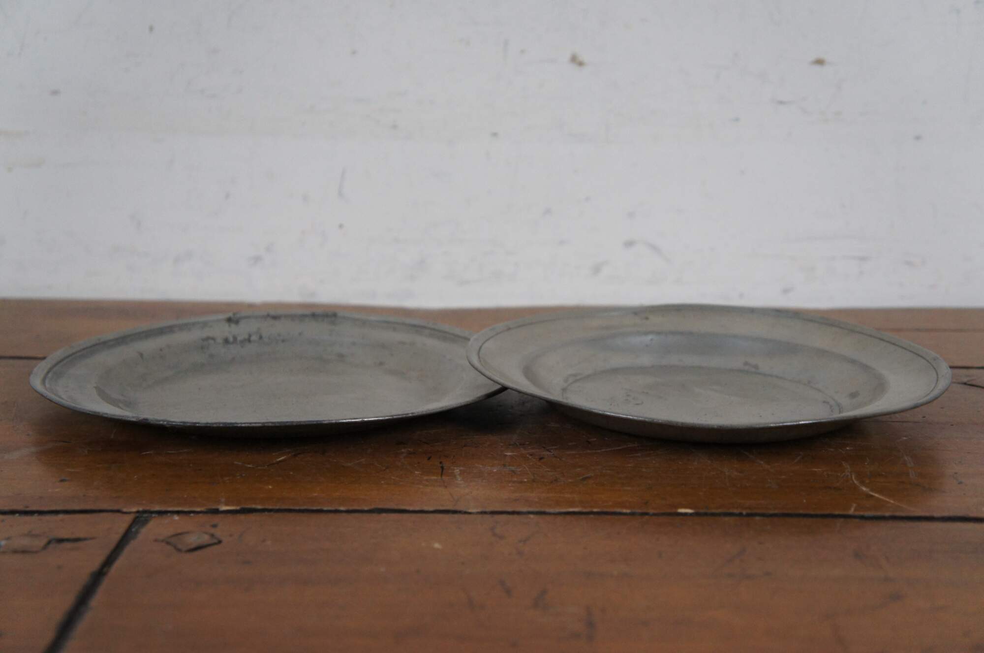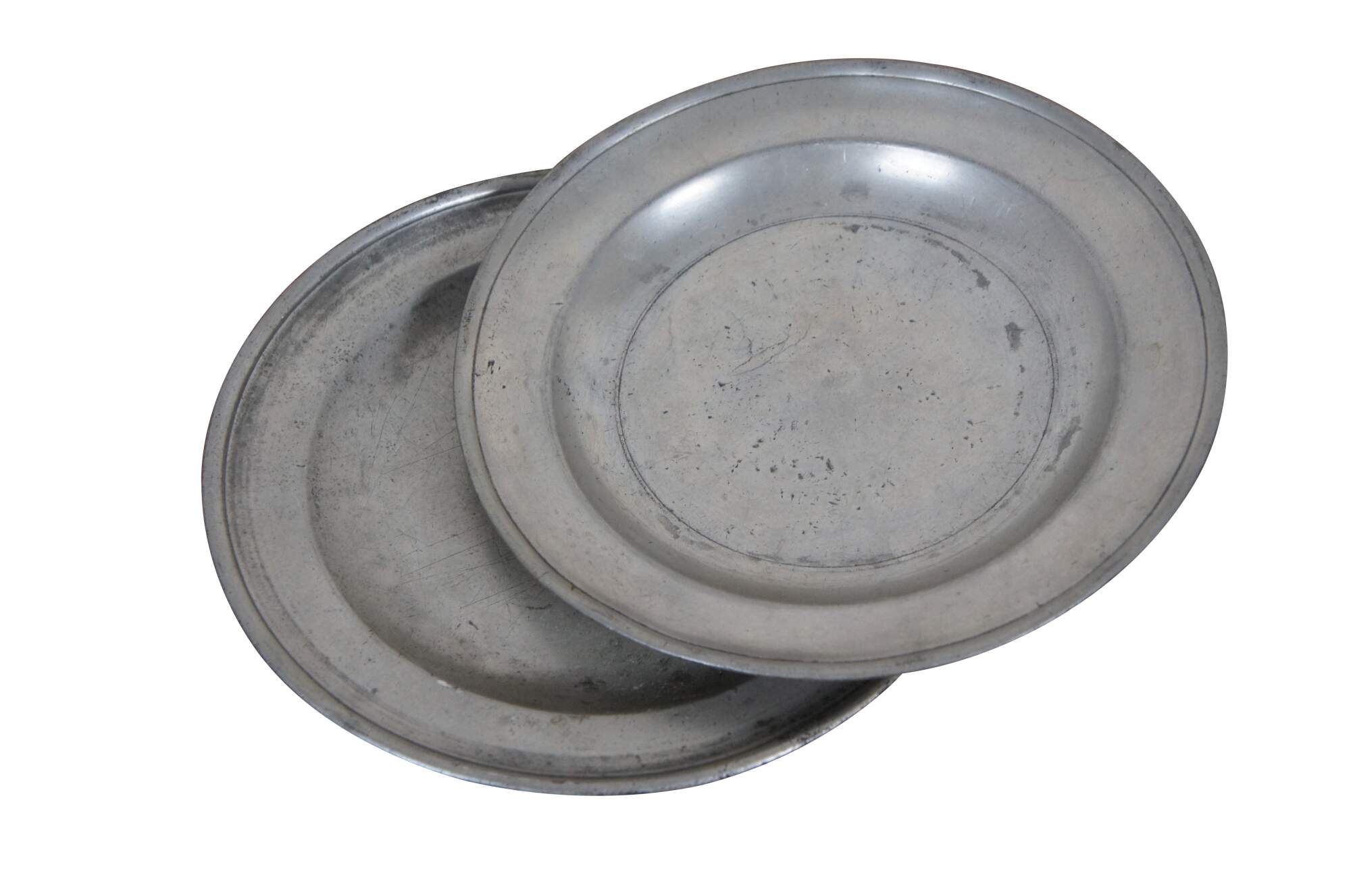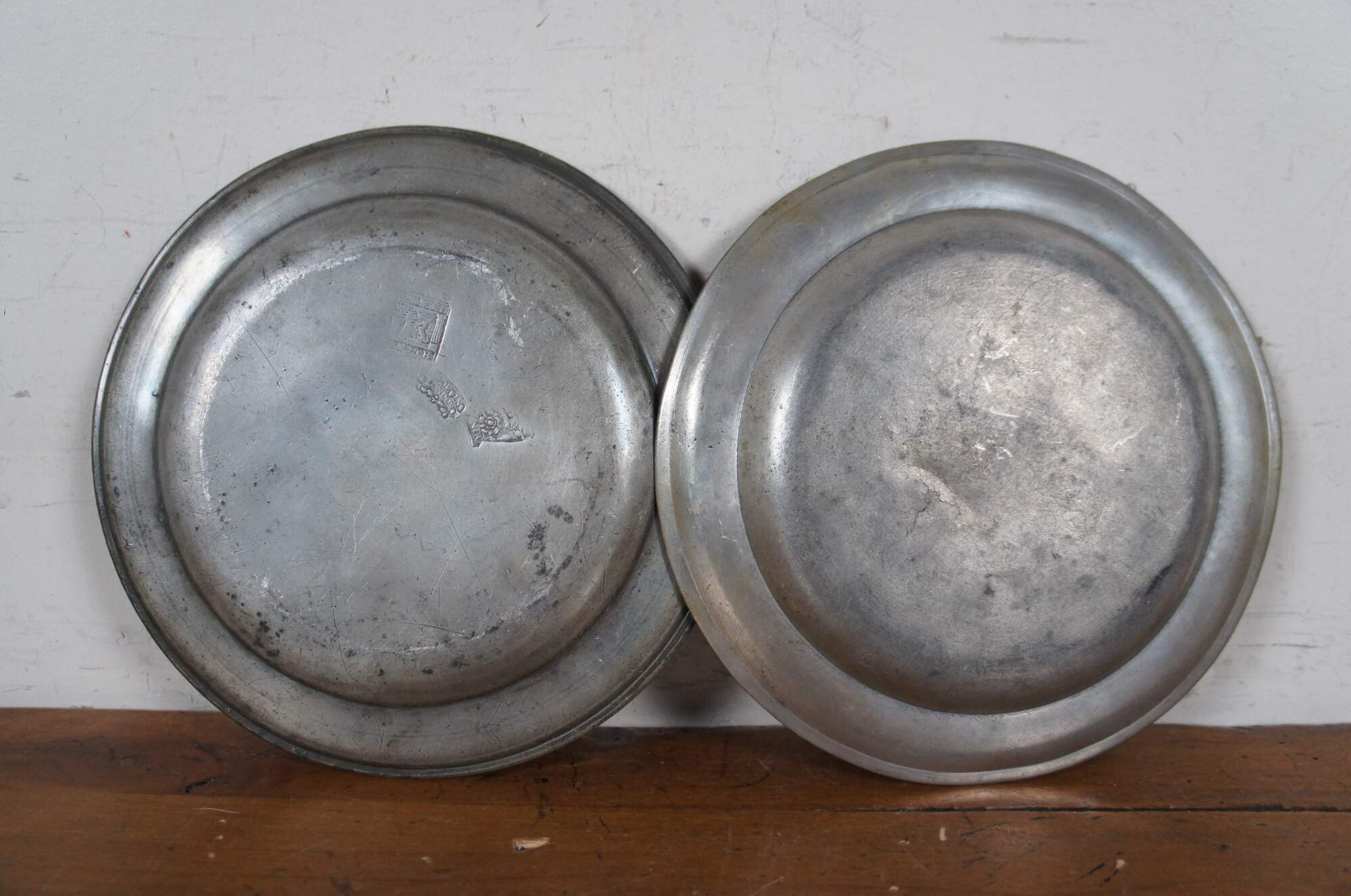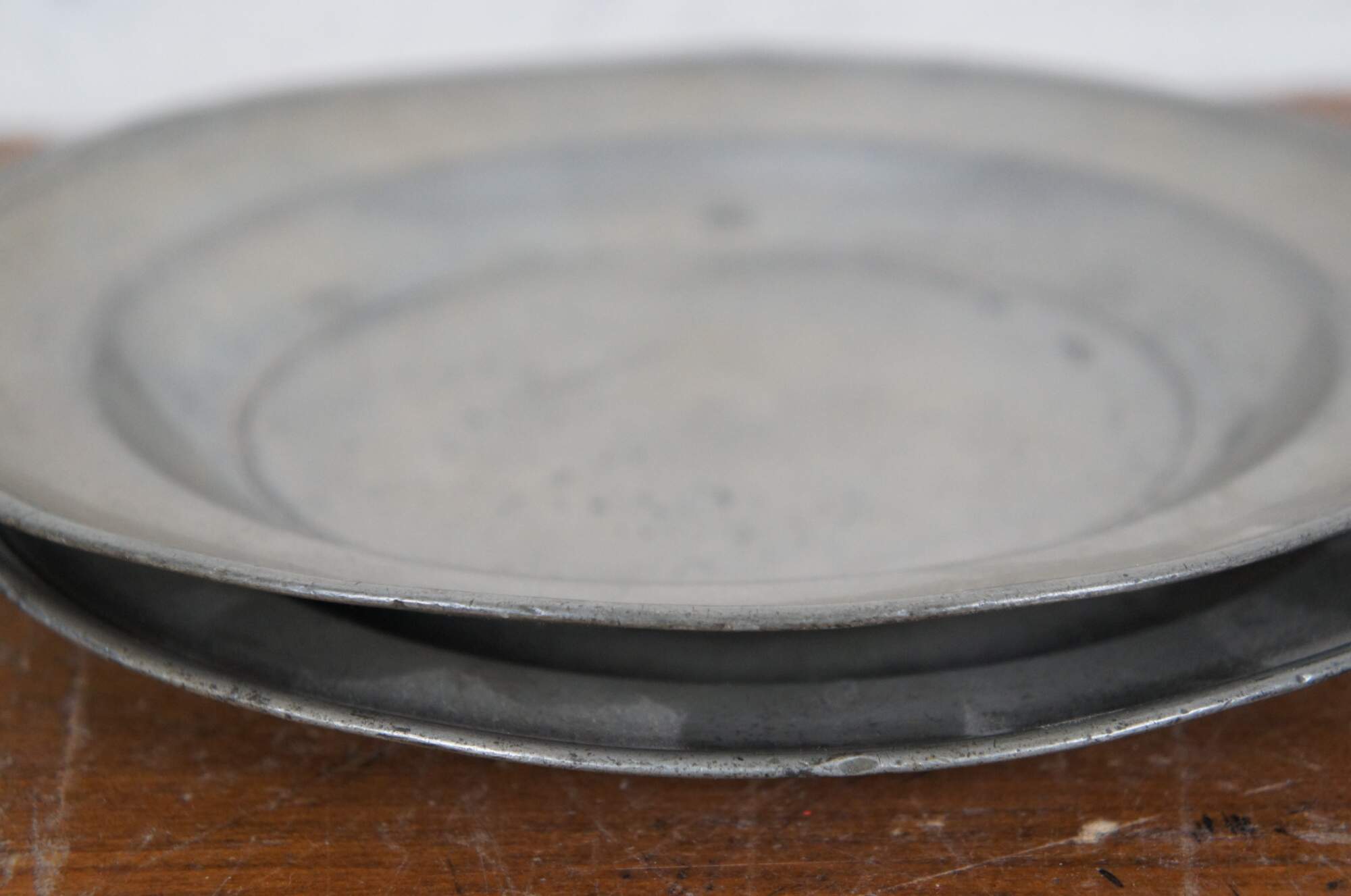 Pair of circa late 18th century pewter dinner plates. One with the touchmarks of Samuel Smith (circa 1727-1761). The deeper plate apppears to have had a mark near the crack, but it has since worn away.