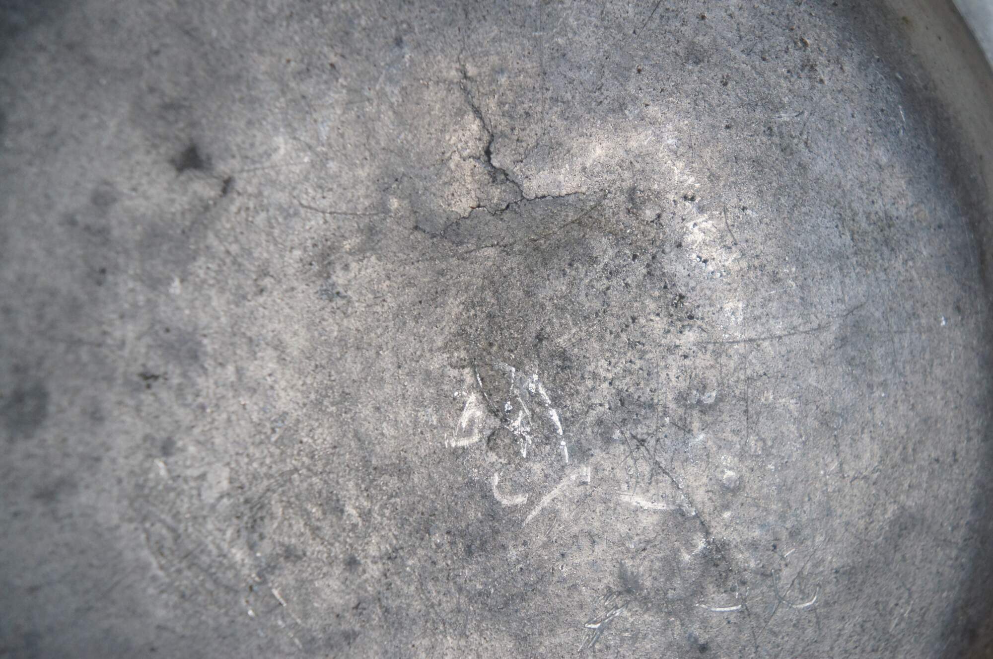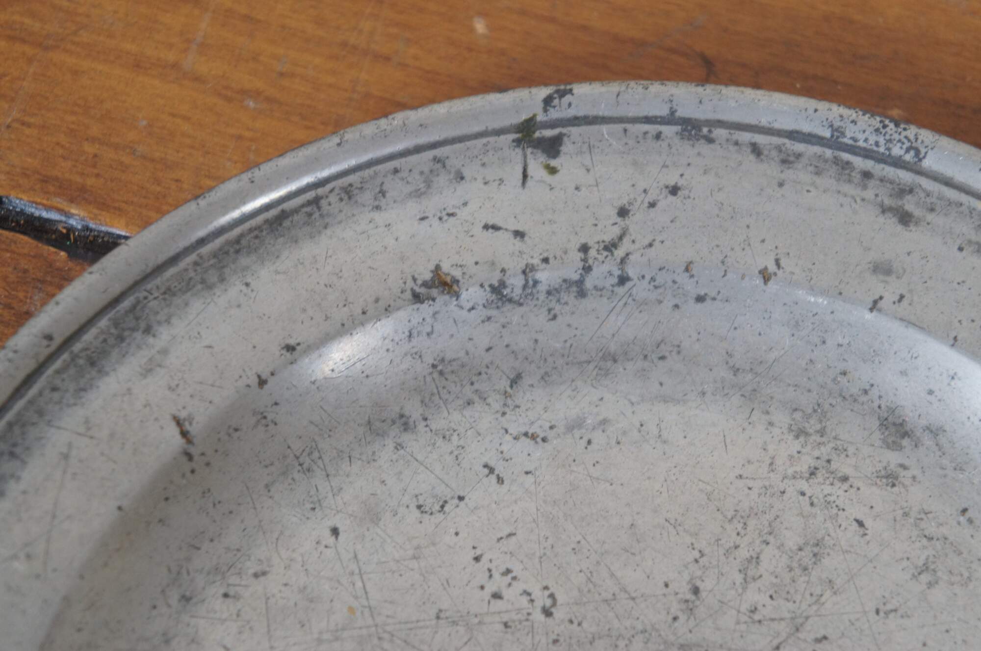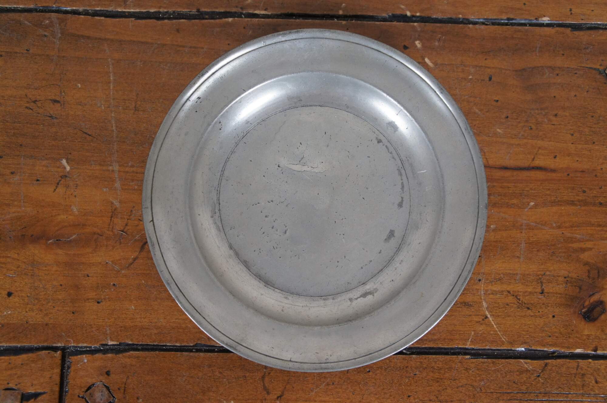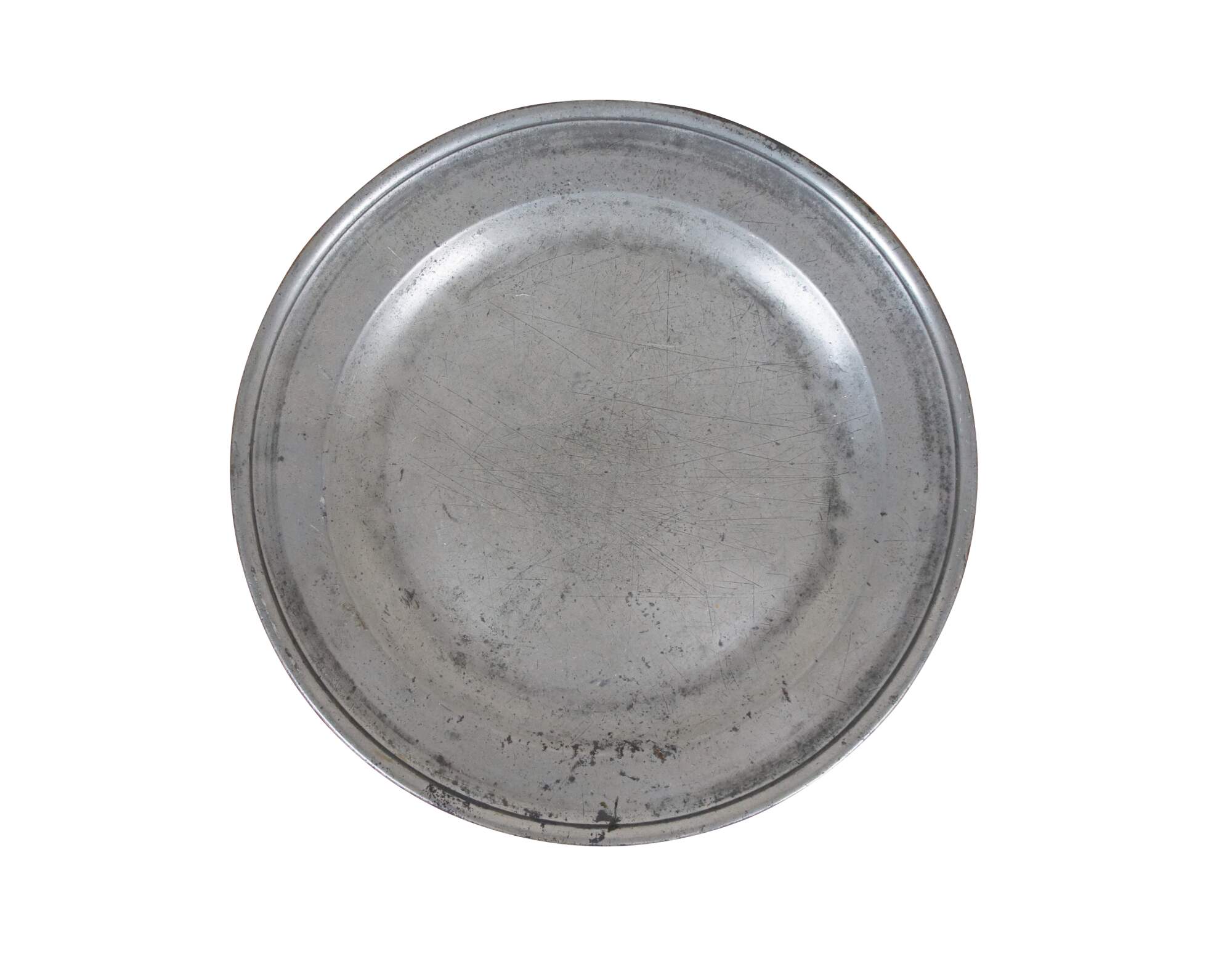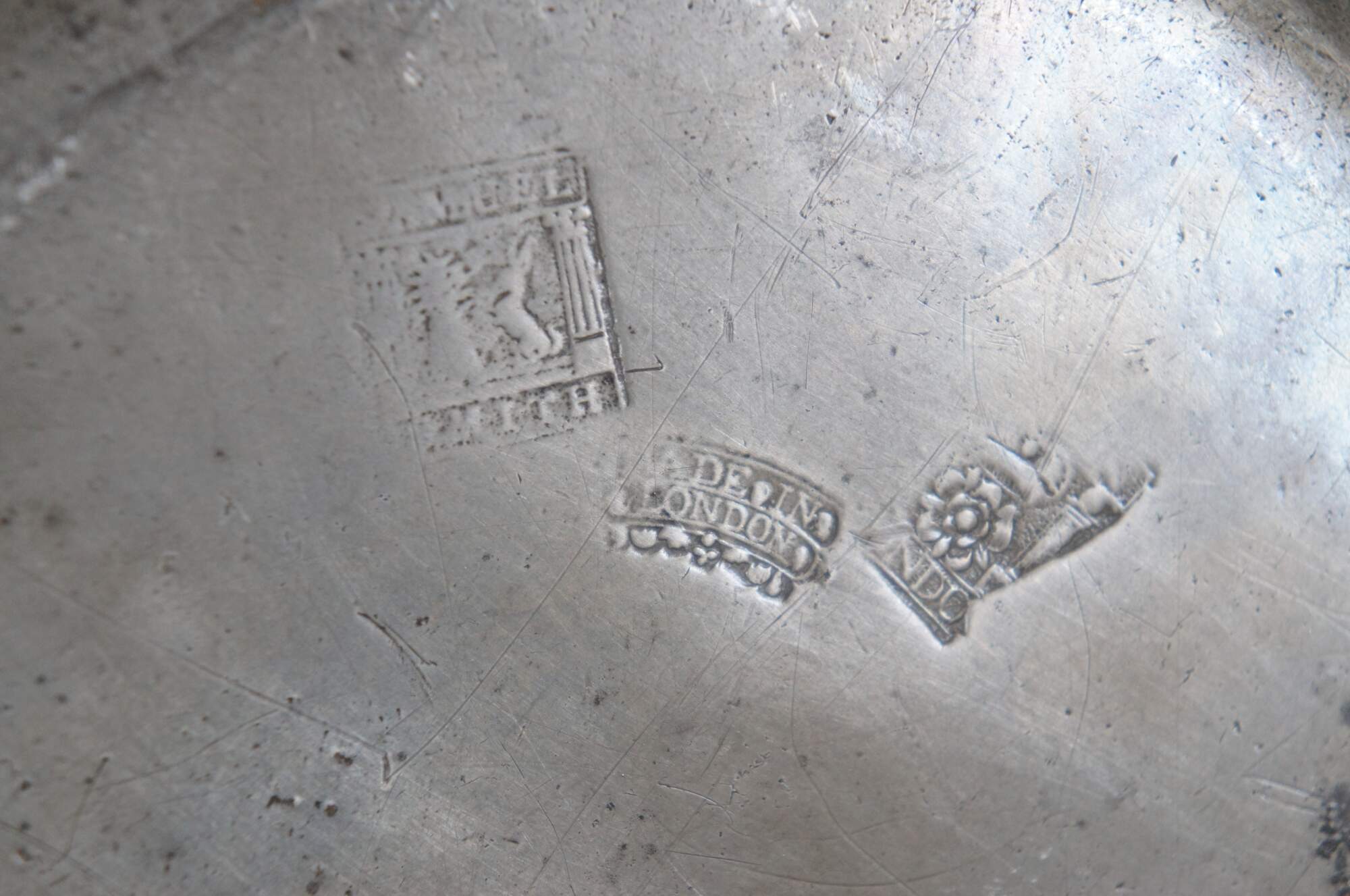 Pair of circa late 18th century pewter dinner plates. One with the touchmarks of Samuel Smith (circa 1727-1761). The deeper plate apppears to have had a mark near the crack, but it has since worn away.