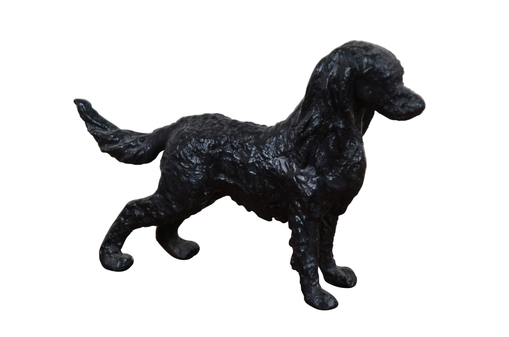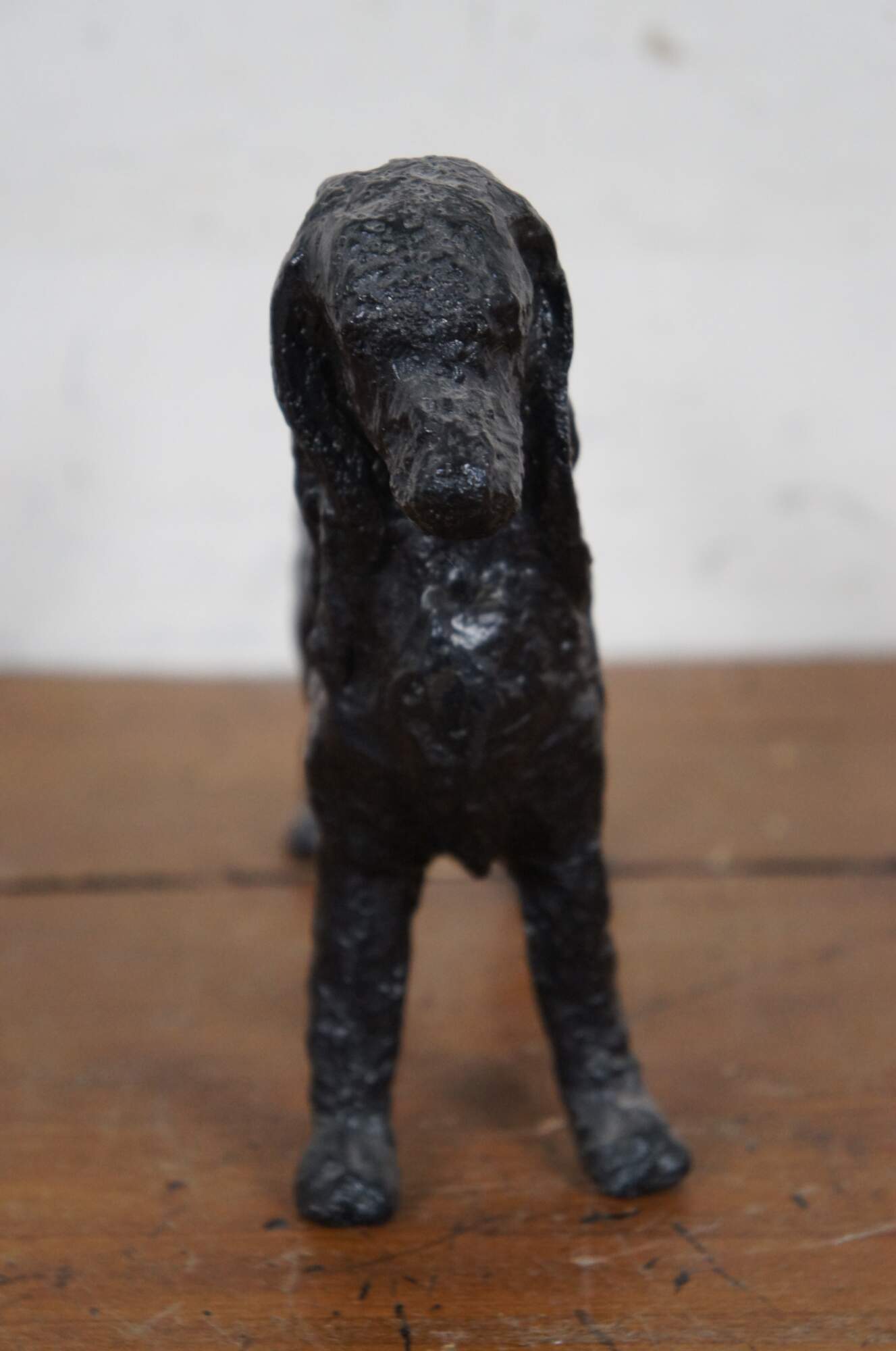 Vintage cast hollow metal dog figurine / sculpture in the shape of a variety of spaniel / setter / retriever. Colored to resemble iron or darkened bronze.