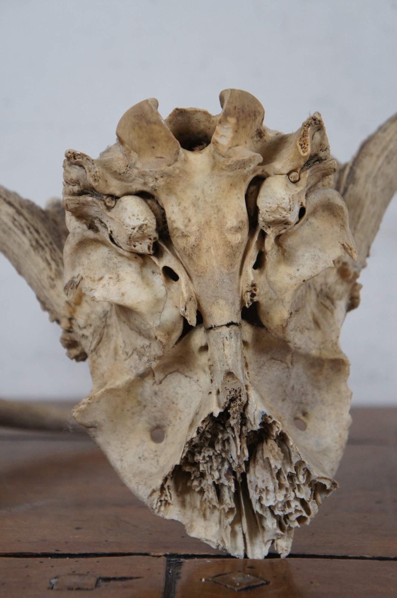 Pair of 20th century whitetail deer antlers and skull caps - larger features 8 points and a larger portion of skull. smaller features four points and a small section of skull.