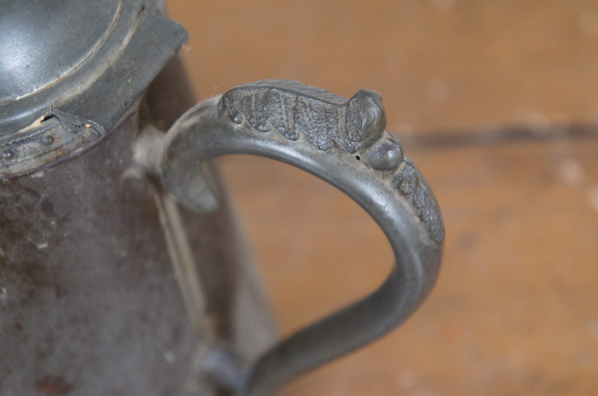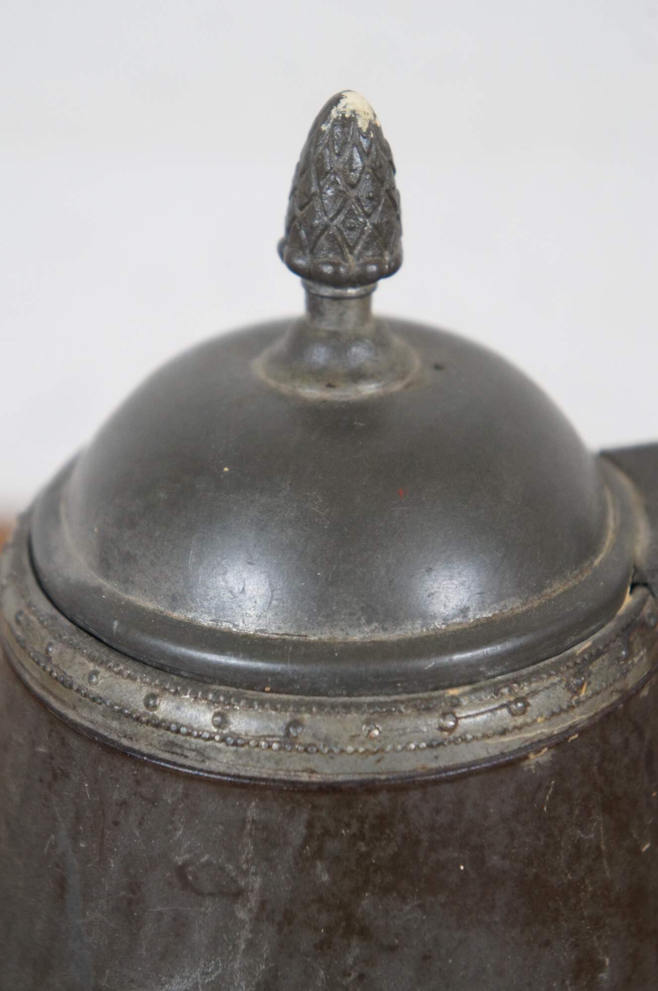 Antique pewter tea / coffee pot / kettle with a tapering cylindrical body, grooved goose neck / bird spout, beaded rim, domed hinged flip top lid with acorn / pineapple finial, and leaves applied to the top of the ear shaped handle.