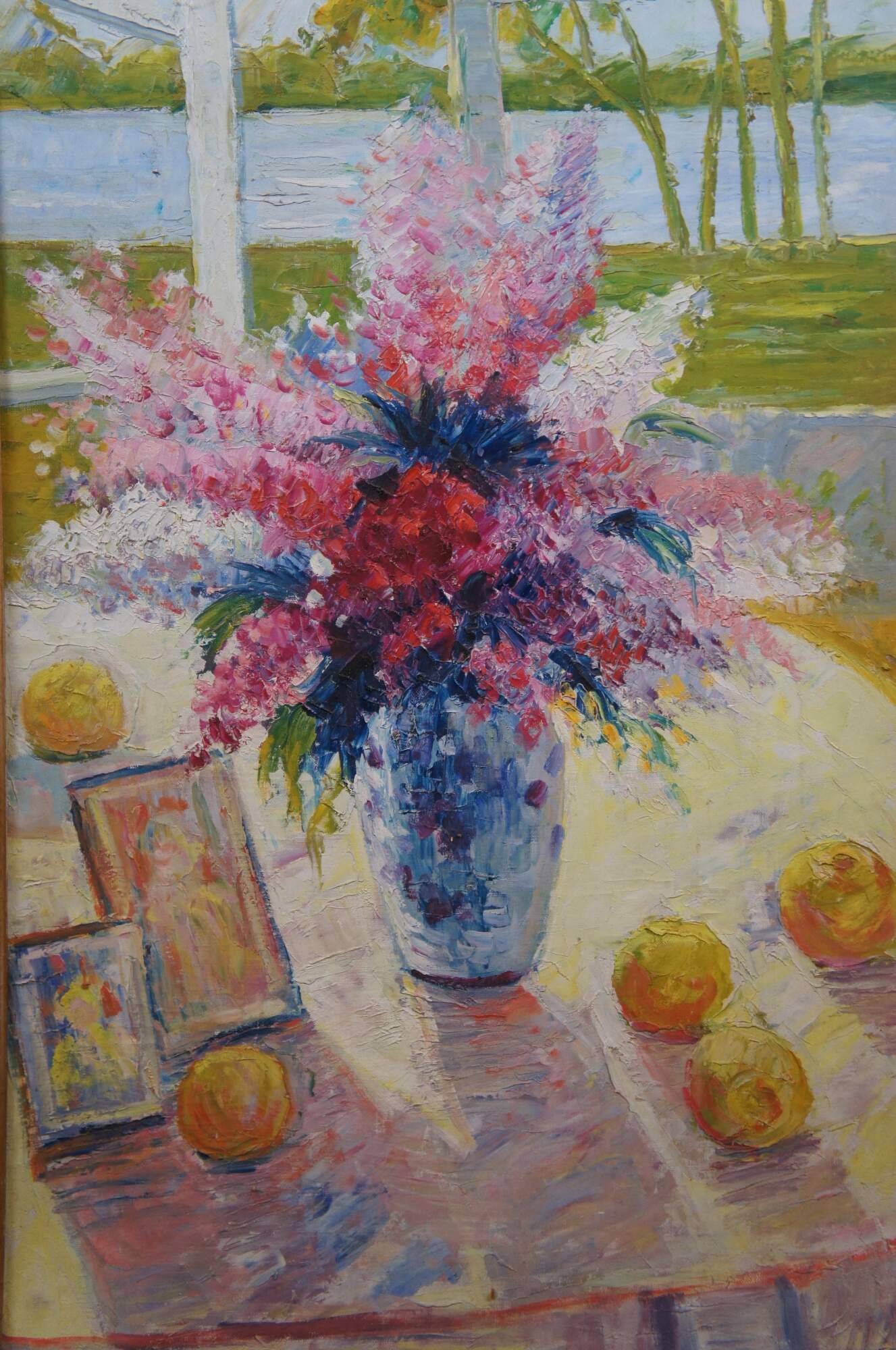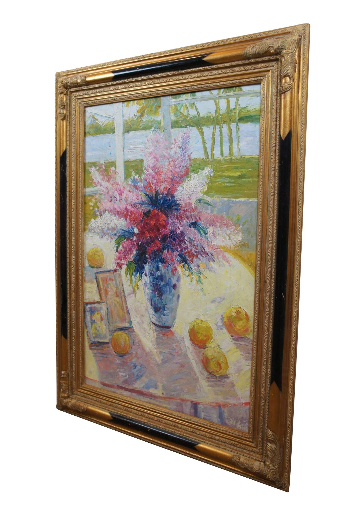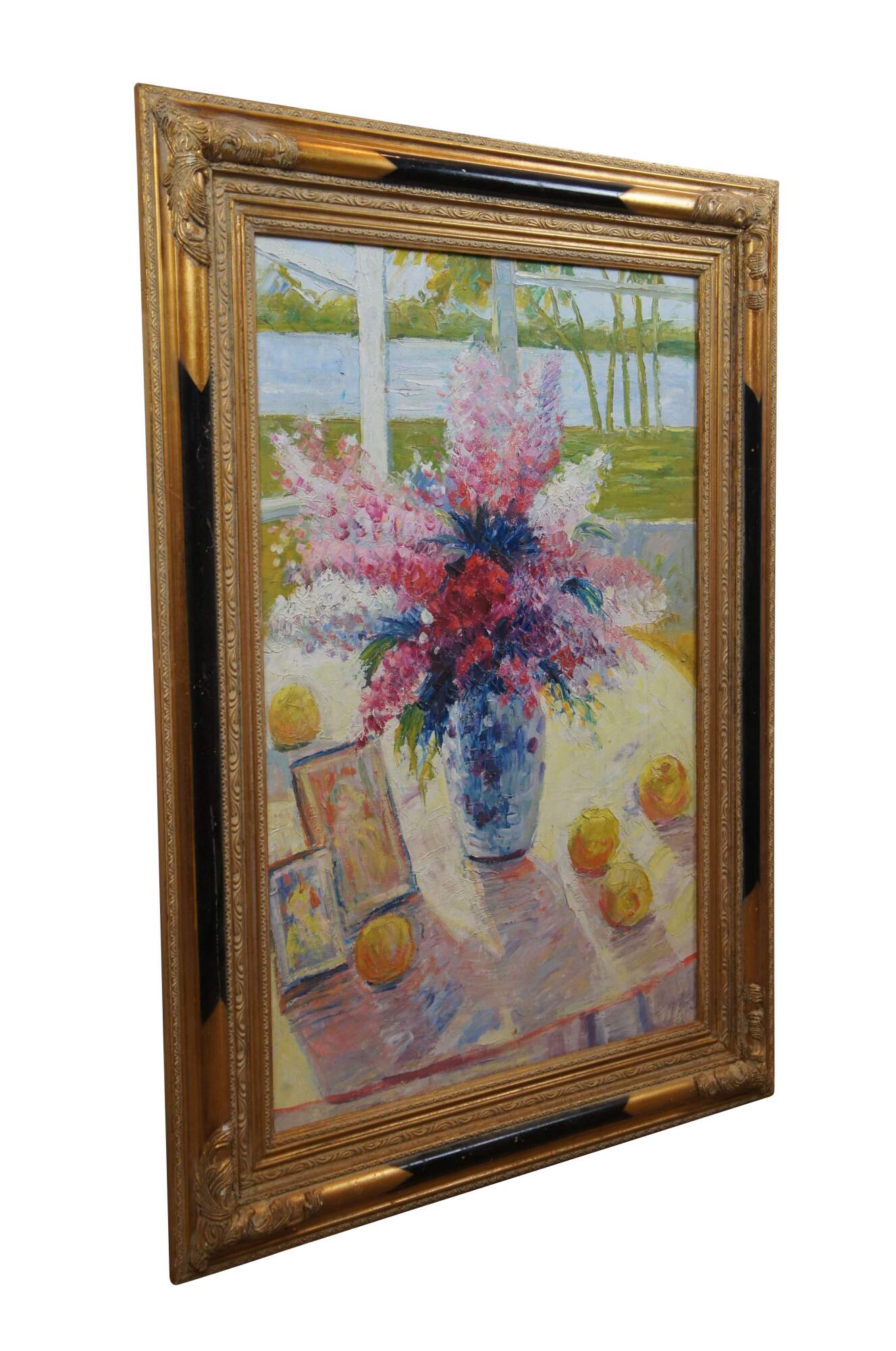 Large vintage 20th century still life oil painting on canvas depicting a vase of pink and purple lilacs, sitting on a cloth covered table next to several oranges / peaches and two frame photos, in the slanting sunlight of a nearby bay window with a waterway and green trees beyond. Gilt and black lacquer frame with carved foliate corners.