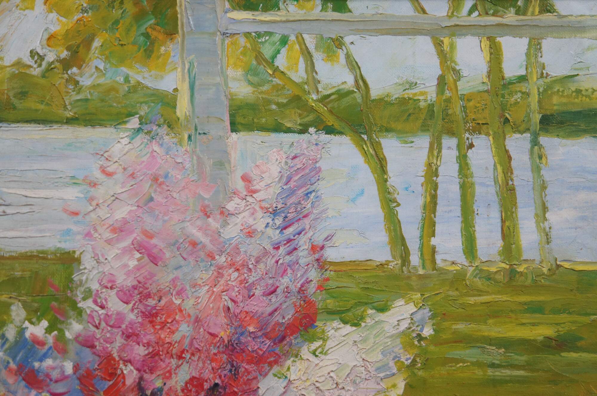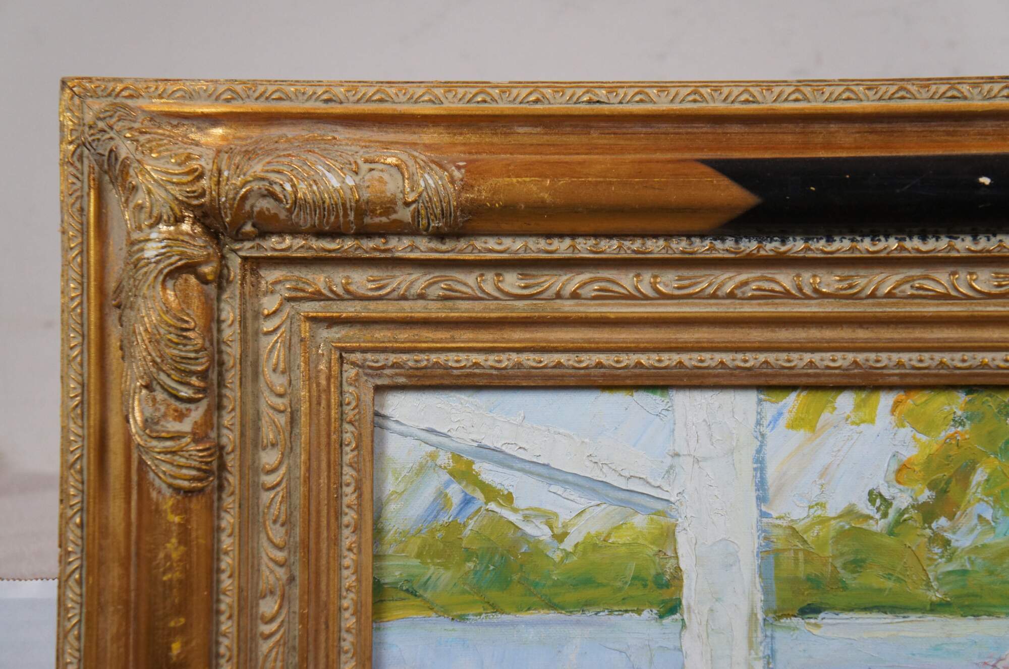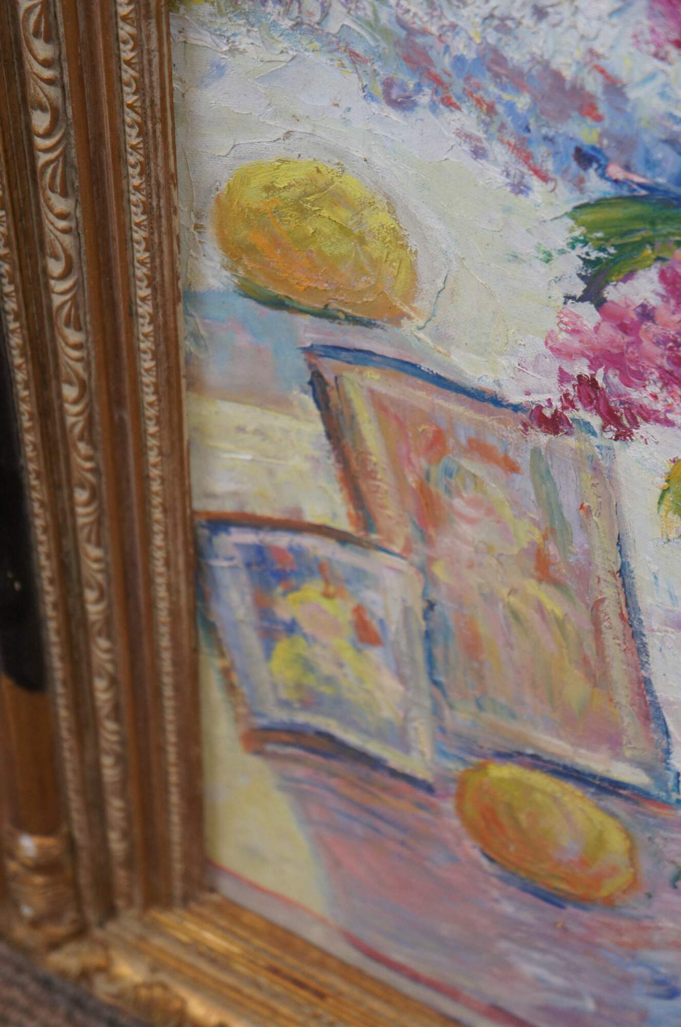 Large vintage 20th century still life oil painting on canvas depicting a vase of pink and purple lilacs, sitting on a cloth covered table next to several oranges / peaches and two frame photos, in the slanting sunlight of a nearby bay window with a waterway and green trees beyond. Gilt and black lacquer frame with carved foliate corners.