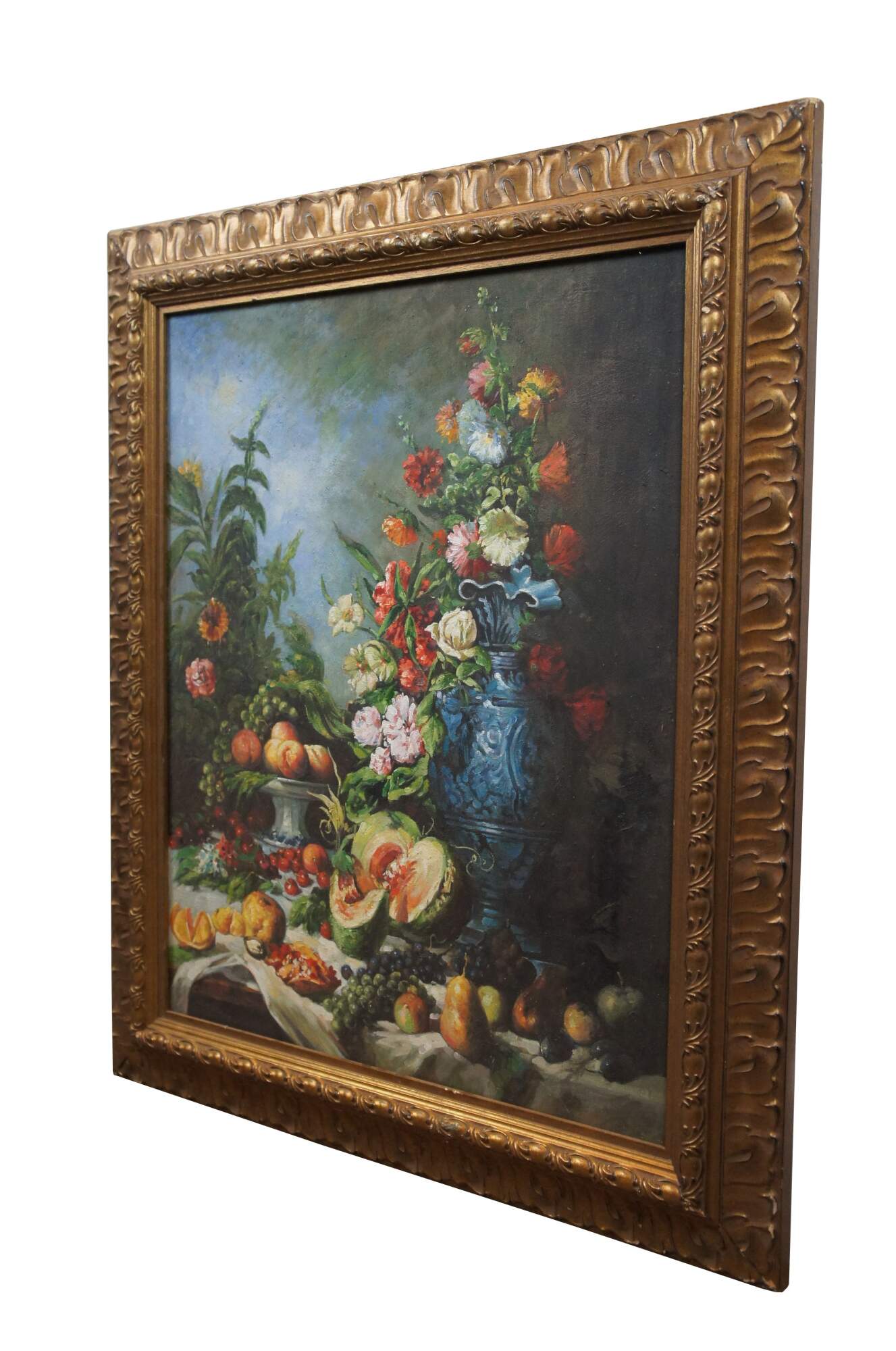 Vintage 20th century oil painting on canvas after a still life attributed to Eugene Vidal, depicting a bouquet of flowers in a large blue vase, surrounded on a cloth covered table with an array of fruits. Carved gold frame, made in Italy.
