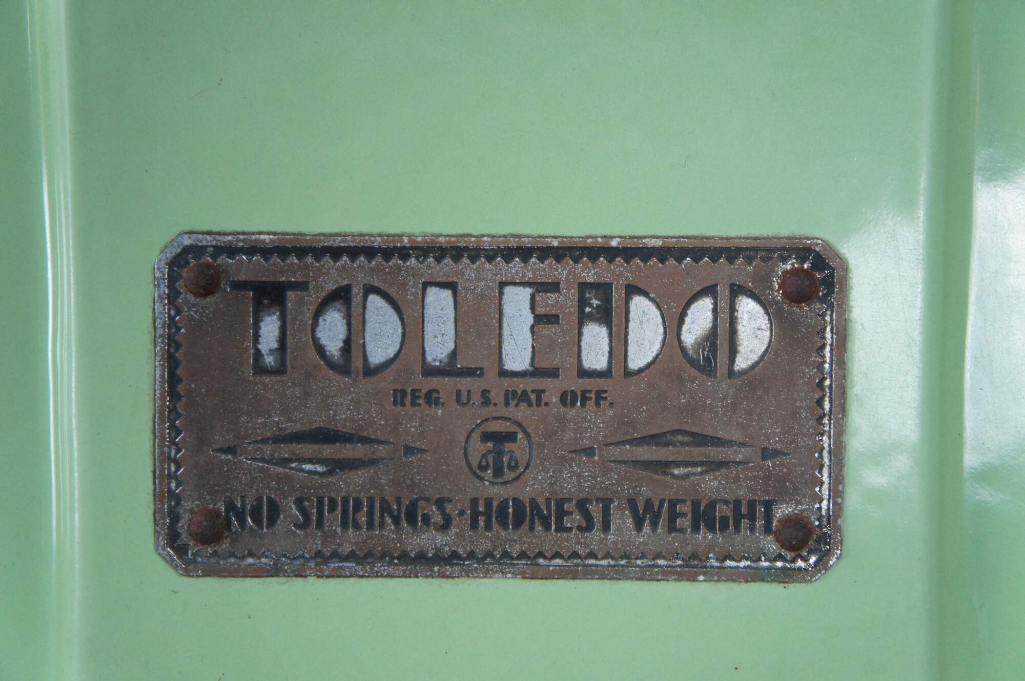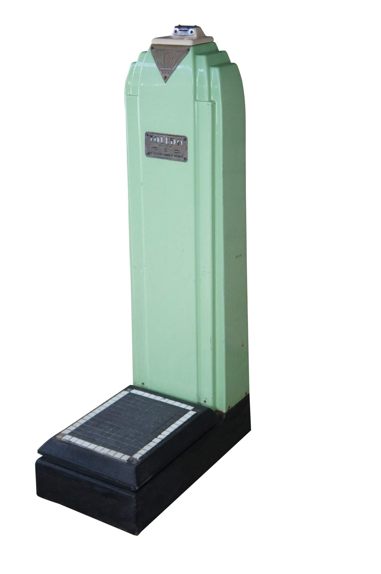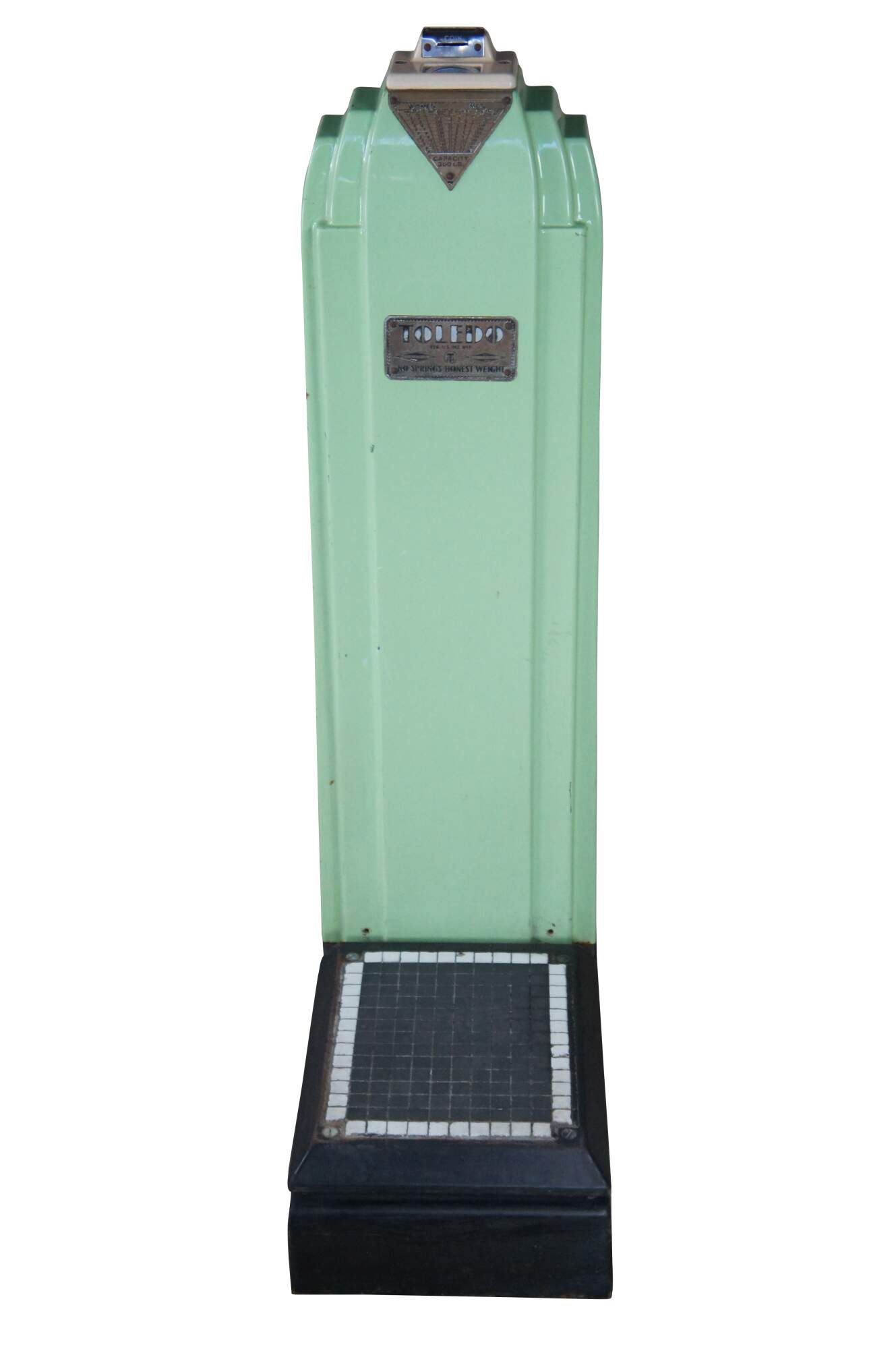 Toledo Scale Company Model 8400A. Features an enameled green porcelain finish and tiled station. Features the iconic Art Deco Skyscraper design with a glass readout along the top.