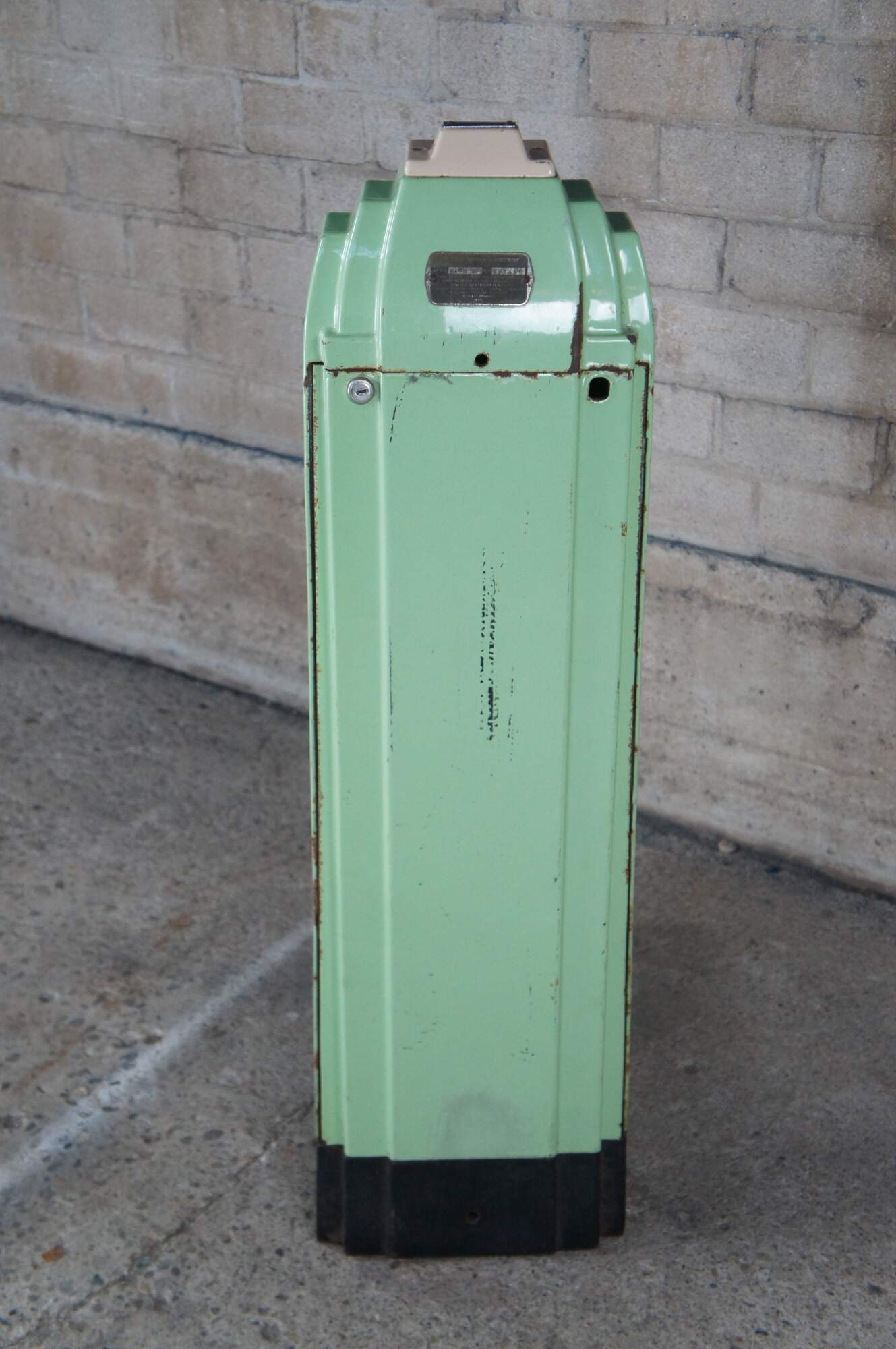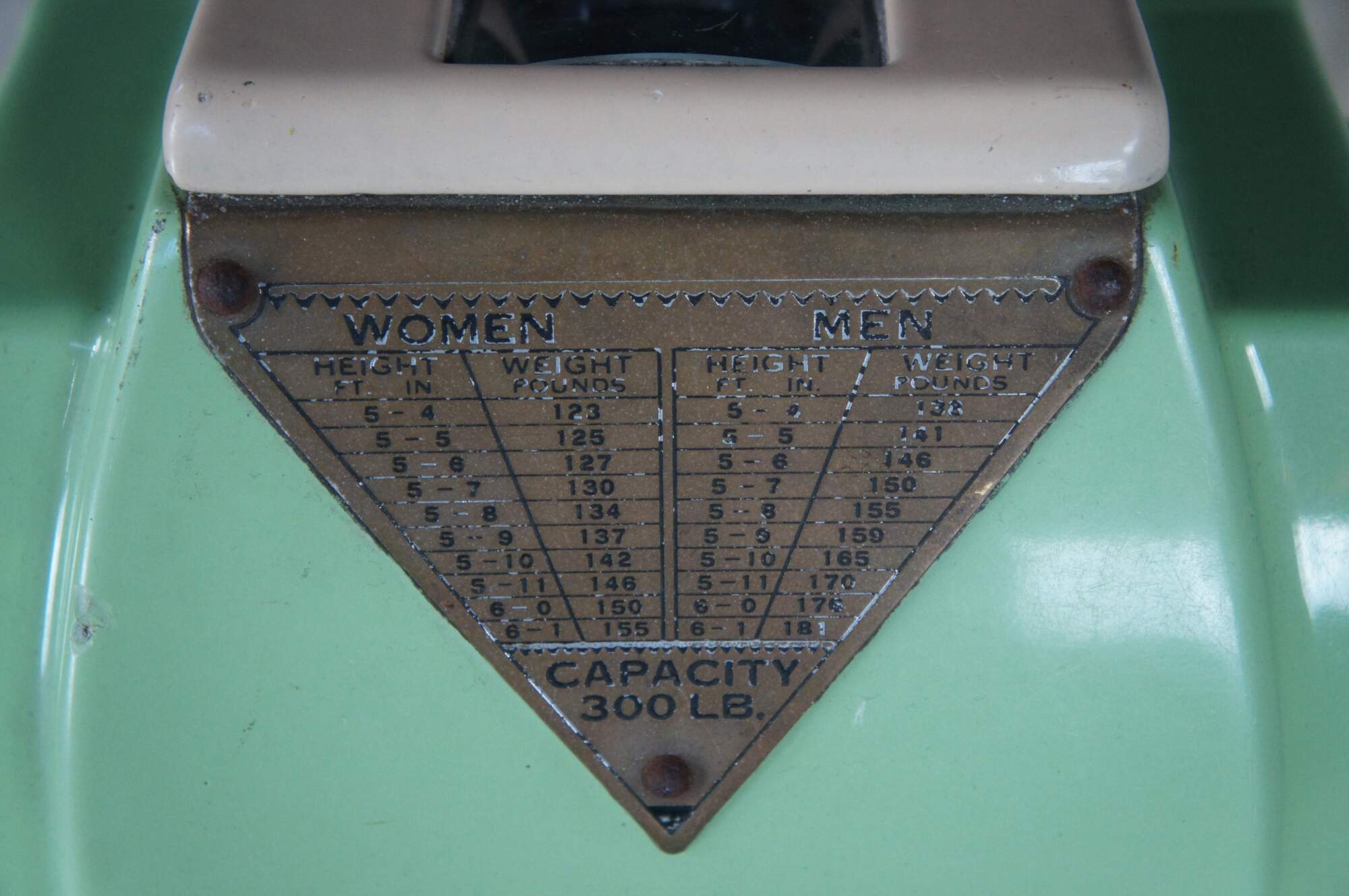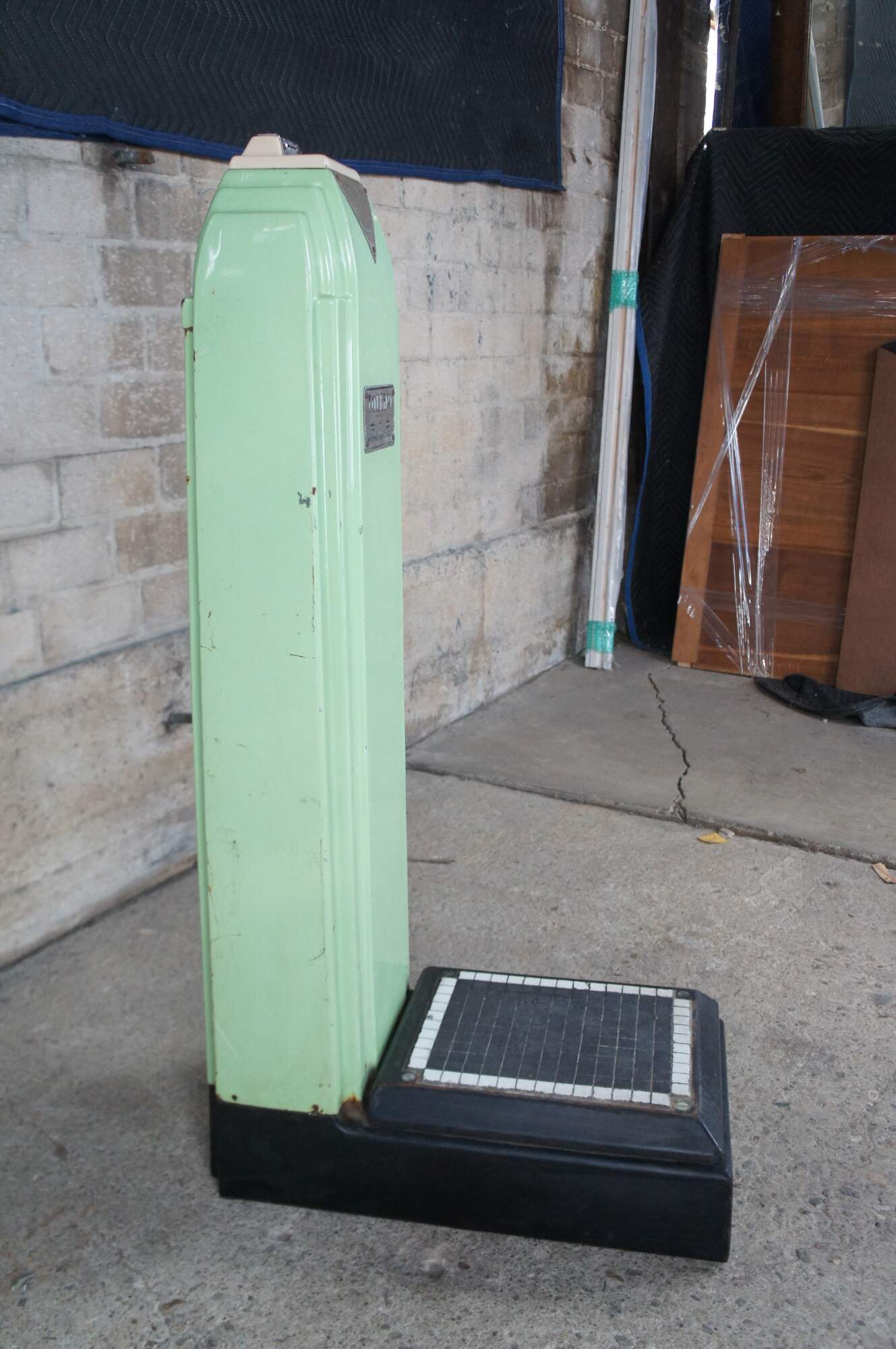 Toledo Scale Company Model 8400A. Features an enameled green porcelain finish and tiled station. Features the iconic Art Deco Skyscraper design with a glass readout along the top.