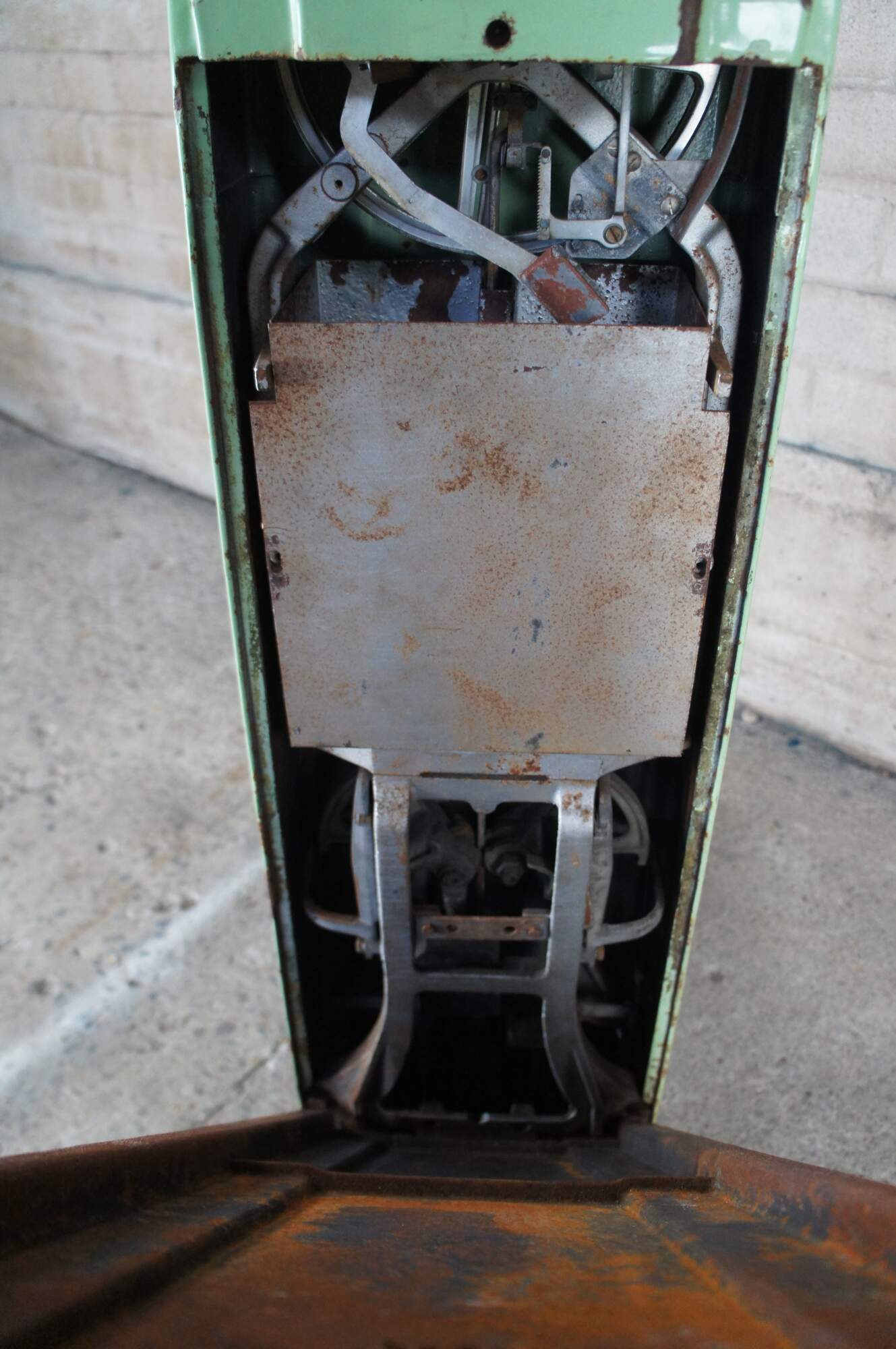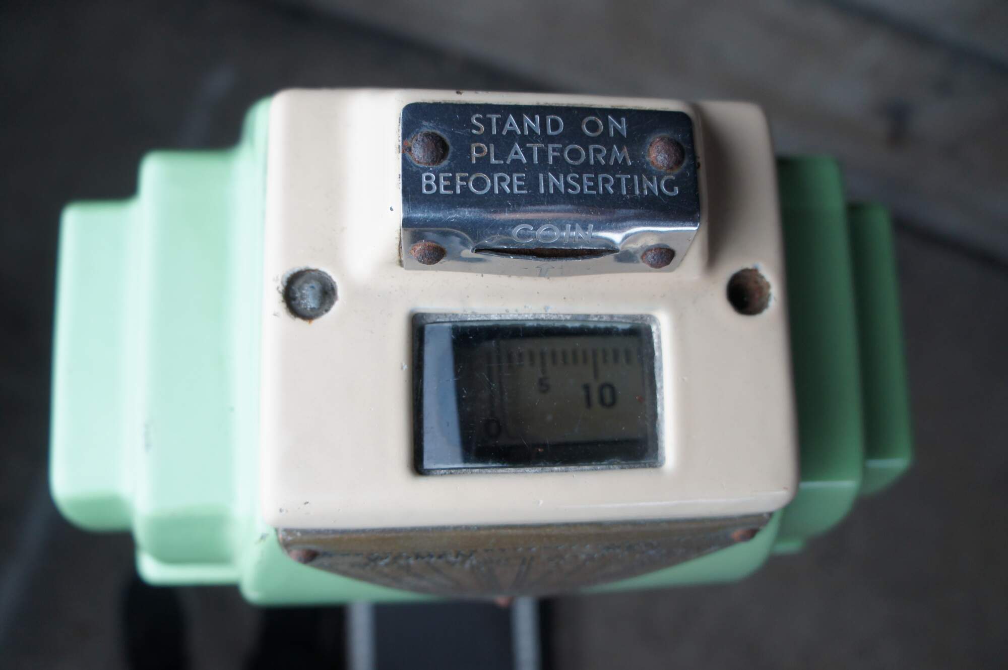 Good Antique Condition; General use related wear. Marking to case/ pitting. the scale currently functions without the use of coins. If you use a coin it will drop into the coin slot as it should. No KEy.