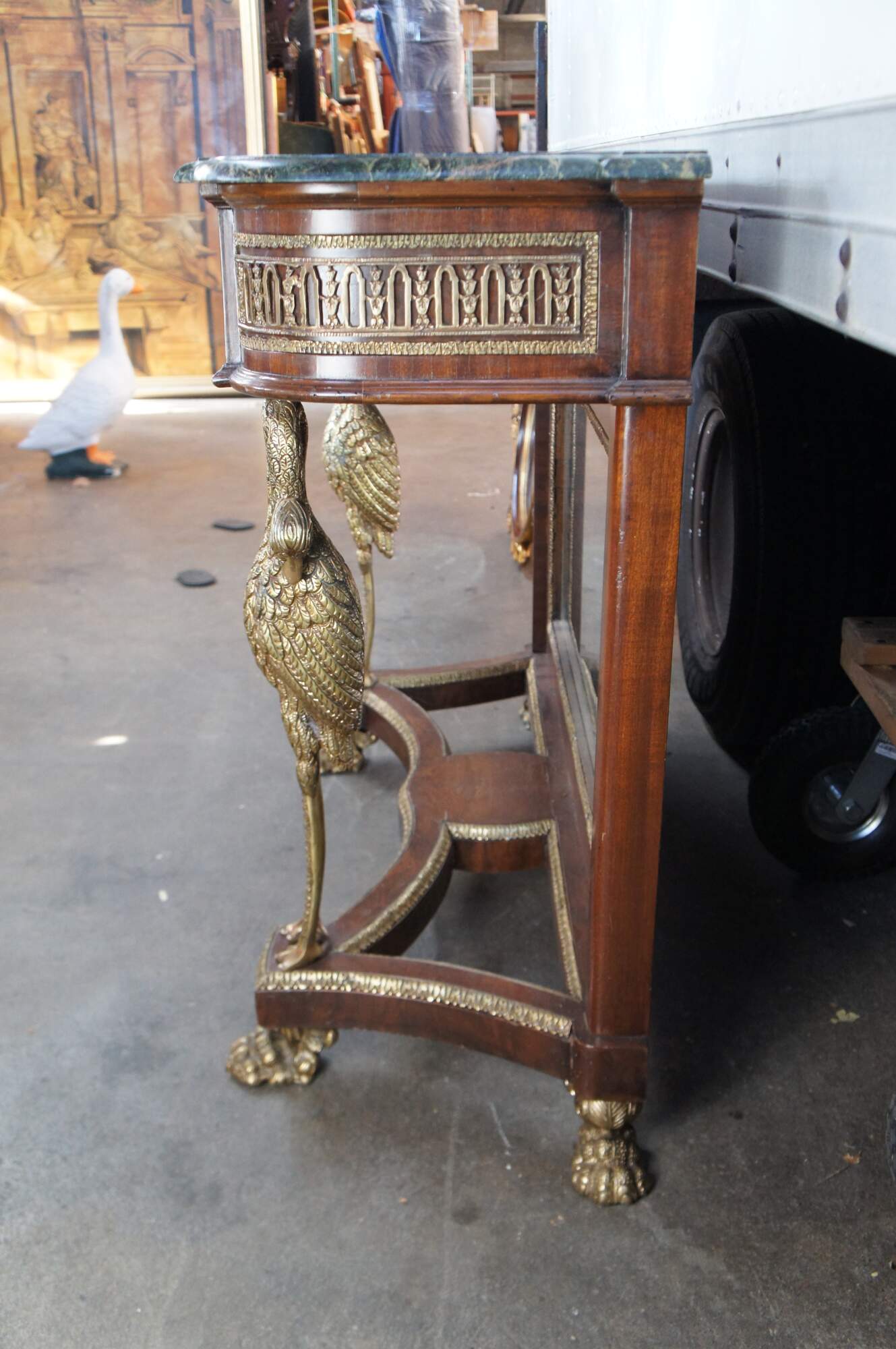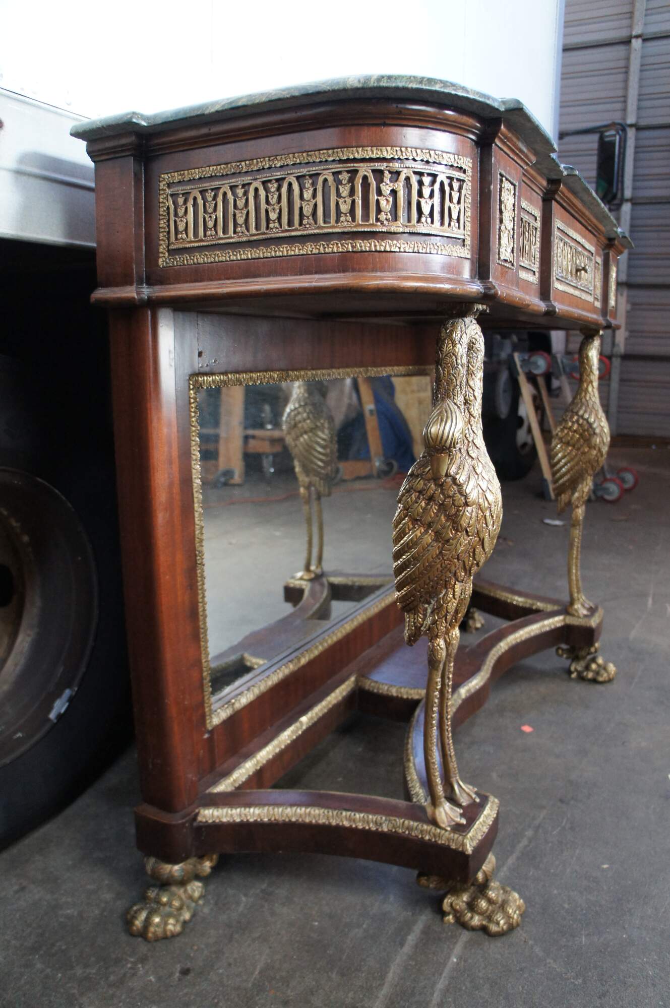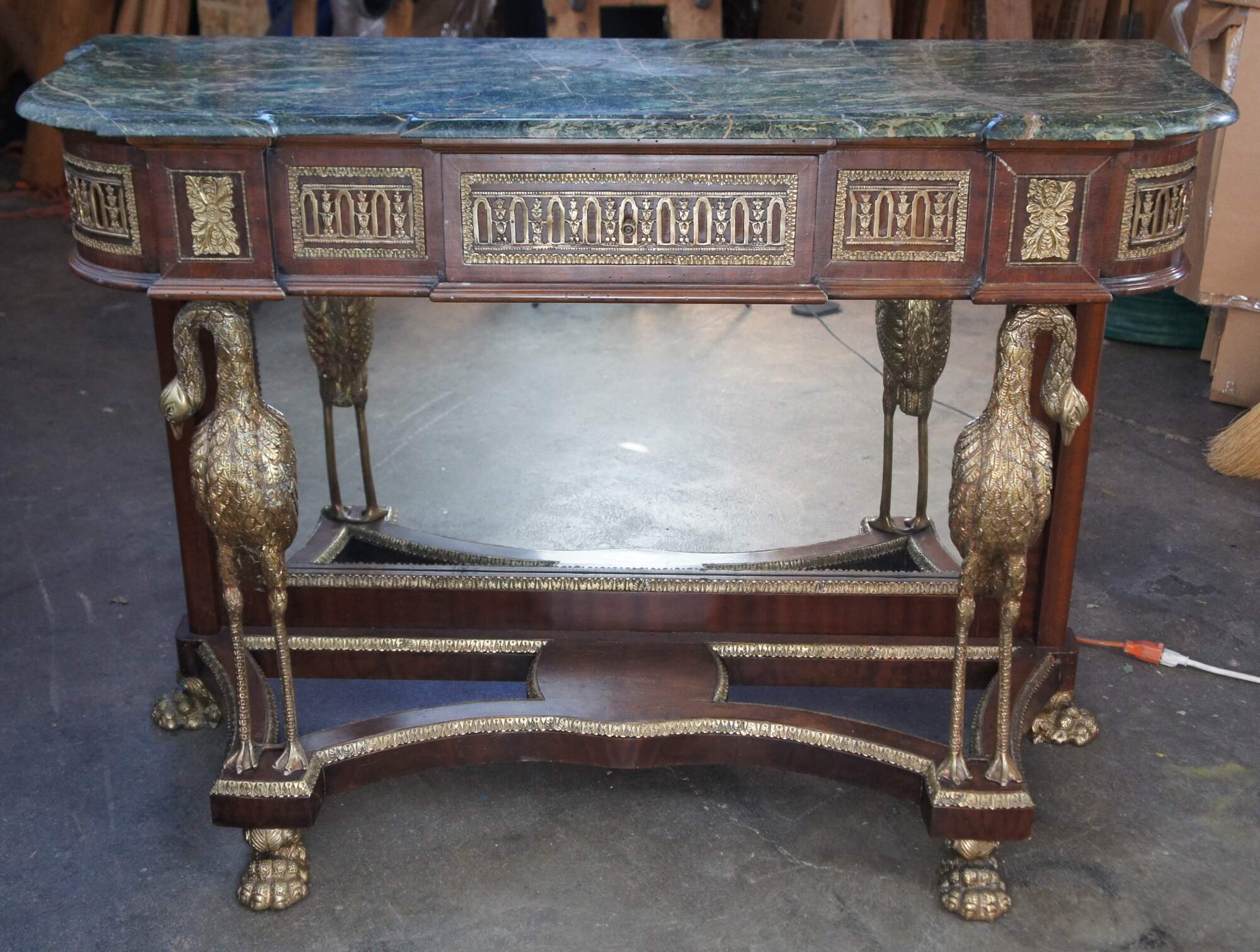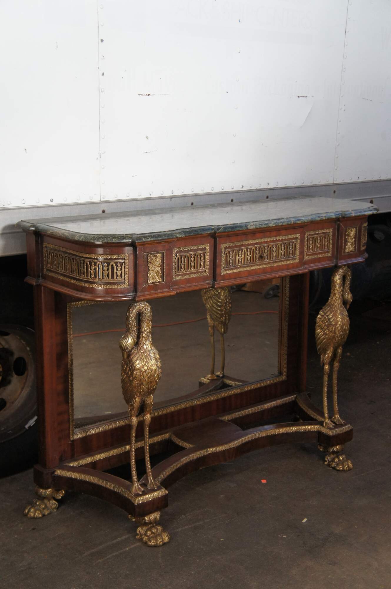 An exquisite French Empire / Napoleon III style mirrored Pier Table, circa 1980s. Made from mahogany and bronze ormolu with a green marble top. The table showcases two figural swan supports along the front over an open base with intricate paw feet. Includes acanthus trim throughout and French medallions. There is a drawer in the frieze at the center for storage. Great for use as a sideboard, buffet, server TV stand, hall console or entry table.