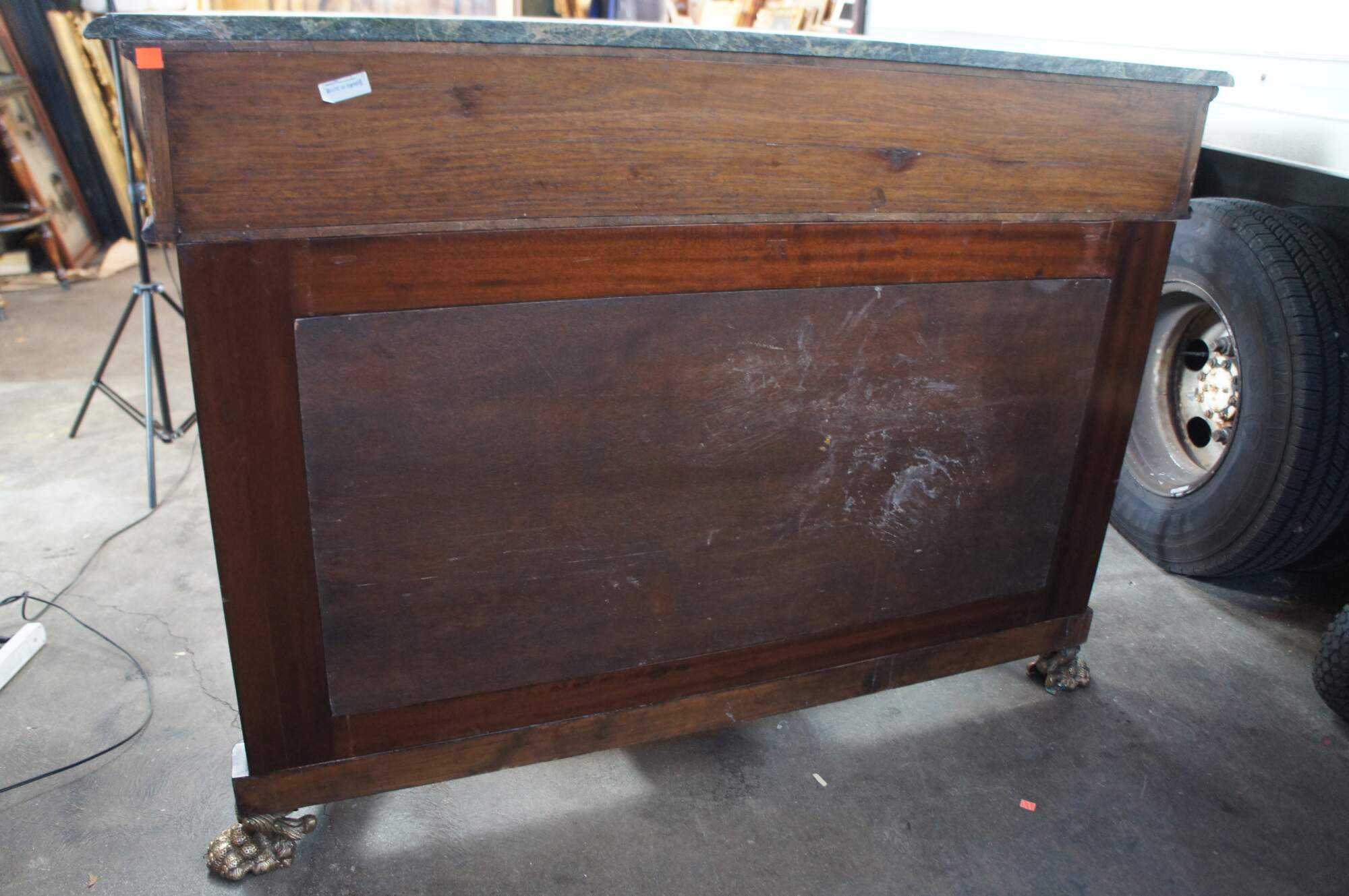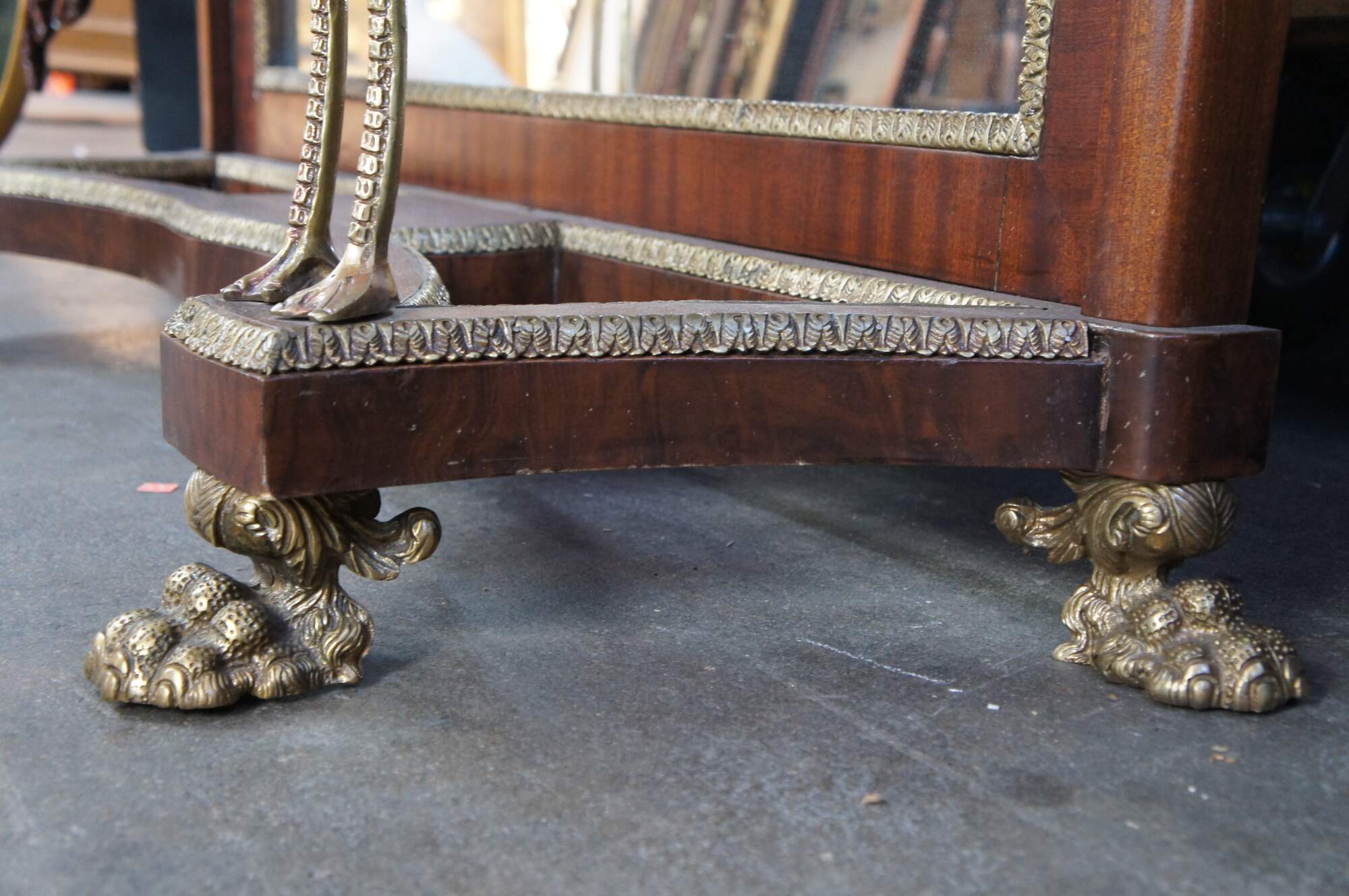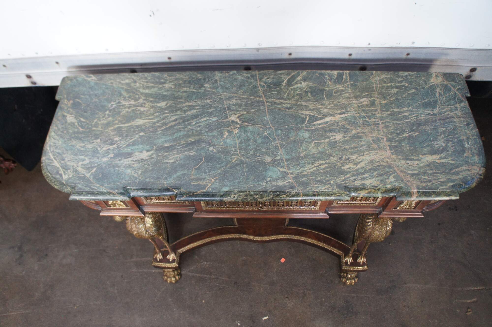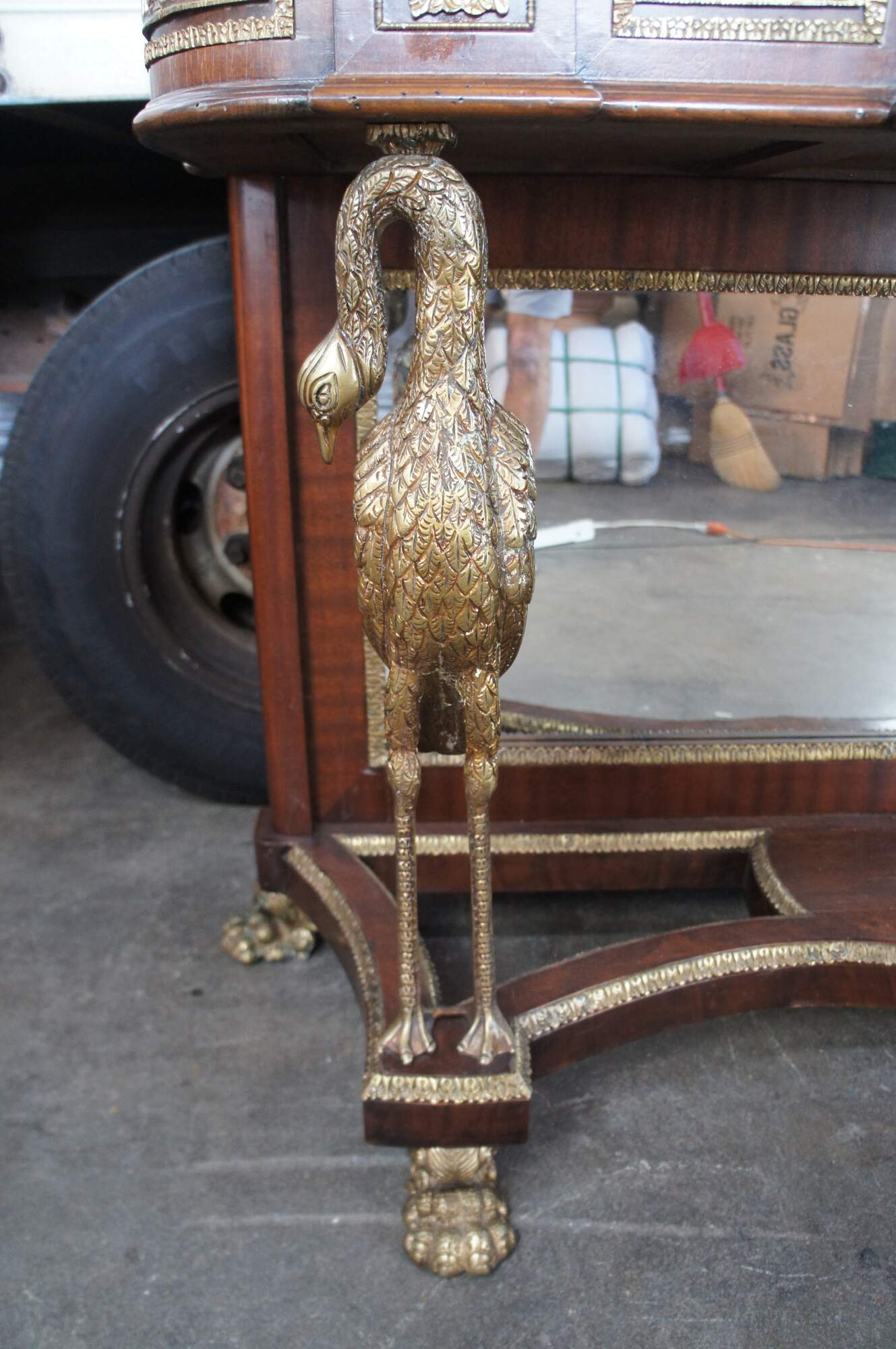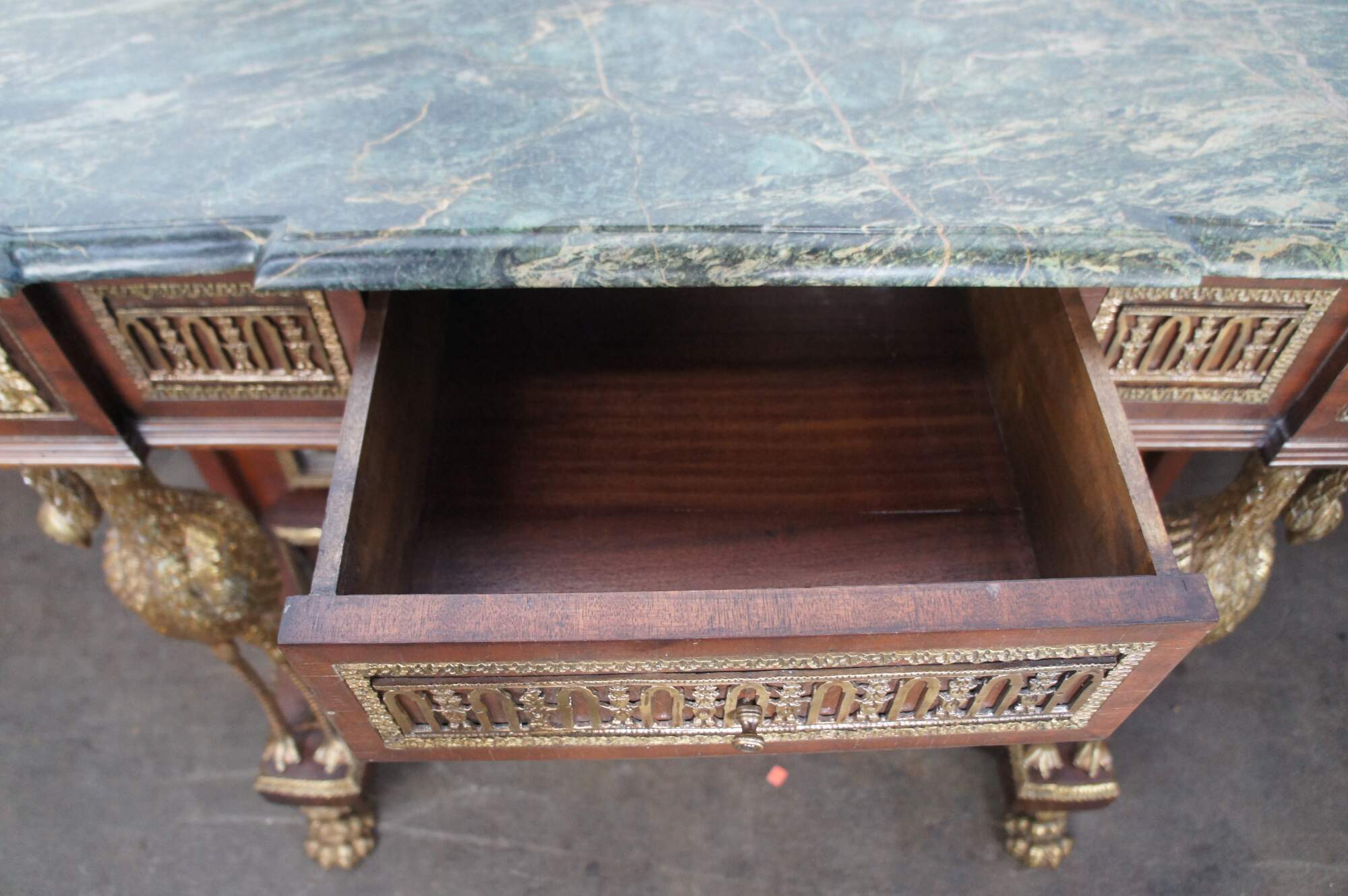 An exquisite French Empire / Napoleon III style mirrored Pier Table, circa 1980s. Made from mahogany and bronze ormolu with a green marble top. The table showcases two figural swan supports along the front over an open base with intricate paw feet. Includes acanthus trim throughout and French medallions. There is a drawer in the frieze at the center for storage. Great for use as a sideboard, buffet, server TV stand, hall console or entry table.