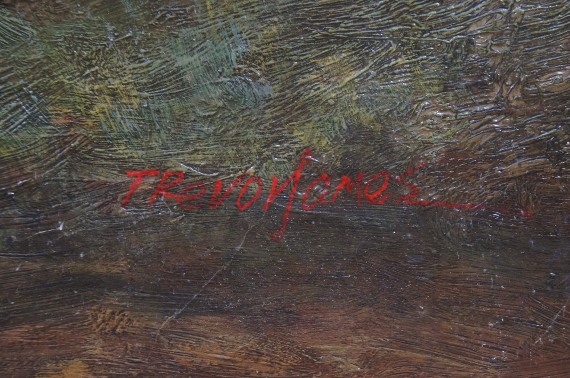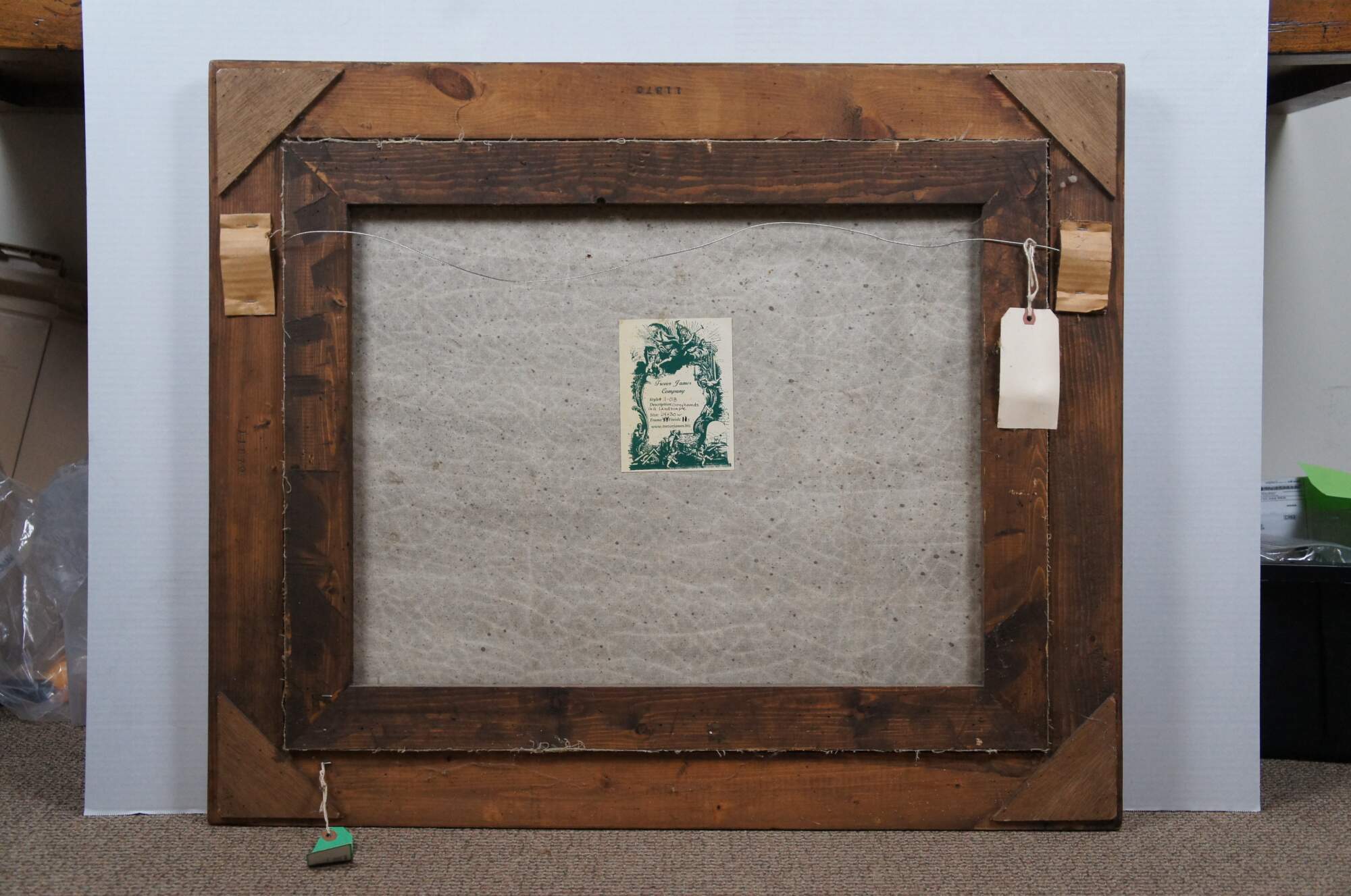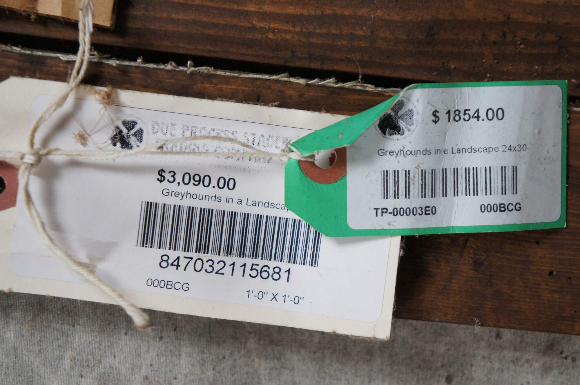 Late 20th century oil painting on canvas after "Greyhounds in a Landscape" by Henri D'Ainecy, Comte de Montpezat. Depicts a pair of greyhounds in a simple hilly landscape. Reproduced by the Trevor James Company. Dark wood frame with gold edges.