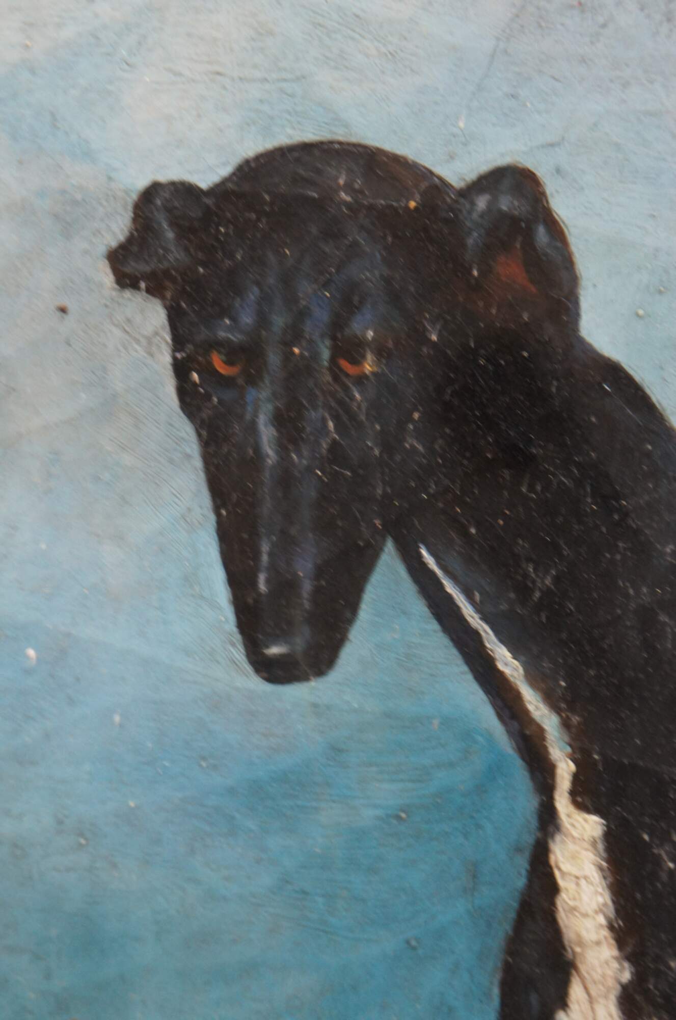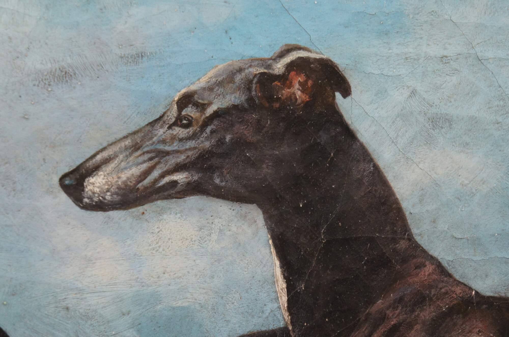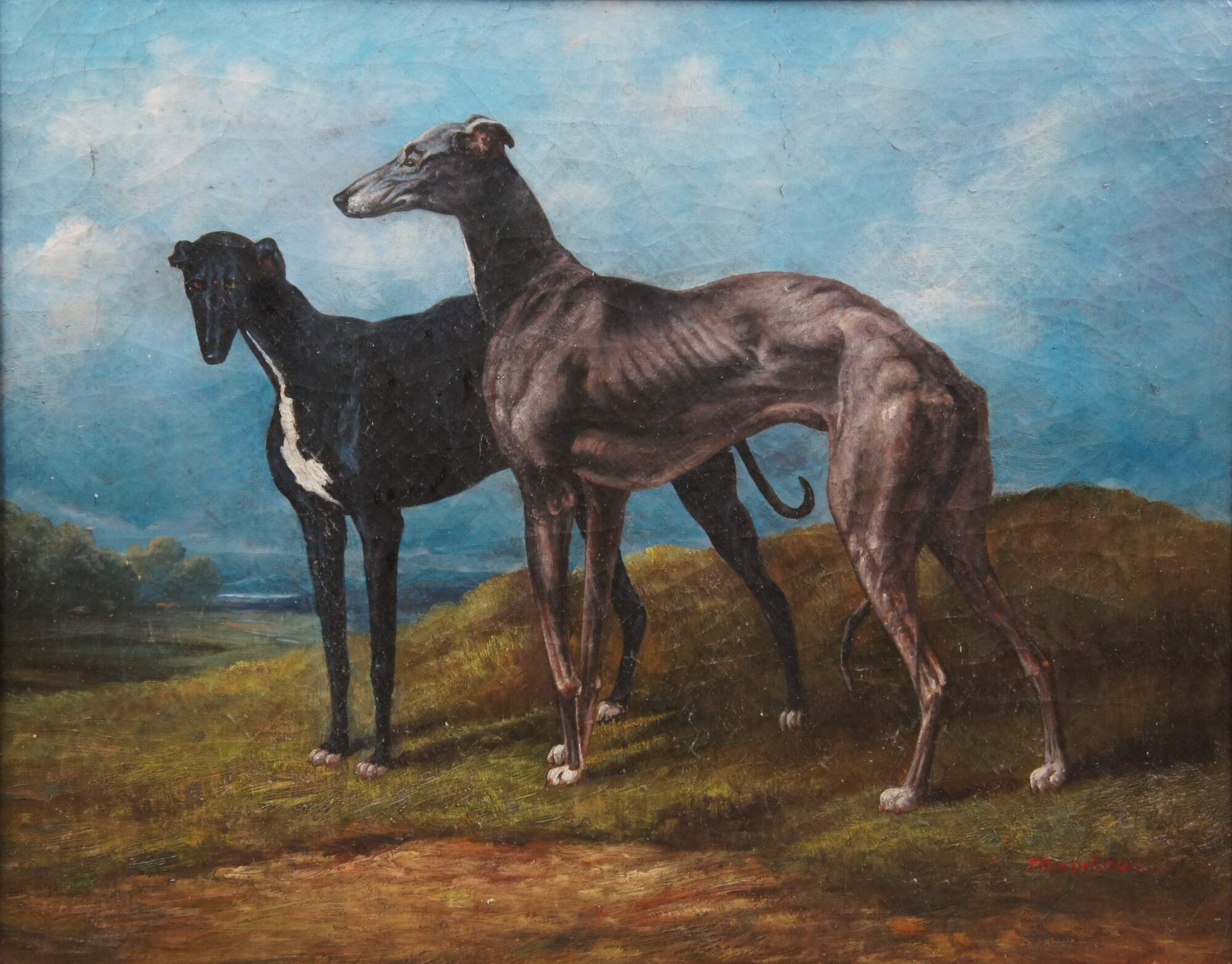 "Greyhounds were the subject of several well-known nineteenth century European painters including Agasse and Courbet. Henri D'Ainecy, Comte de Montpezat specialized in recording the elegant dogs and horses of the Second Empire's aristocrats. D'Ainecy's nonchalant informality of the poses adds to their natural hauteur. He depicts the greyhounds as streamlined abstractions emphasizing the perfection of their silhouettes and tight-skinned bodies. The greyhound has been used predominantly for hunting and coursing the hare until the Victorian era. It was during the early part of the nineteen century that the sport of coursing made great strides. The pedigrees of the most celebrated greyhounds were recorded with as much care as the best bred horses of the turf. With the industrial revolution of the nineteenth century, many new and wealthy individuals moved to the country, eager to establish themselves and align their names with the older families and to find appropriate diversions for themselves. The membership of the many coursing clubs in England increased dramatically during this time and the sport became extremely popular. While the greyhound had been depicted in art before the advent of coursing events, it was in the nineteenth century that pride of ownership prompted owners to have portraits of their individual dogs painted. Greyhounds are often painted in pairs as the rules of coursing dictated that they hunt in this way. D'Ainecy's painting follows in the strong French tradition of dog painting which flourished in the eighteenth century with Jean-Baptiste Oudry (1725-1805) and Alexandre-François Desportes (1661-1743). The present work is possibly inspired in composition by Oudry's Missi and Turlen, Two Greyhounds Belonging to Louis XV (1725) which shows two of the King's favorite greyhounds. They were displayed at Versailles in 1726 and the painting is a very matter-of-fact yet elegant portrayal of two dogs in a landscape. D'Ainecy's work is rare in the wider context of French animal painting in the nineteenth century for its focus on the animals belonging to aristocrats where fellow artists looked not to the values of the eighteenth century, but towards the new outlook engendered by the revolution and tended to depict instead realistically portrayed dogs in the context of everyday life."