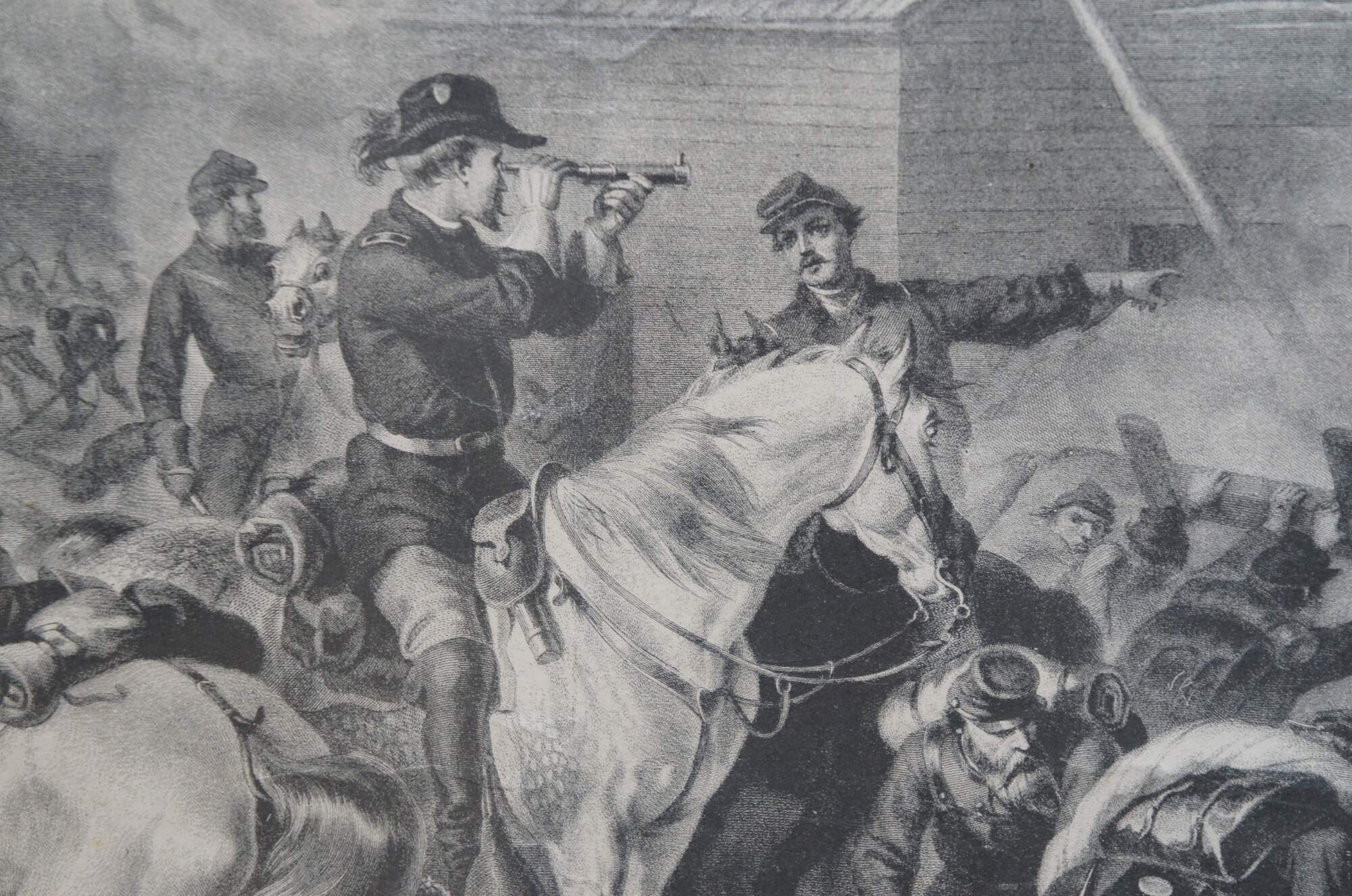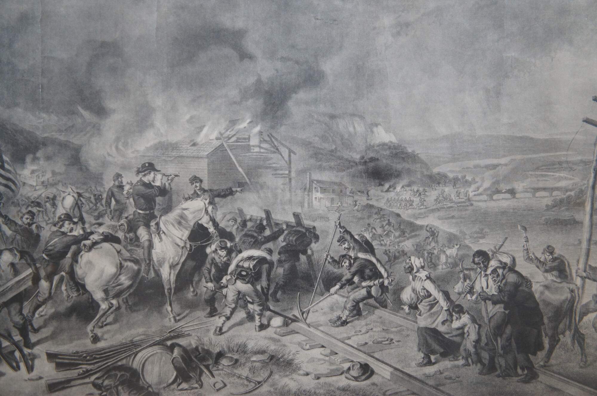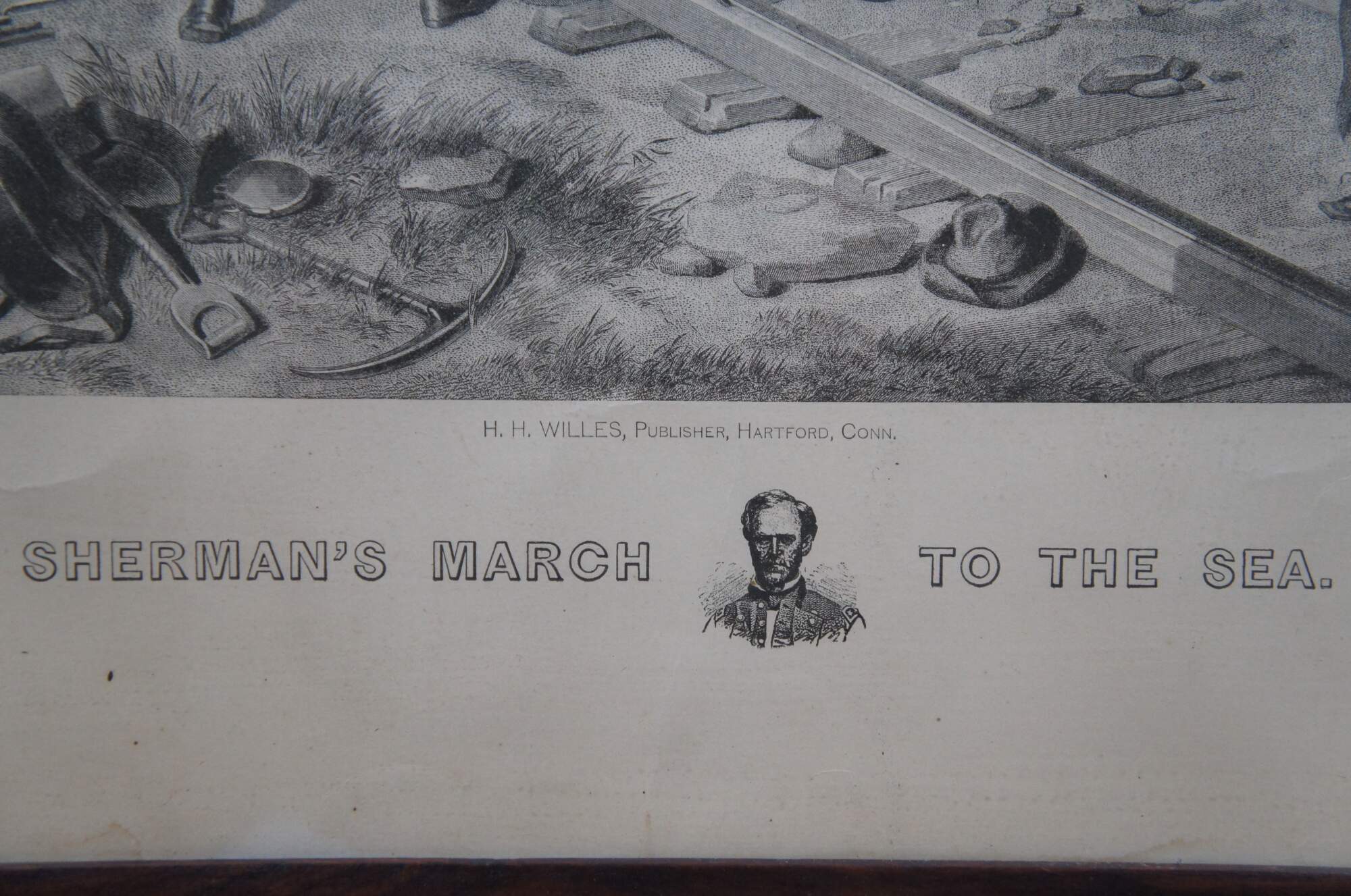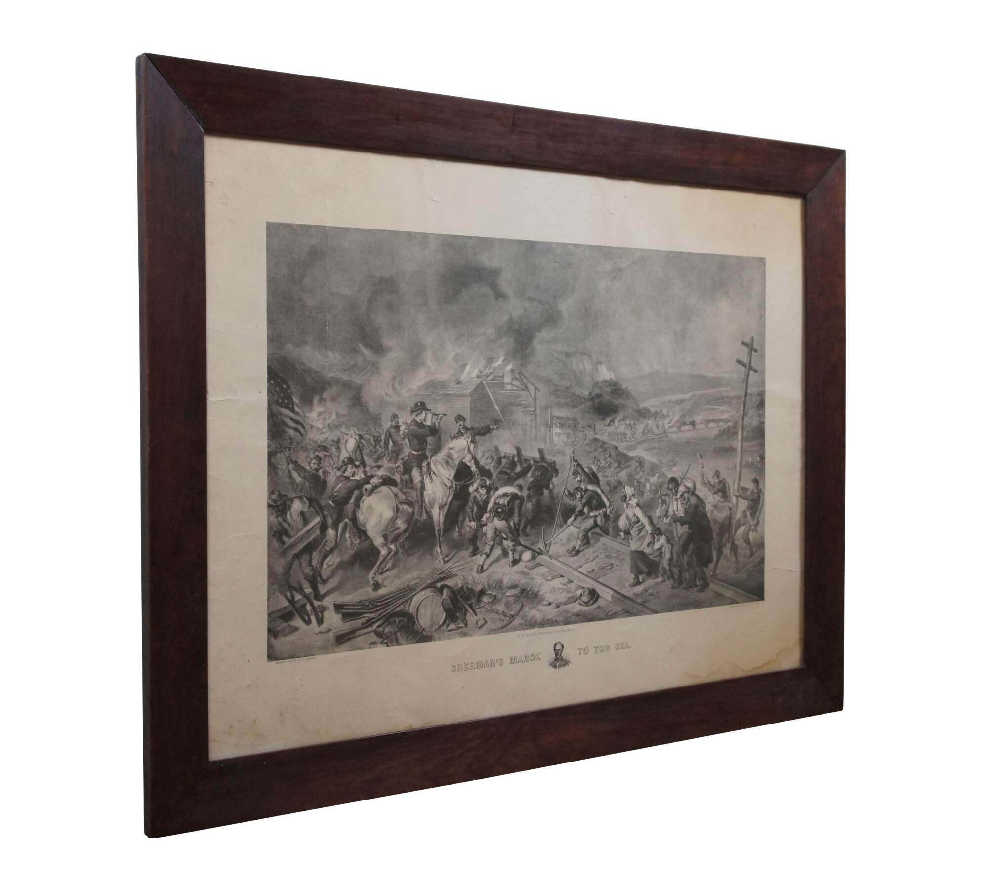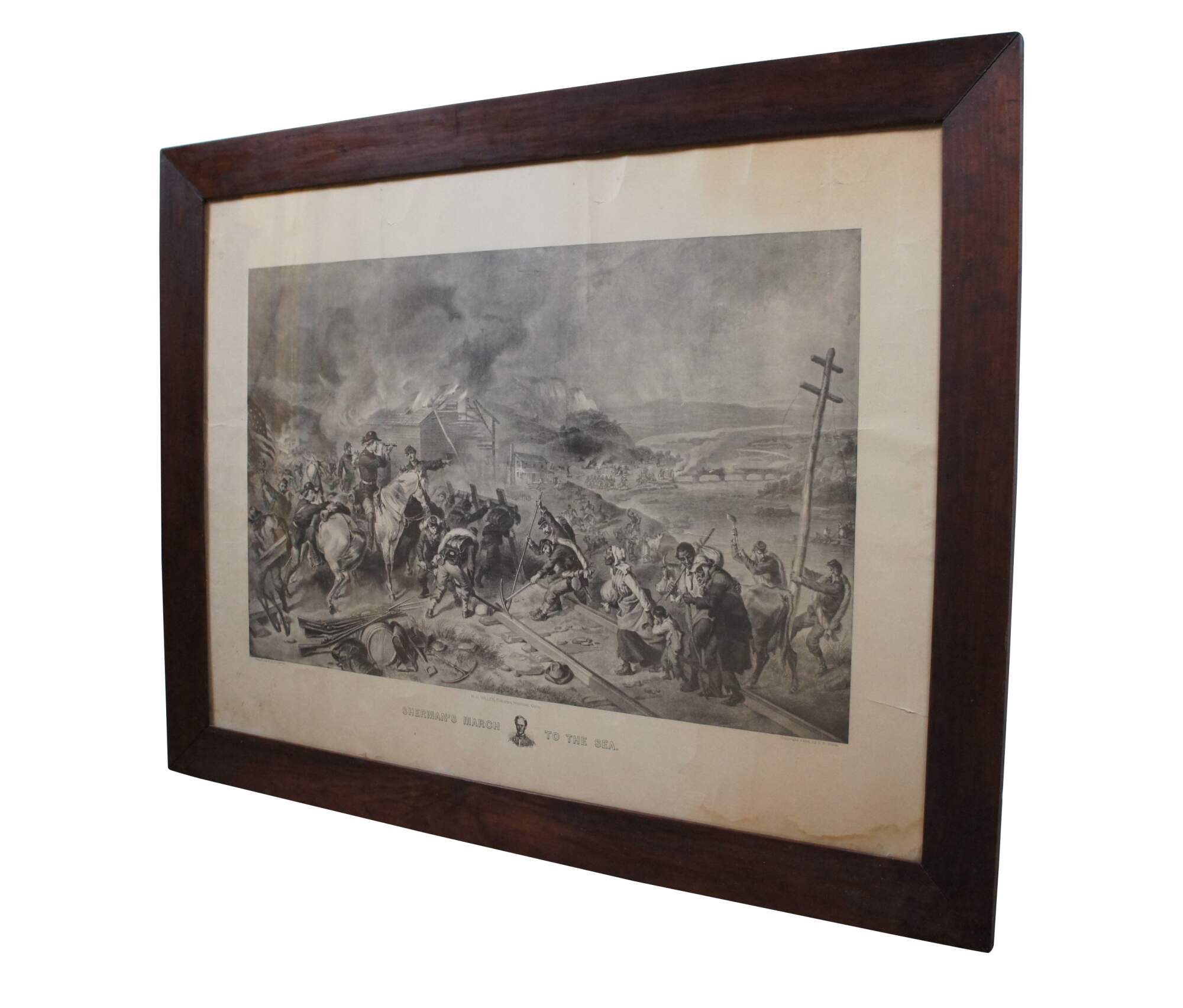 Antique late 19th century engraving of "Sherman's March to the Sea" - Drawn by F.O.C. Darley - Published by H.H. Willes, Hartford, CT - Copyright 1883 by J.P. Fitch. Plain wood frame.