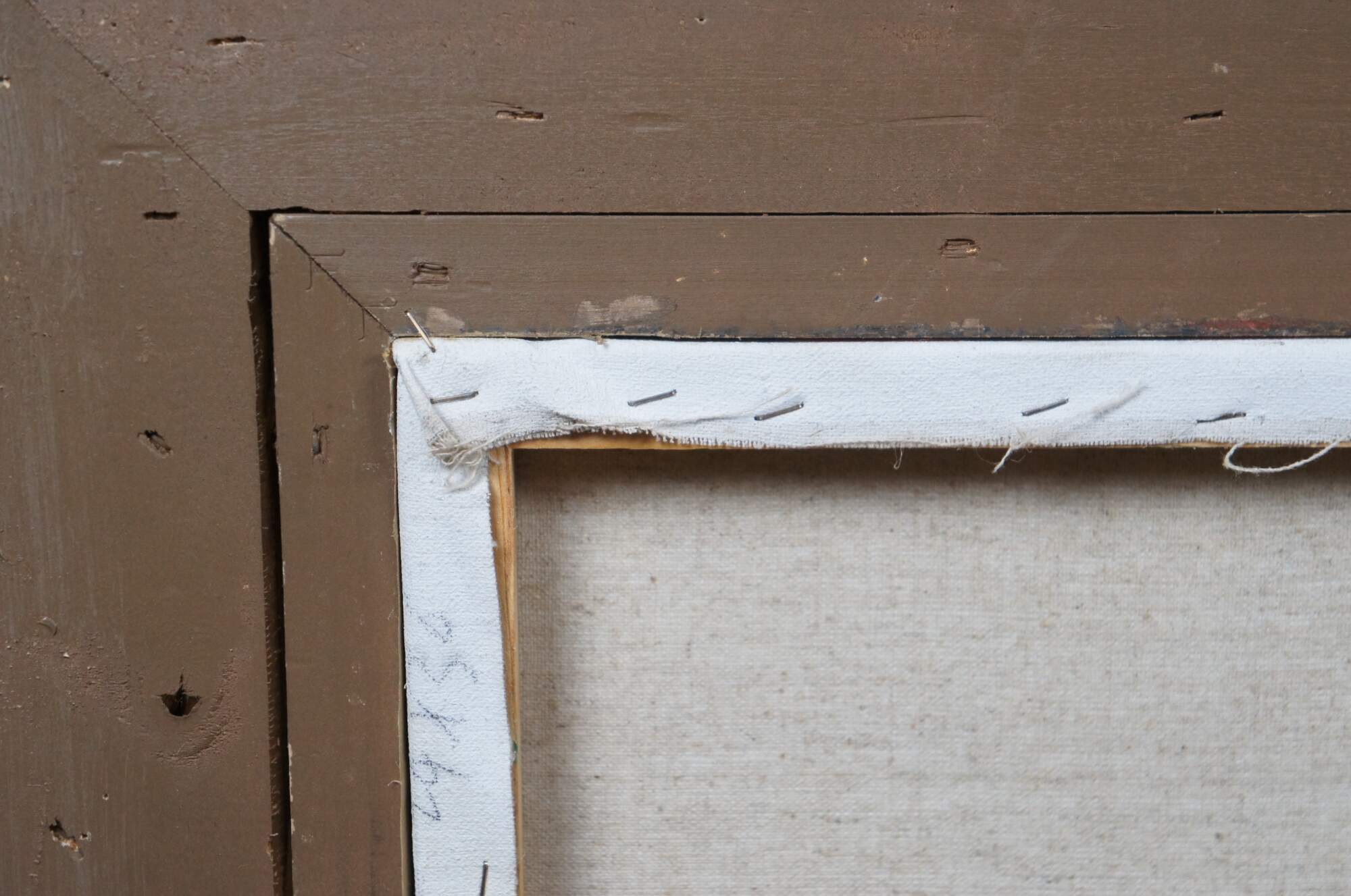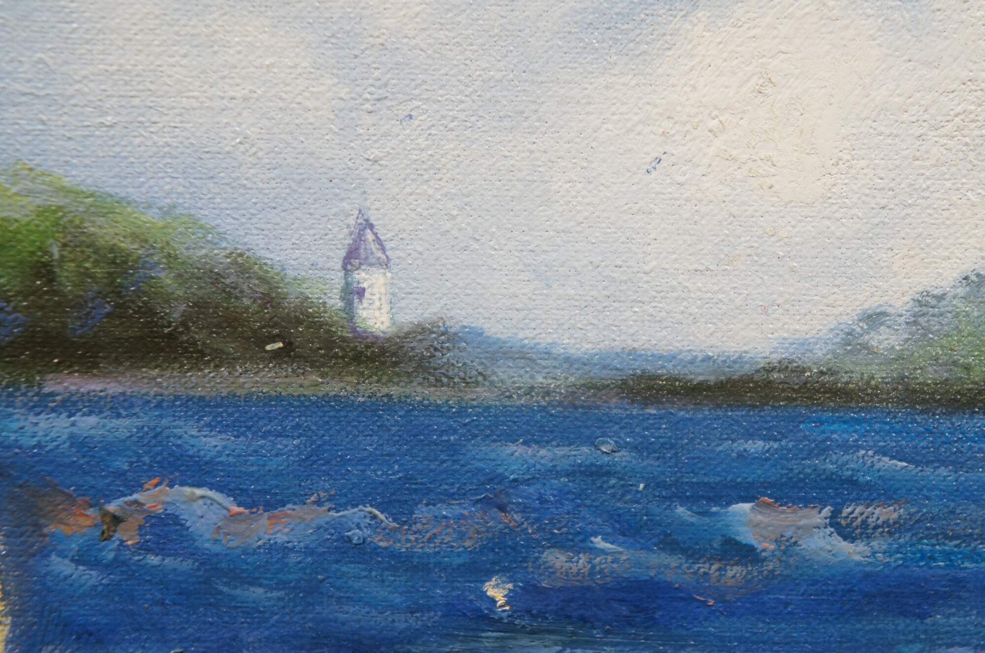 Late 20th century oil painting on canvas depicting a trio of children in late 19th or early 20th century attire, carrying buckets as they wade in the shallows of a coastal Nantucket landscape. A white lighthouse is visible in the diatance. Ornate foliate / scalloped molded resin frame with gold finish.